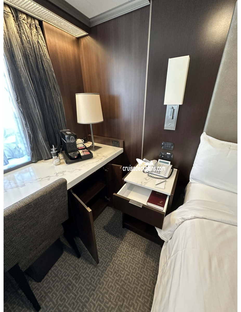 Concierge Service / Priority Check In / Priority Debarkation / Priority Tender Boarding / Afternoon Canapes / Afternoon Tea / Complimentary Shoe Shine / Welcome Champagne / Exclusive Lounge / Exclusive Full Breakfast Restaurant / Priority Dining Reservations / Complimentary Laundry / Thick Cotton Robes / Pillow Menu / Signature Mariner's Dream bed with plush euro-top mattress and finely woven cotton linens / Lighted magnifying mirrors / Massage showerheads / Salon-quality hair dryer / Elemis Aromapure bath products / Flat-panel TV and DVD player / complimentary DVD library / Personalized cruise stationary / Umbrella & binocular usage / Gorgeous corsages and boutonnieres for the first formal night / Cocktail party with ship's officers / Premium duvet / Complimentary bottled water at embarkation / Bose docking station / Complimentary mimosas with in-suite breakfast / In-suite coffee maker and espresso machine. /