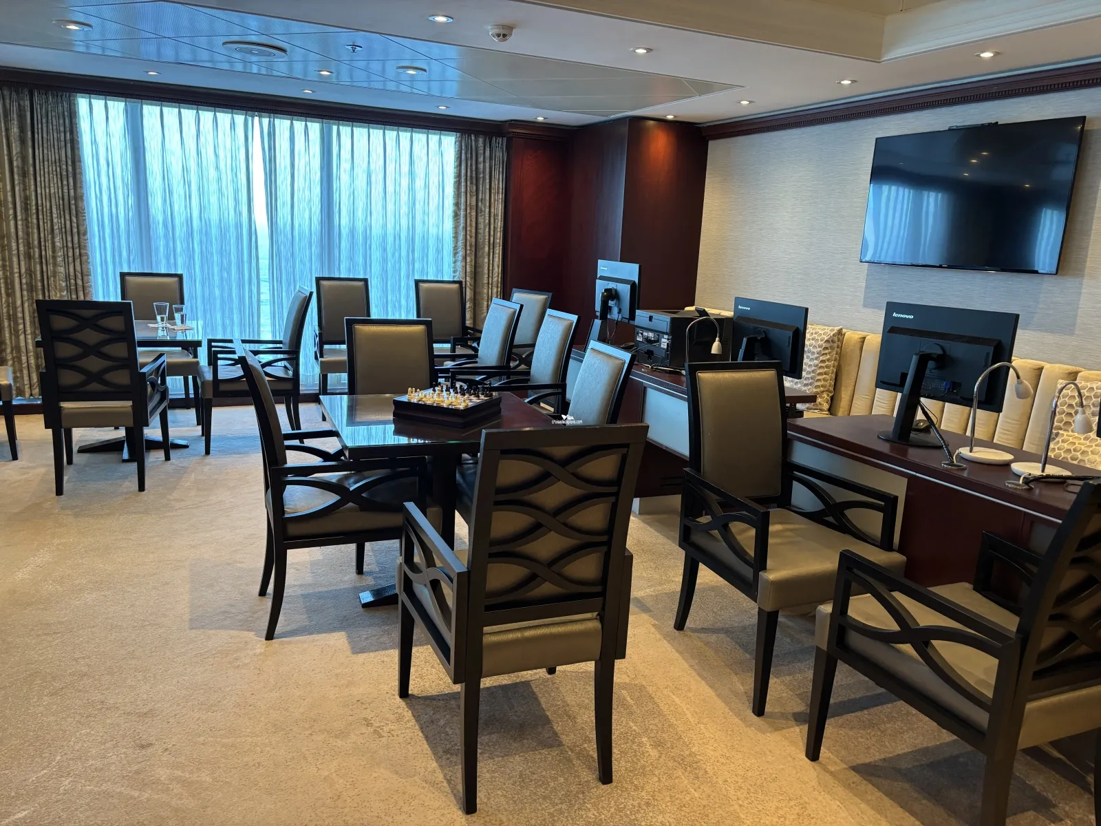 The ships library that has wood paneling and a marble fireplace. Couches and chairs for seating, books are available in different languages, there are board games and puzzles.The Living Room
