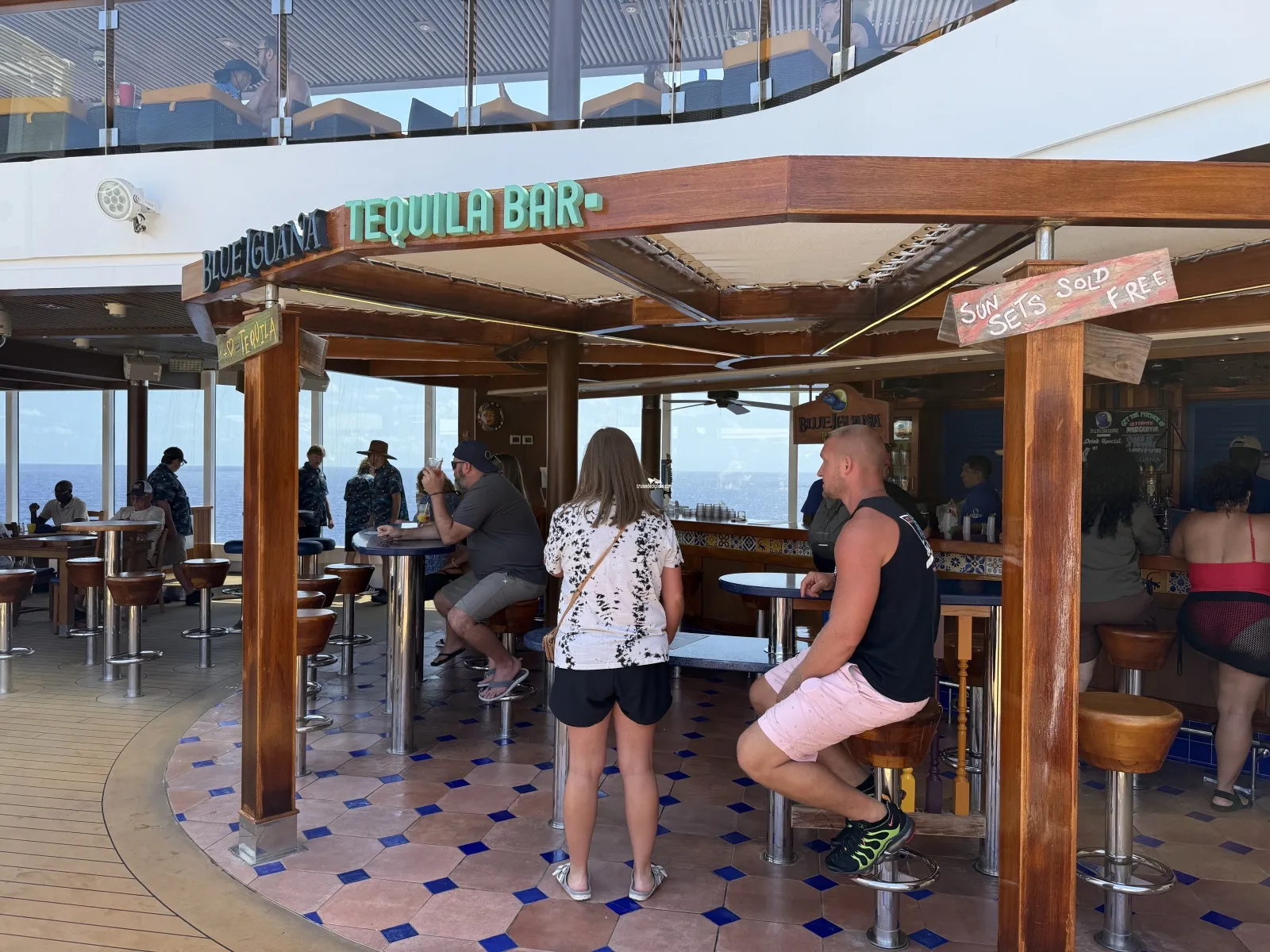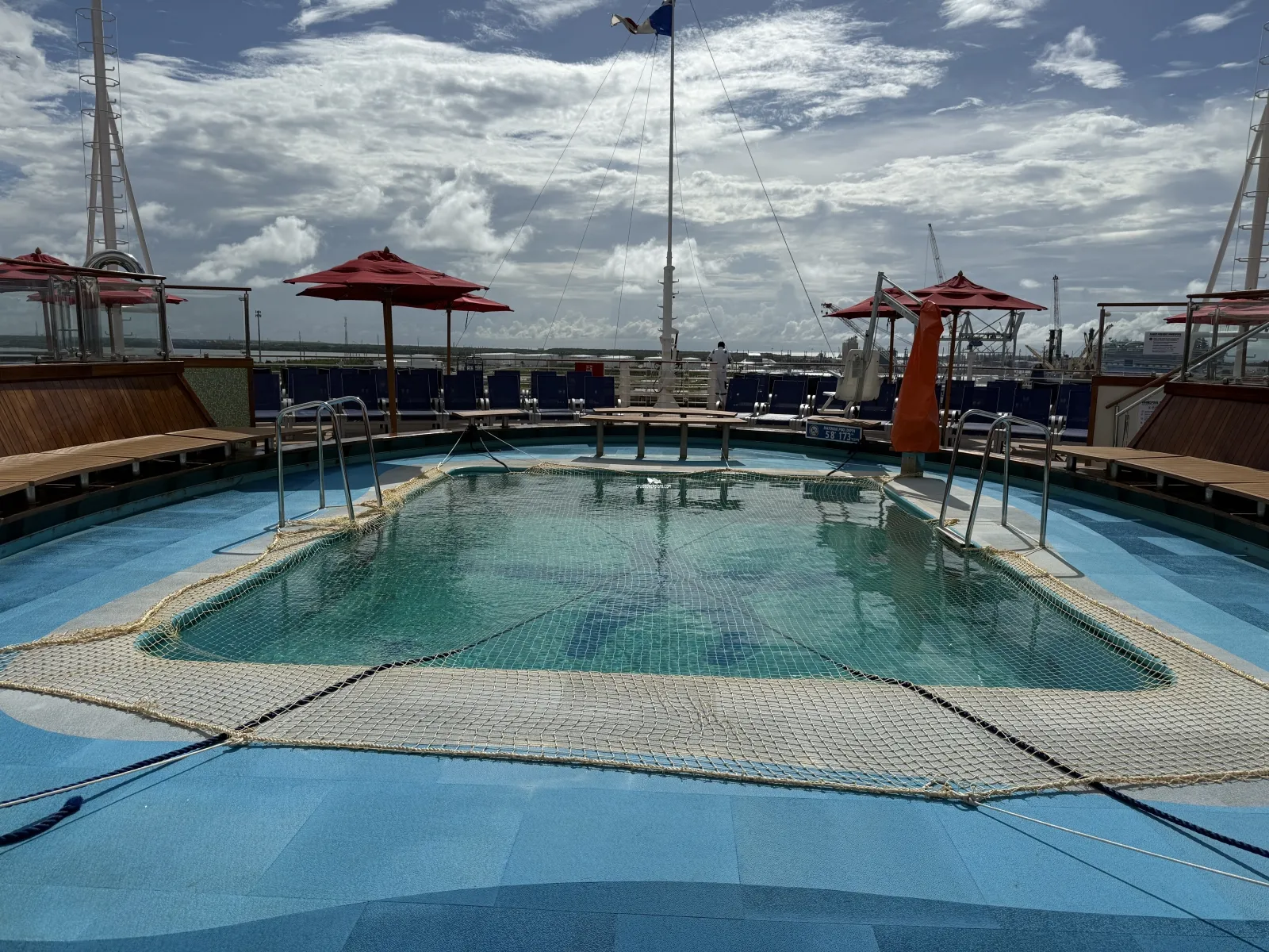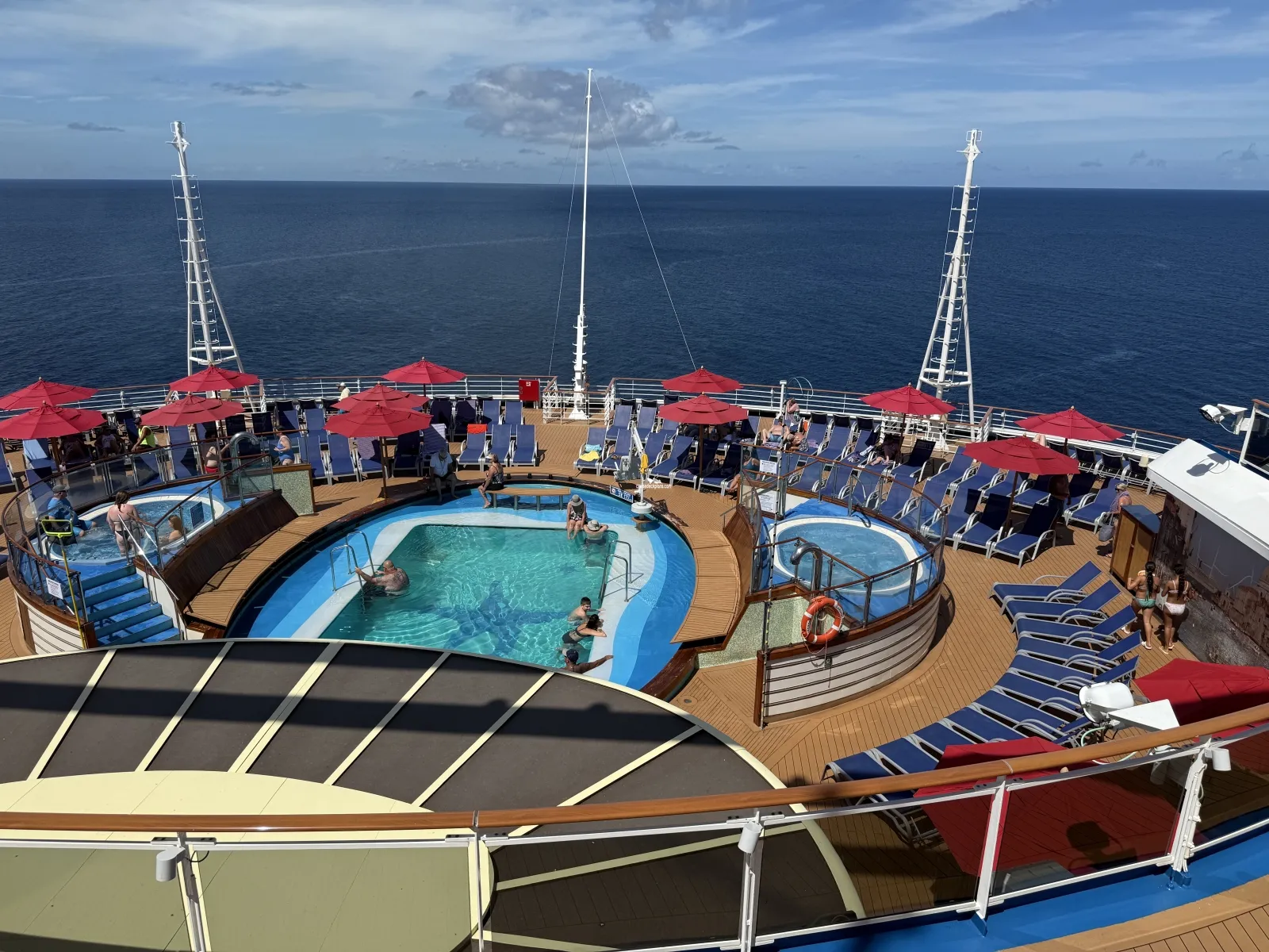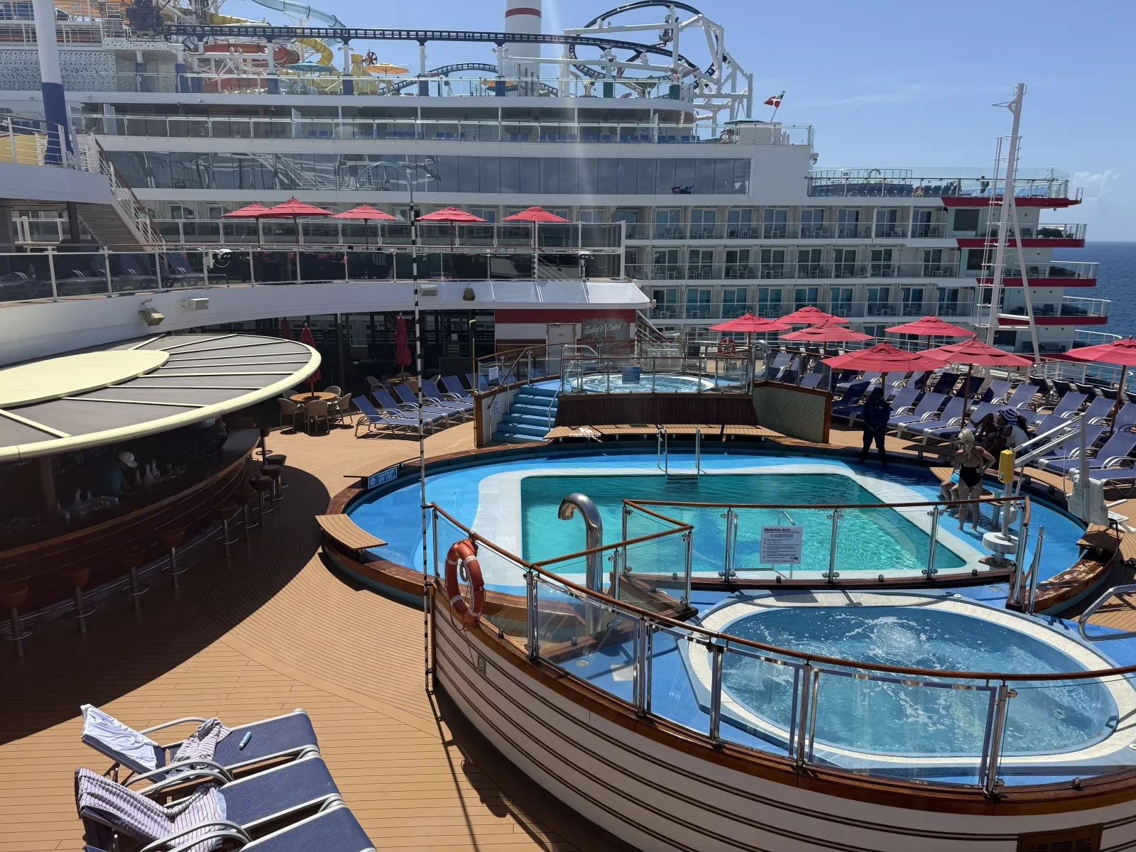 Aft outdoor open-air pool and two whirlpools. Saltwater pool that is 21 feet by 16 feet and 4 feet 6 inch deep. Lounge chairs and umbrellas. There is a bar.Lido Marketplace