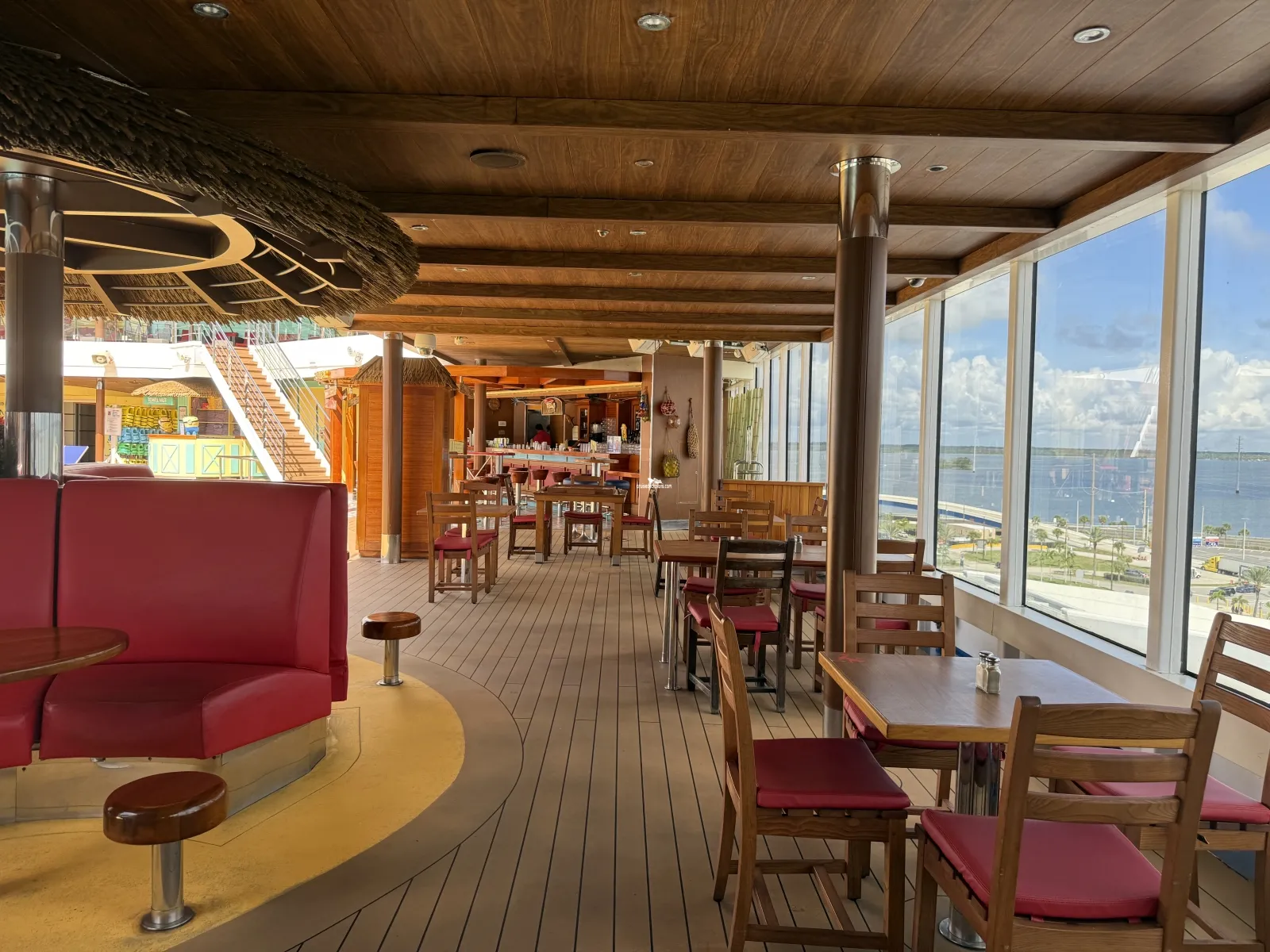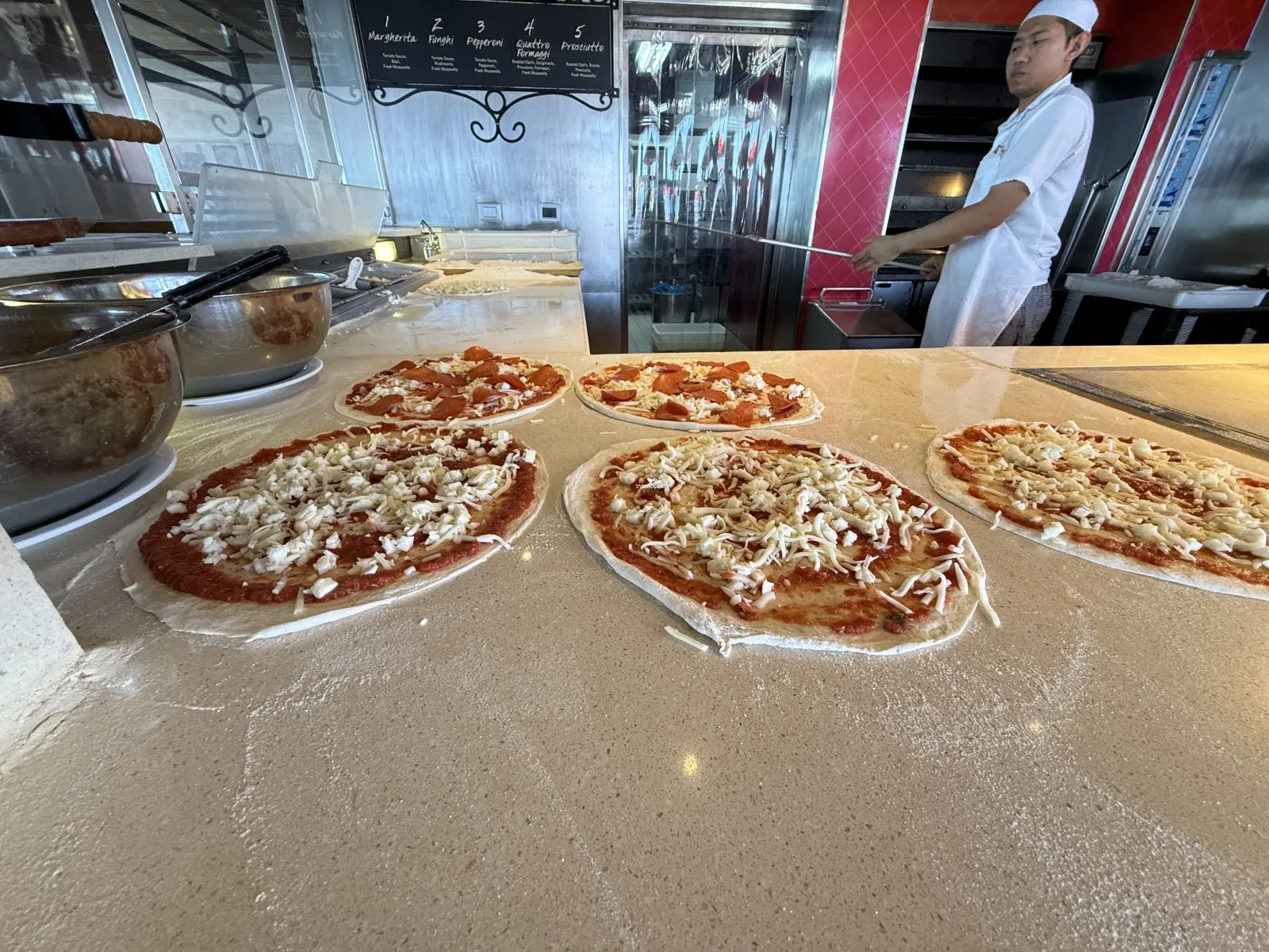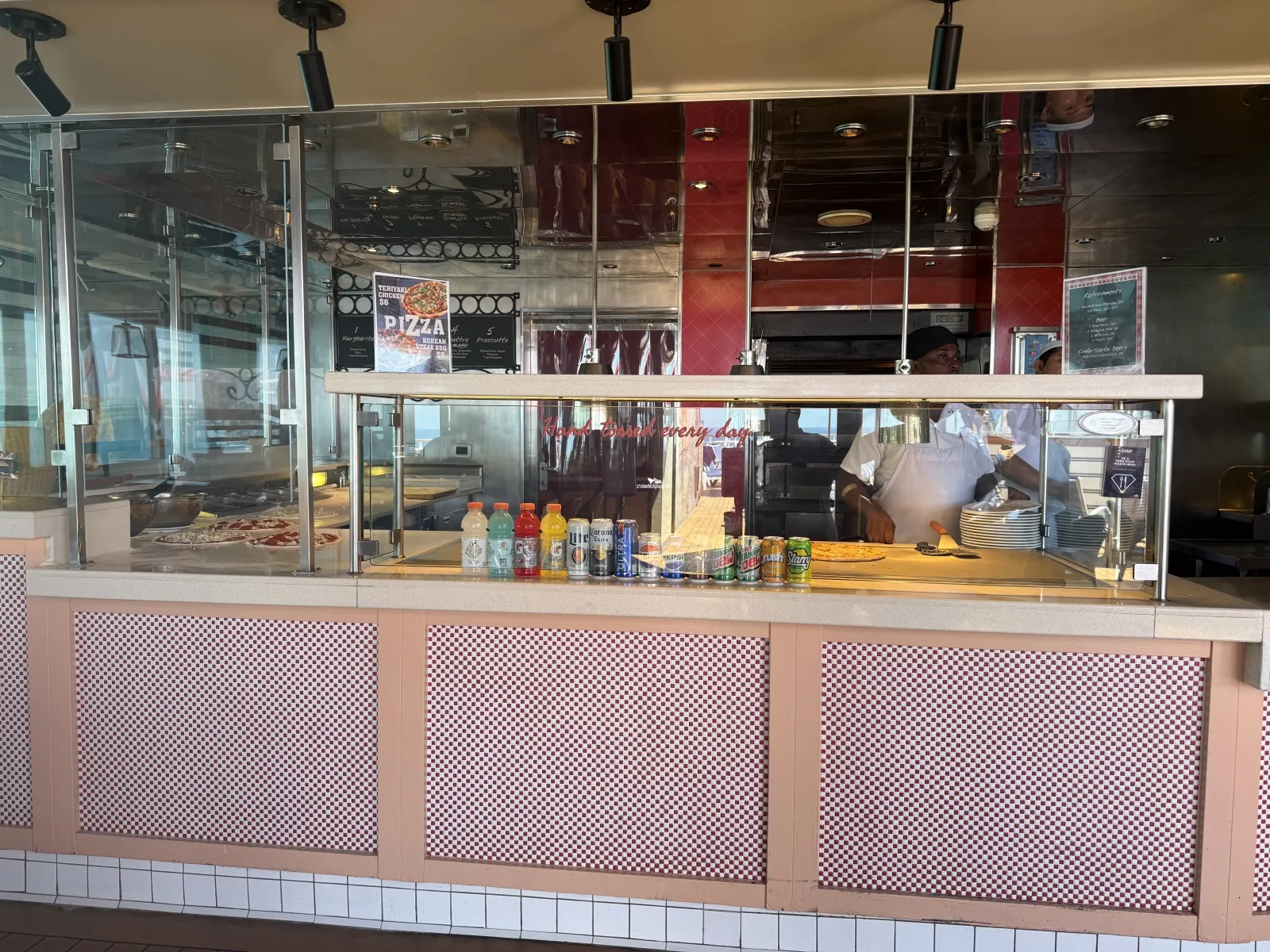 Serves pizza 24 hours a day. Self-service featuring complimentary, delicious, hand-tossed, authentic Italian-style, thin-crusted pies made in a traditional pizza oven. There are dedicated tables and seating.RedFrog Rum Bar
