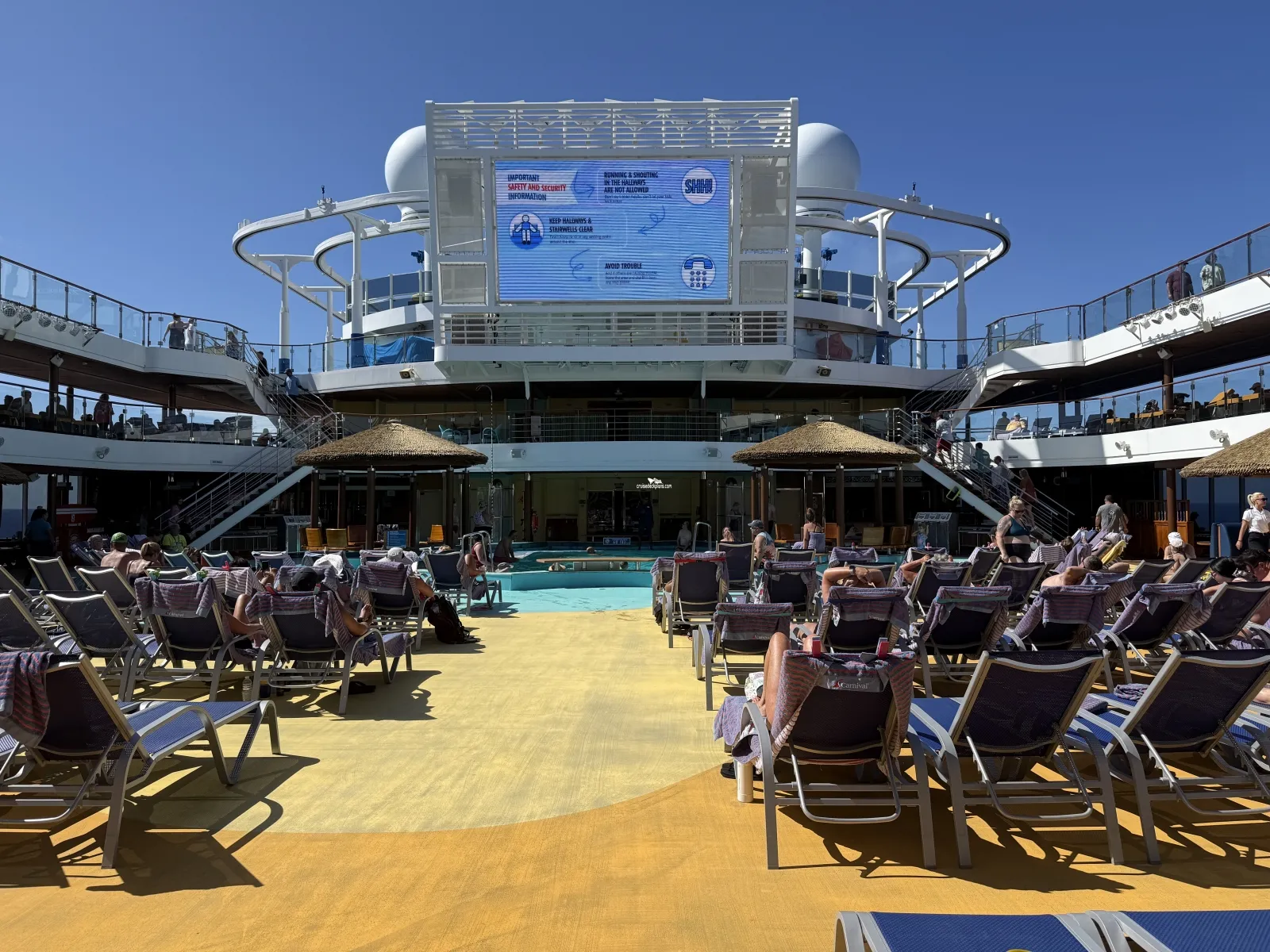 Located midship on deck 10 to 12. Large 12 foot by 22 foot LED outdoor TV screen. During evening hours blankets and popcorn is provided to watch Dive-In Movies.Cabin Check Tool