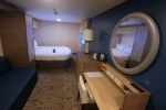* Forward facing oceanview cabins have large porthole window that looks out over bow of ship.