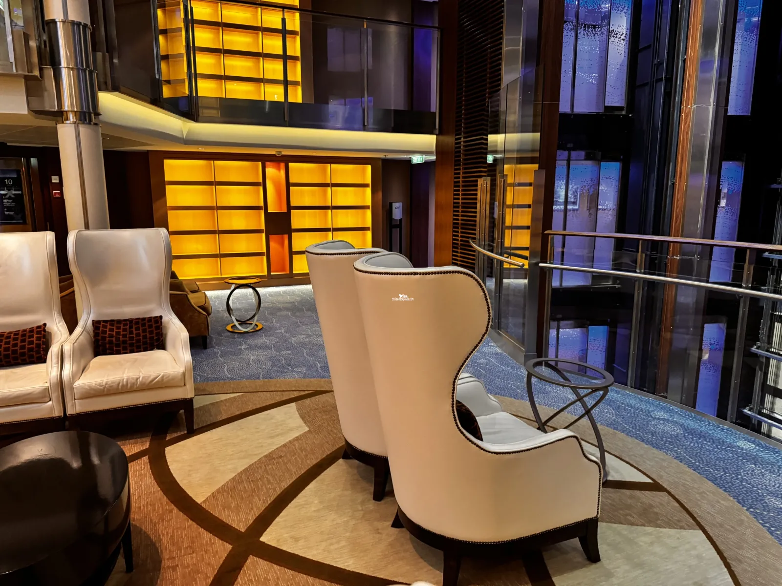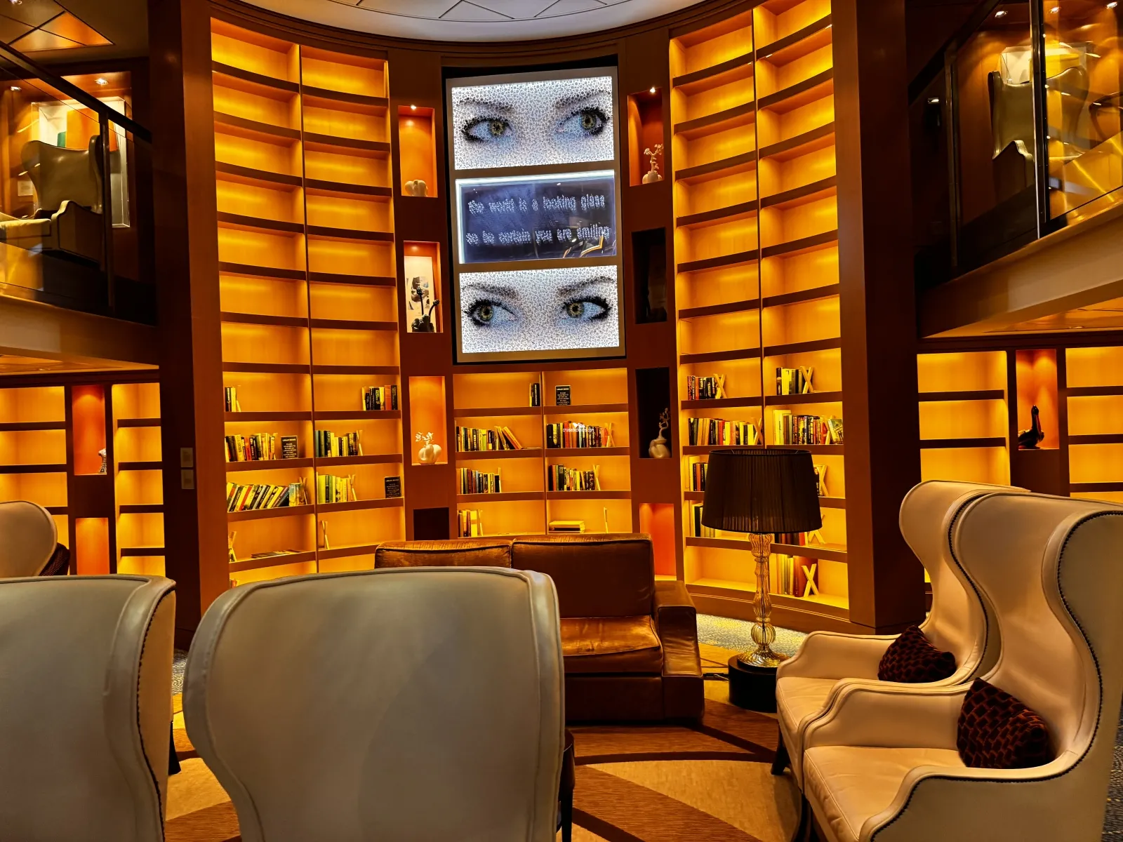Features a mix of comfortable padded chairs and loungers for guests to relax in and enjoy the view over the bow of the ship.The Library