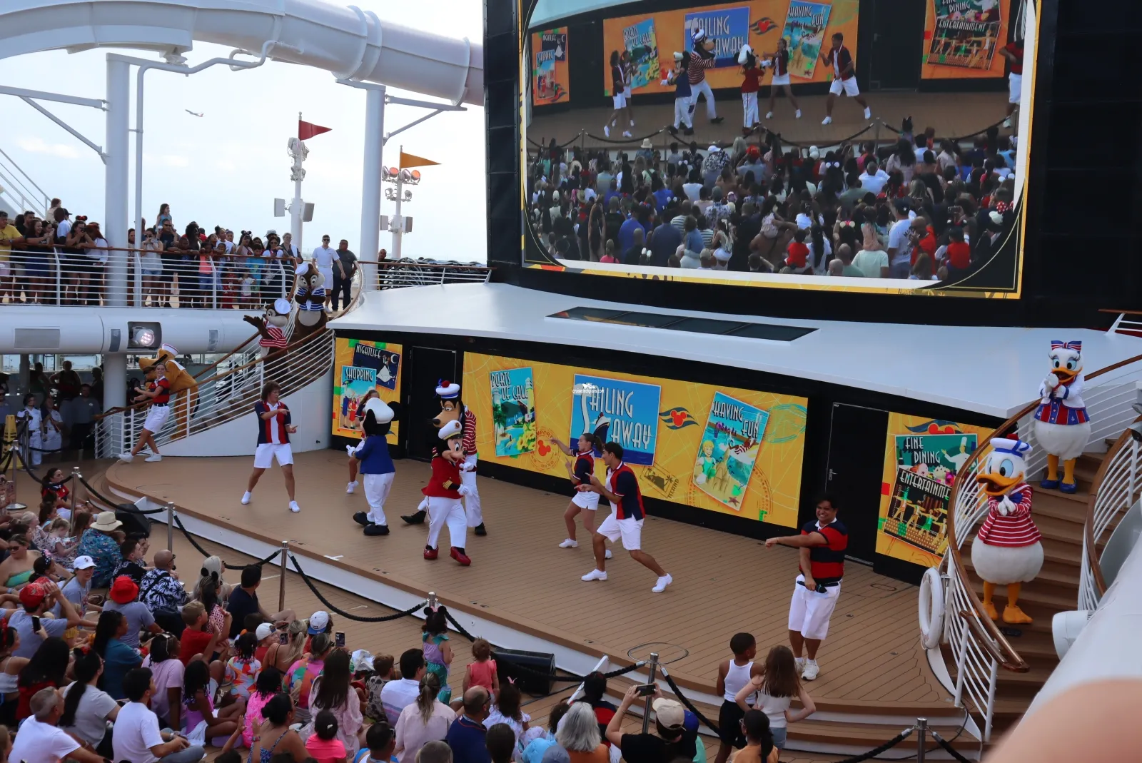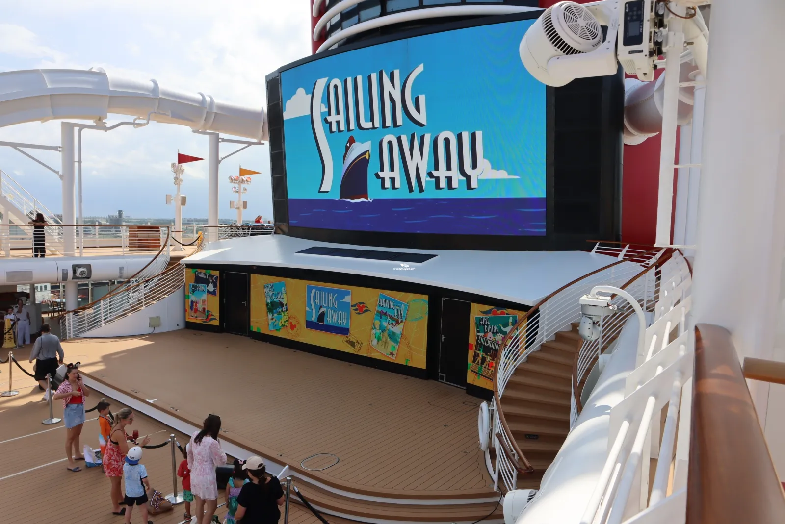 Donald Pool is adorned with a colourful rendering of a smiling Donald Duck on the floor, the pool has a maximum depth of 5 feet and caters to both parents and kids. There is a large movie screen for showing movies. Mickeys pool is close to the Mickey slide.Mickeys Pool Slide