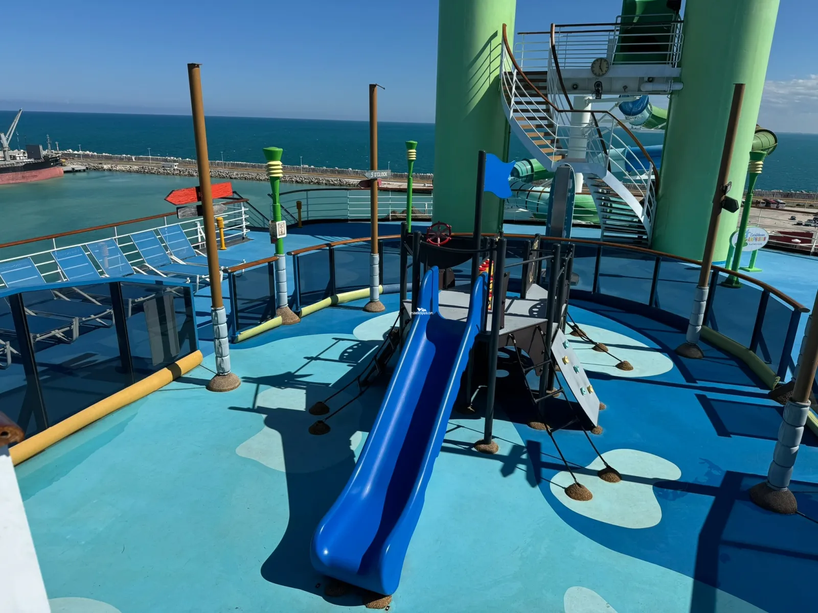 Deck with jogging track, pickle ball court, mini-golf and corn hole.Play Pad and Slide