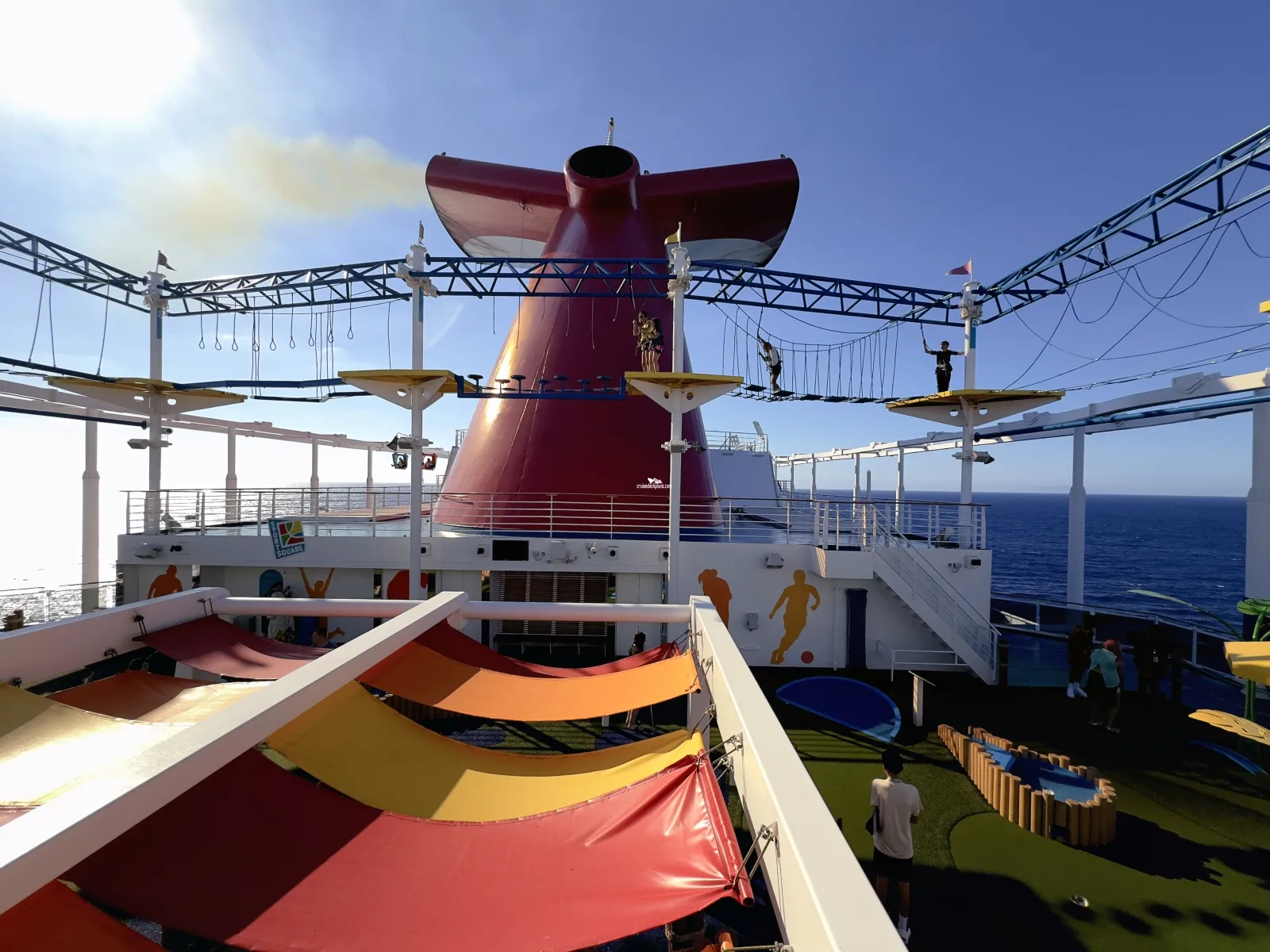 Two-230 foot rope courses located on Deck 14, nearly 150 feet above the sea. Guests strap into a safety harness and choose a beginner or intermediate course, traversing across rope bridges, swinging steps and beams suspended above the top deck. Weight limit: 275 pounds / Height minimum: 48 inches.Sky Ride