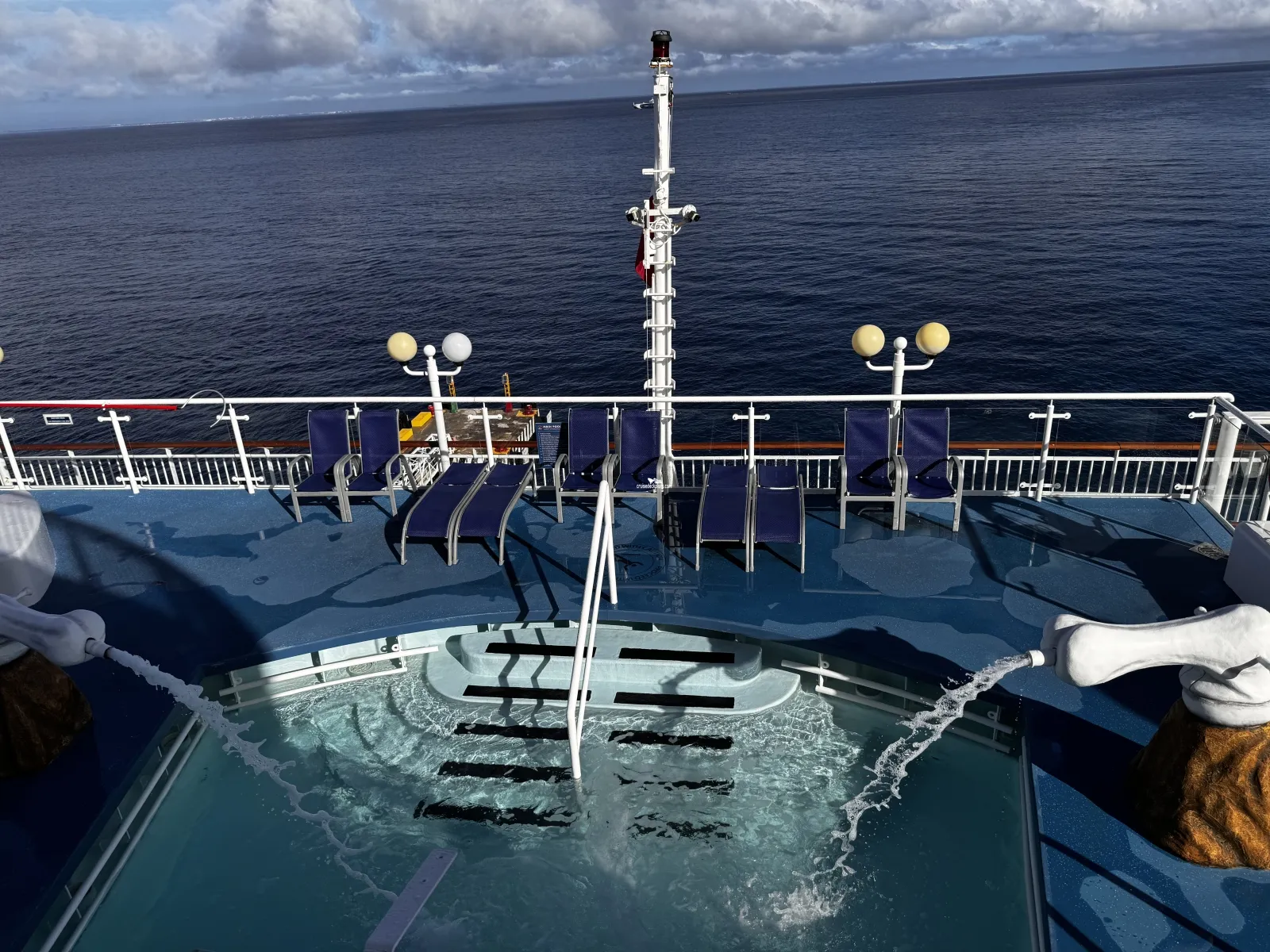 Large pool with 4 hot tubs and statium style lounge chairs. Nearby bar and ice cream bar. This is the place the ship also has out door cook outs.Library