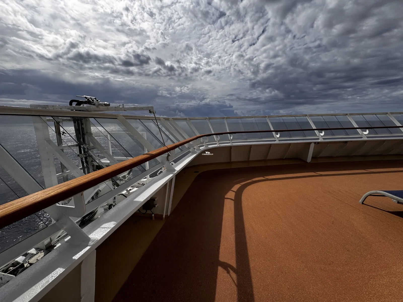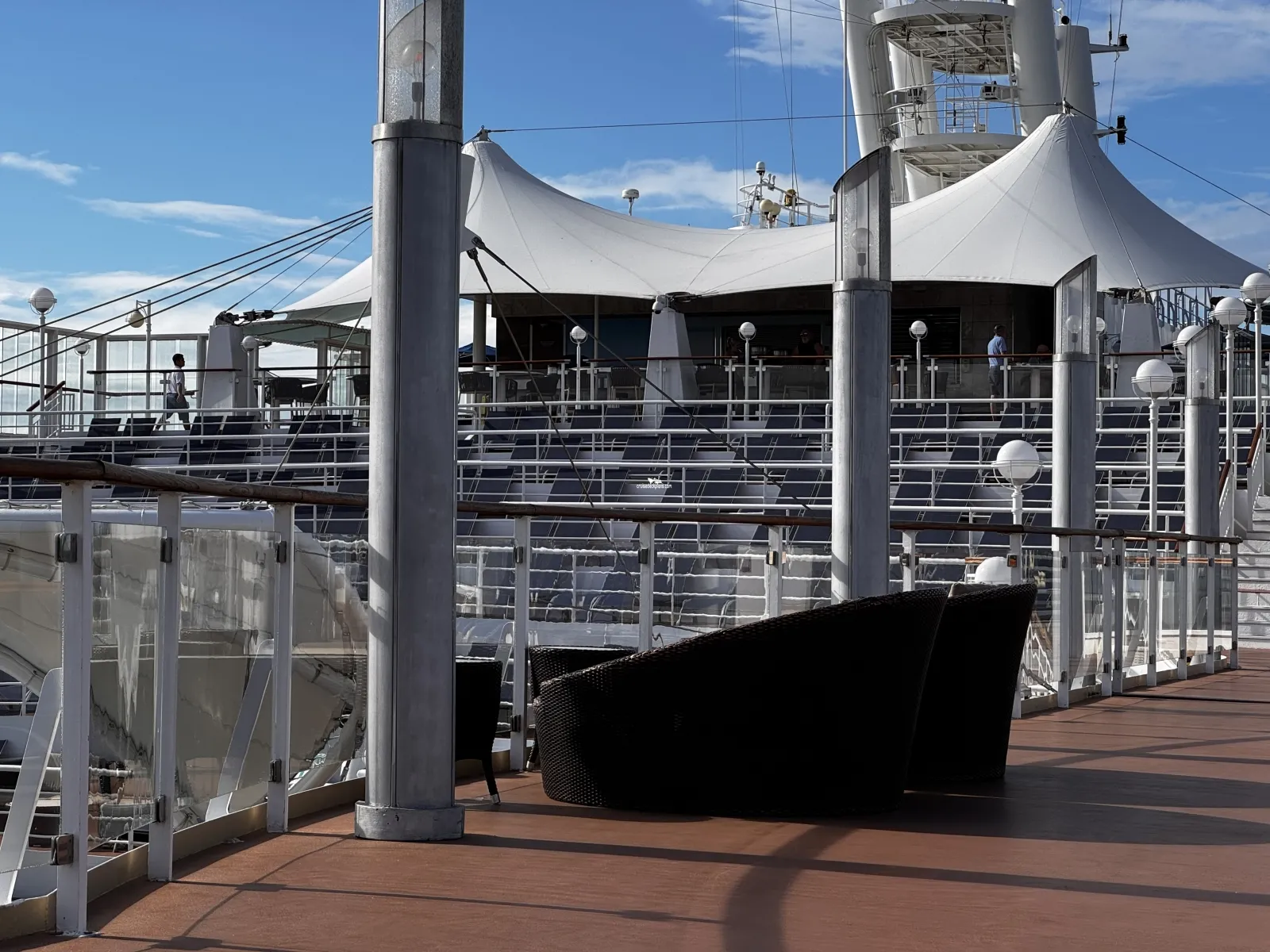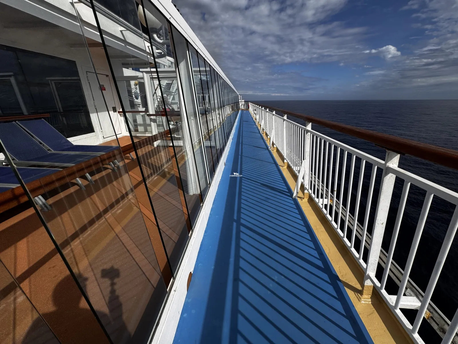 Jogging track that makes loop around pool and back to aft of the ship. Parts of the track may have walkers crossing. Area around the pool is also used for pool loungers.Sun Deck Forward