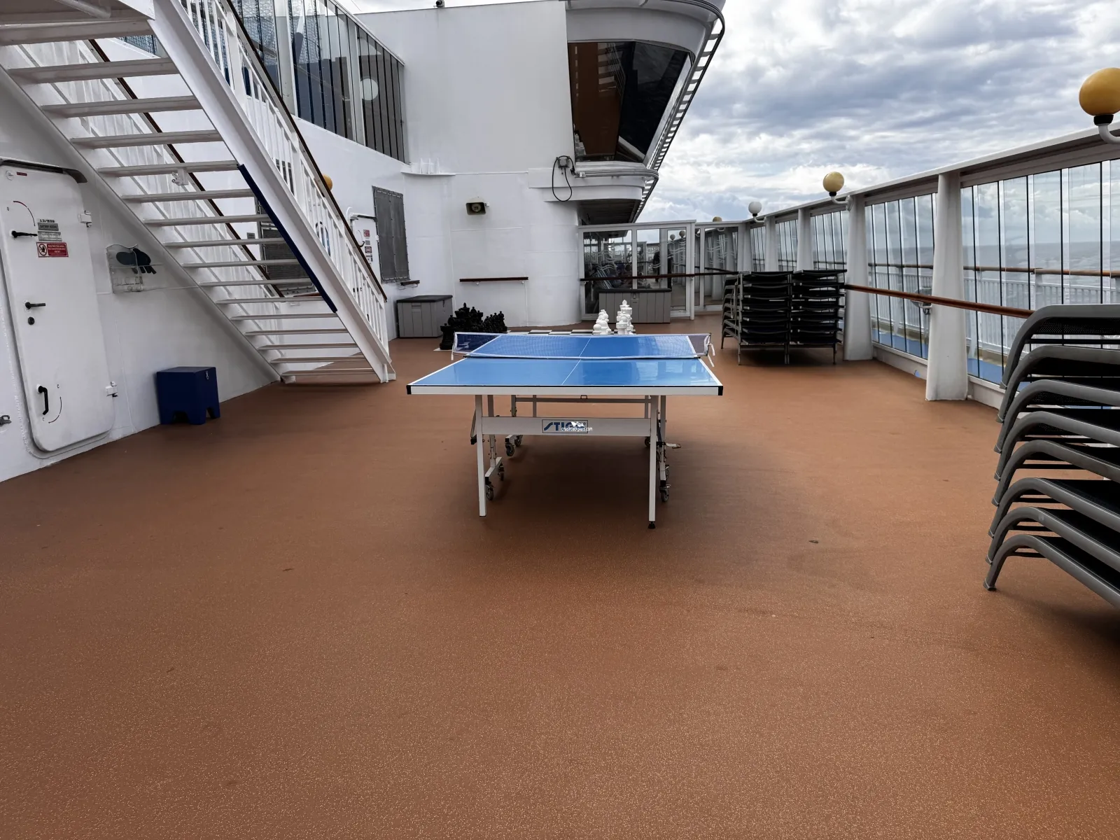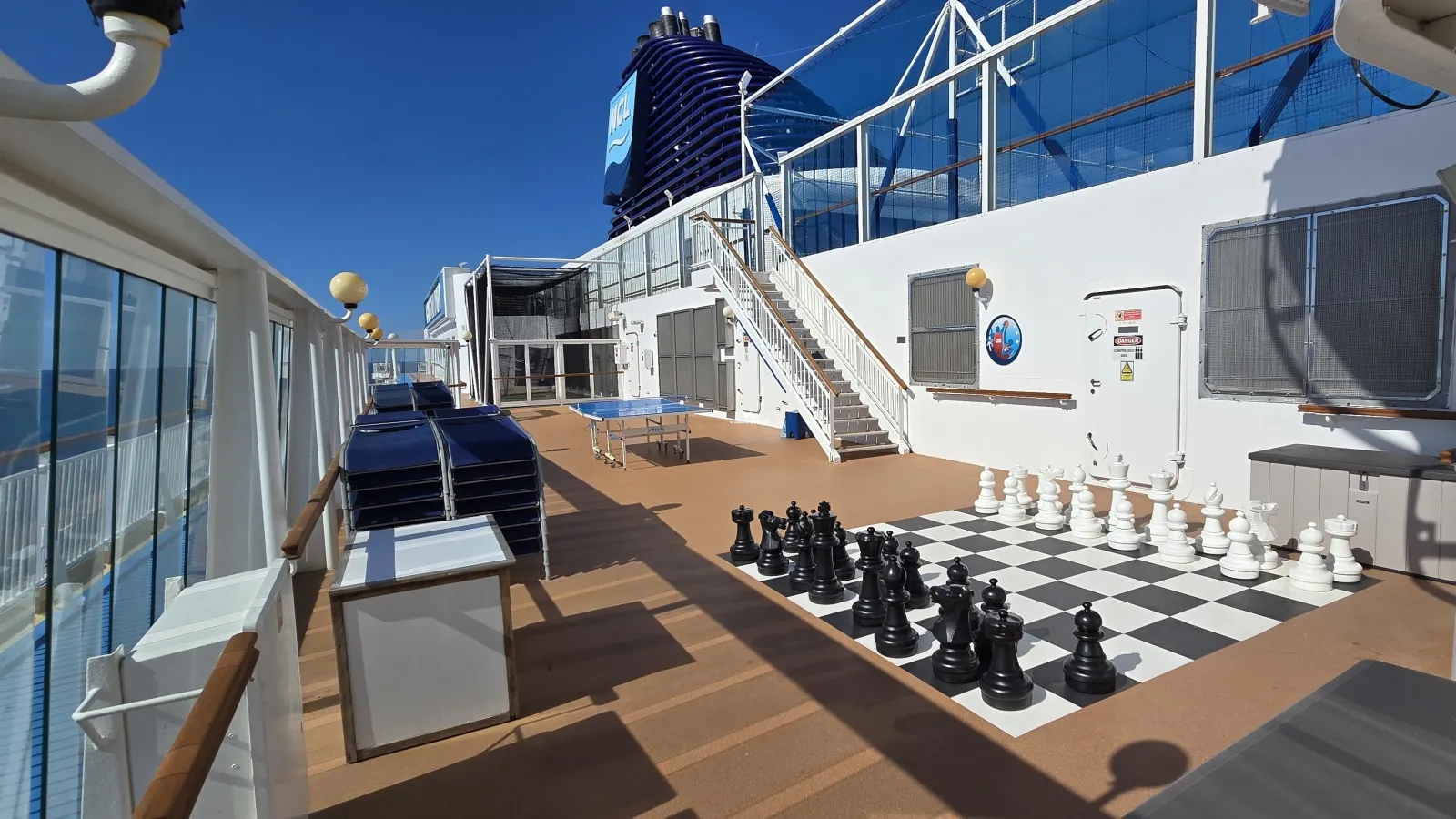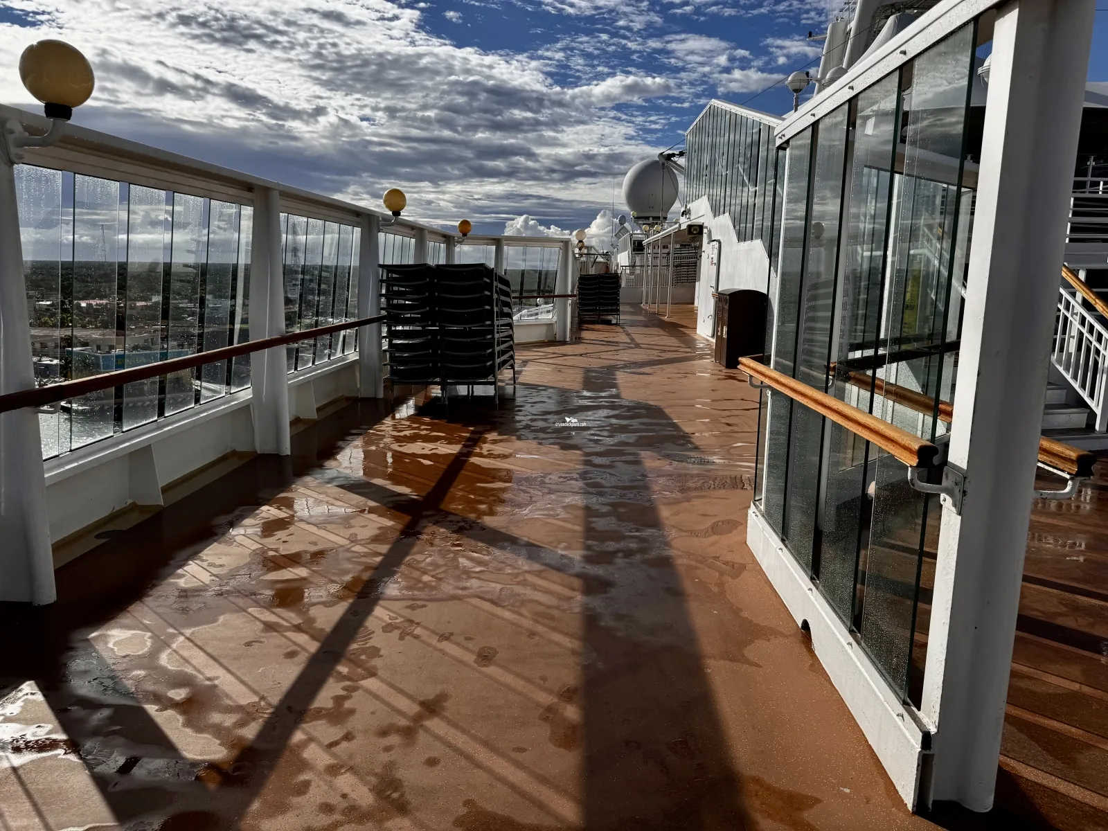 Jogging track that makes loop around pool and back to aft of the ship. Parts of the track may have walkers crossing. Area around the pool is also used for pool loungers.Sun Deck Forward