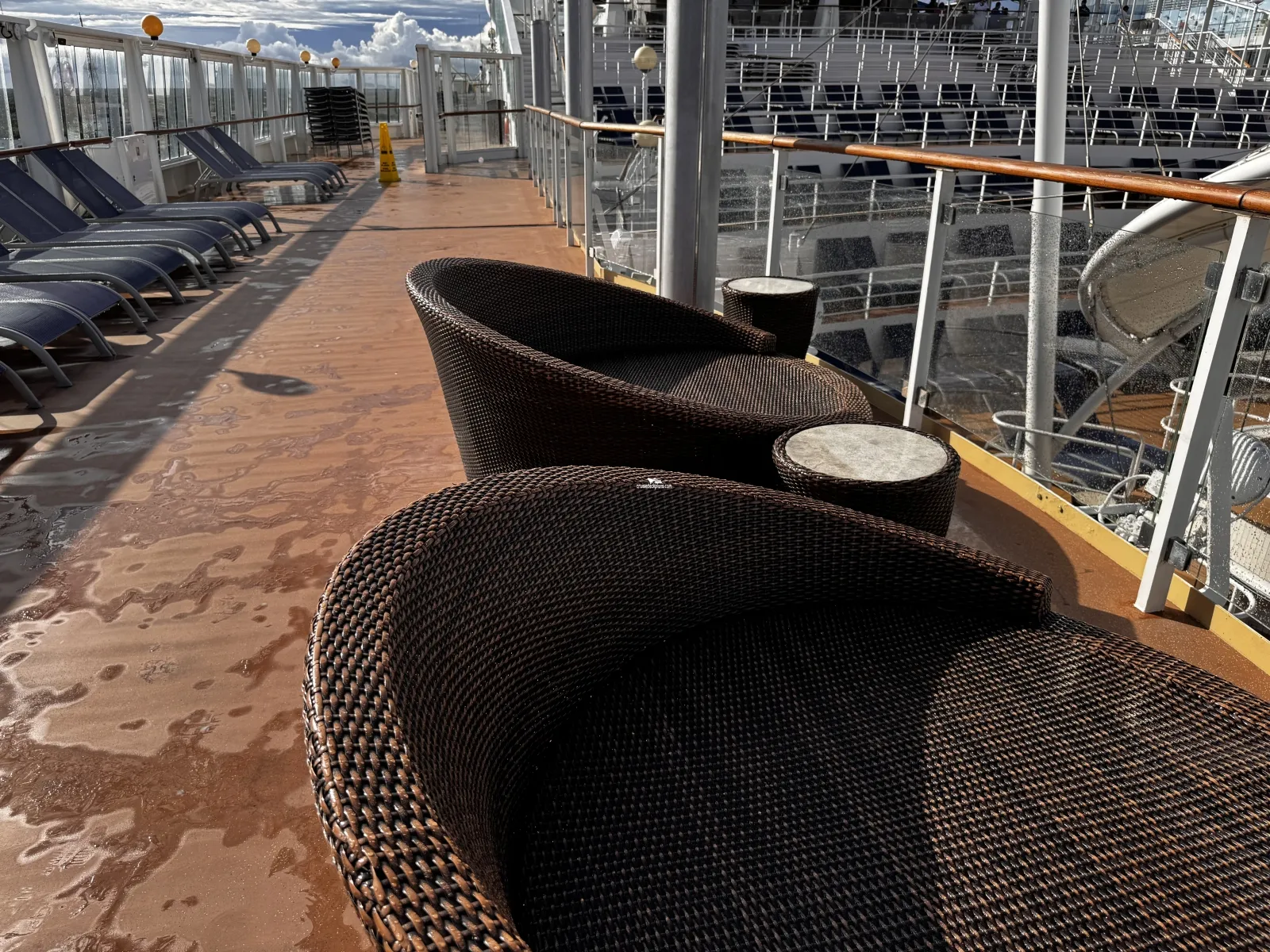 Sun Deck on forward part of deck 13. There is a hot tubs and lounge chairs in seperated glass sections.Seating for Pool