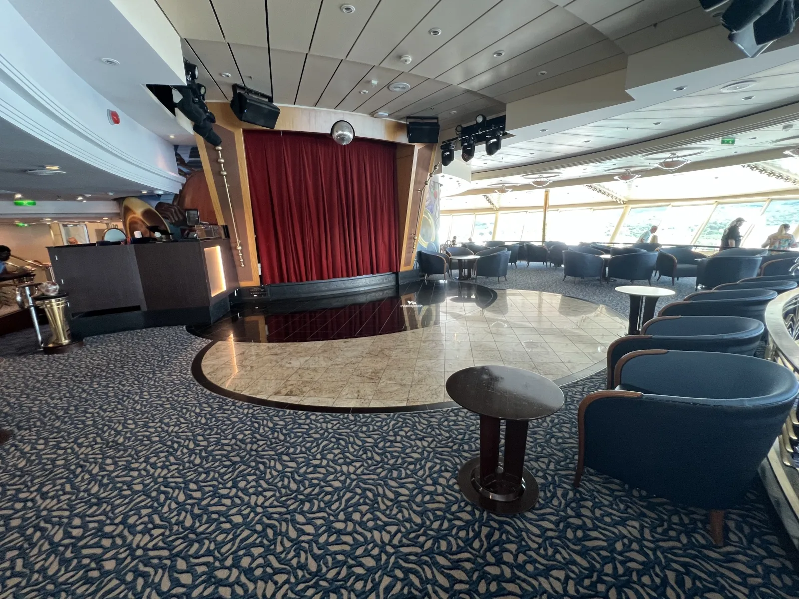 The lounge's centerpiece offering a bar, bandstand, and dance floor.Diamond Club