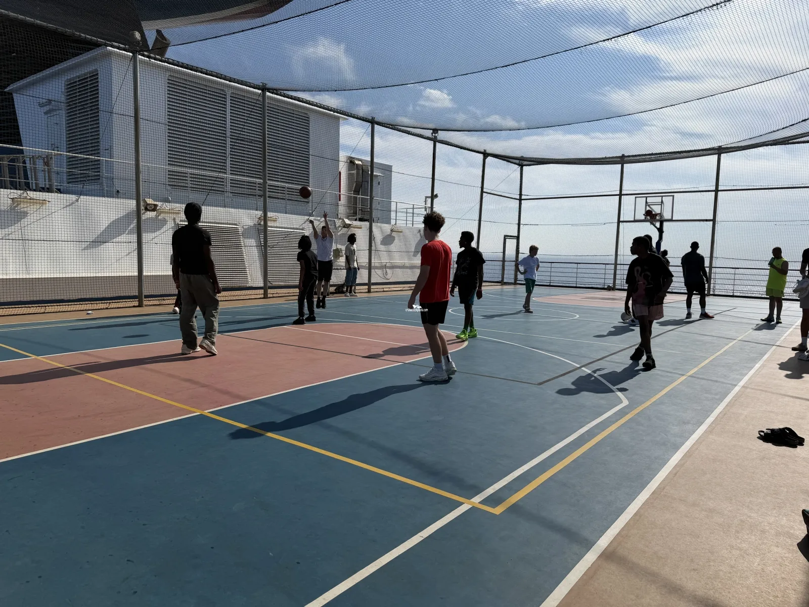 Adults-only outdoor area featuring 2 hot tubs and bar, padded hammocks, sun loungers, round 2-seater chaise lounges, and shaded areas. Guests must be 21 years or older.Sports Court