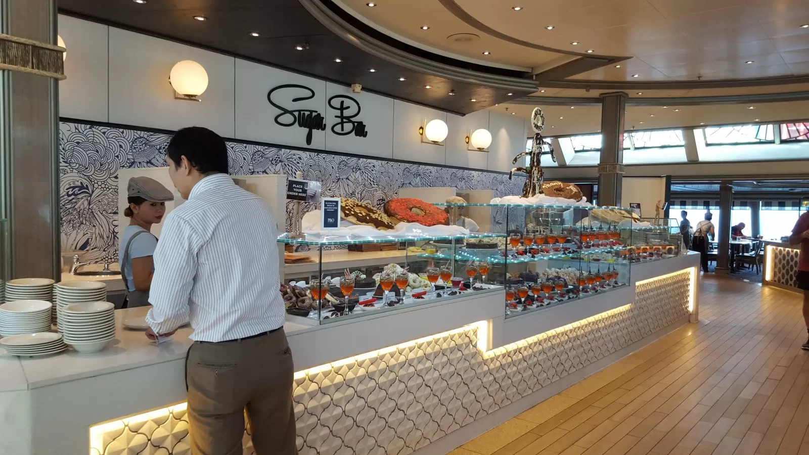 Self served buffet restaurant with both inside and outside seating (on the Terrace). You will find various food stations including salads, BBQ fare, grill serving burgers and hot dogs, fish and chips, pasta, pizza, gourmet deli sandwiches, mexican and asian options. Drinks are available at a bar (for fee). There is also a desert bar with ice cream.The Oasis