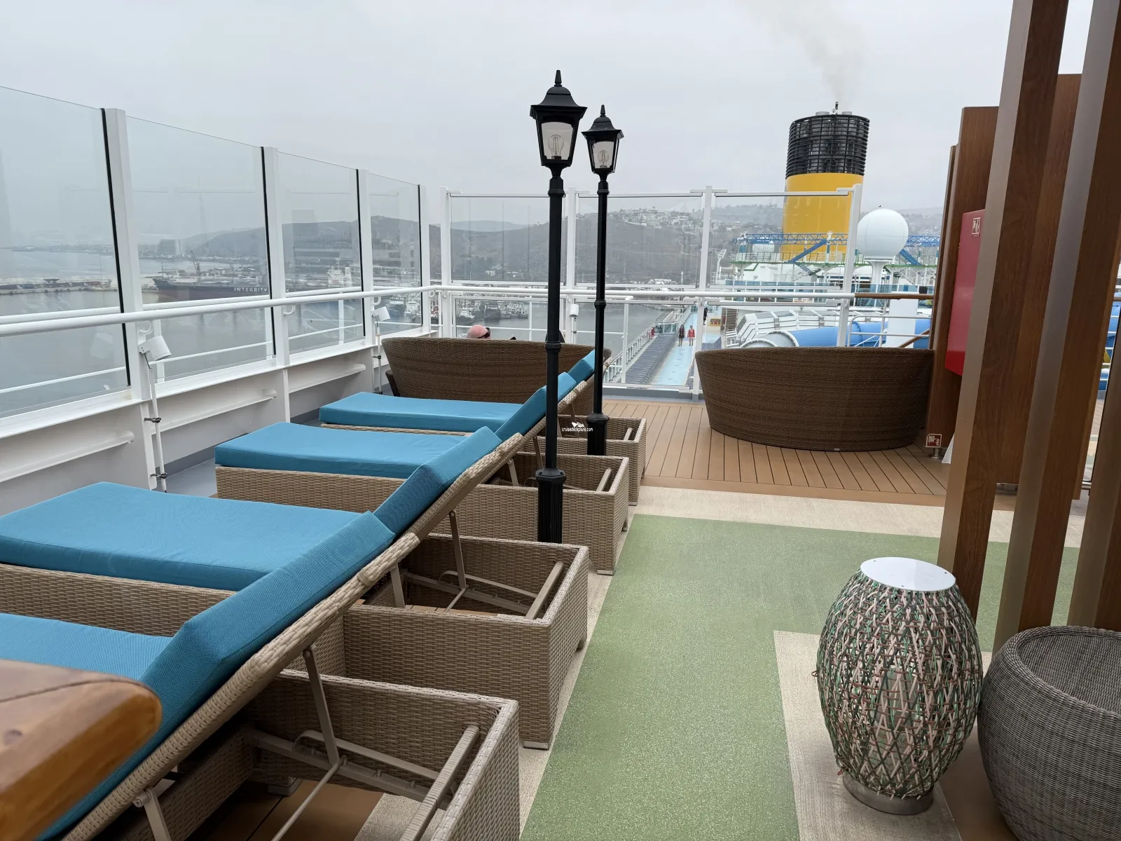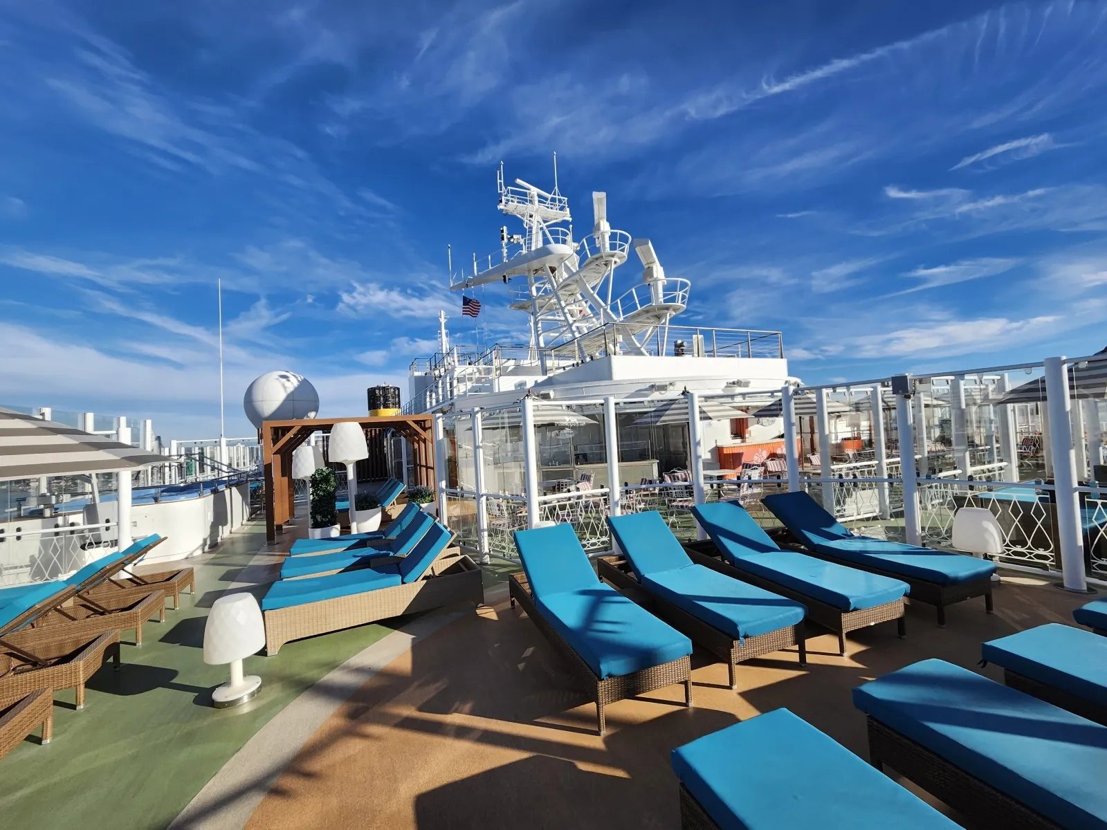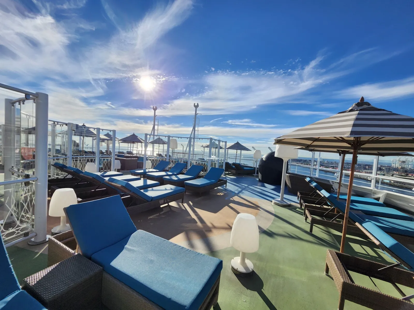 Hours: 8:00am-11:00pm / Hot Tub Spas: 8:00am-12:00am, weather conditions permitting / hours subject to change Adults-Only, outdoor private relaxation area with luxurious chaise lounges, couches, shaded circles, umbrellas, pergolas and dining seating Covered with awnings to create both sunny and shaded areas on both the starboard and portside Hot Tub Spas (2) Guests must be 21 years or older Piped in Music Bar for beverage service ($)Cabin Check Tool