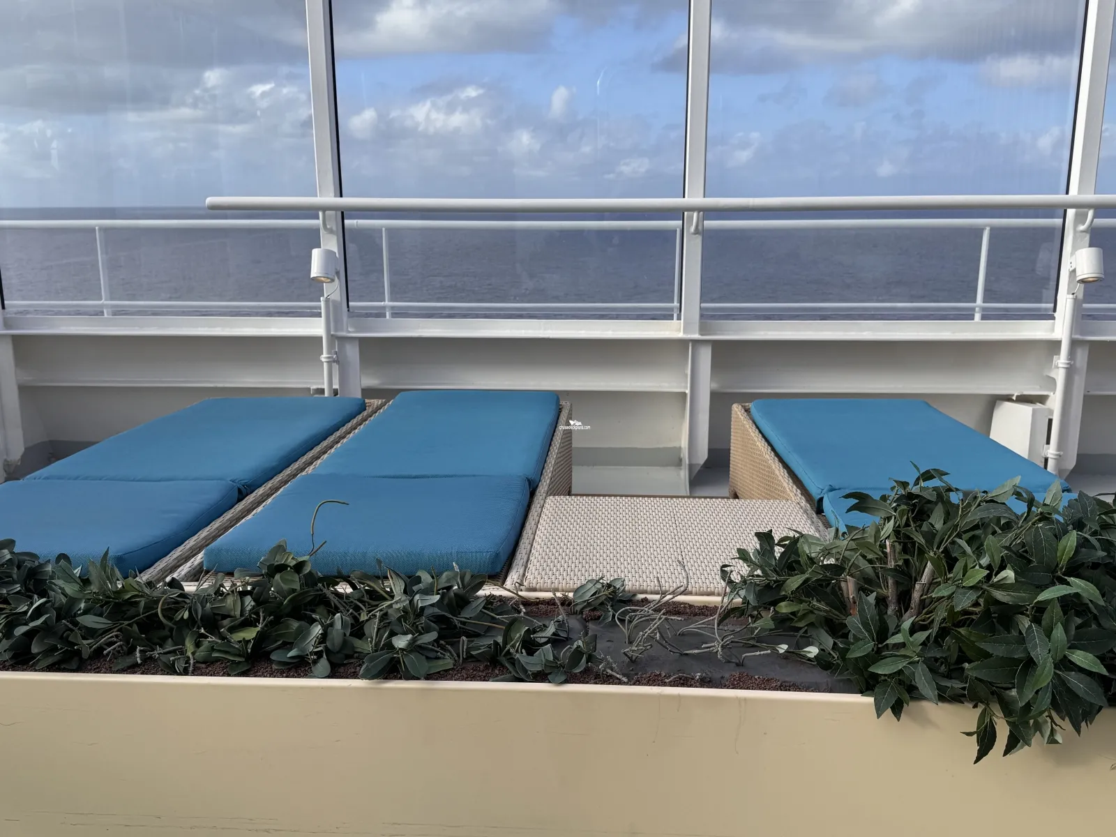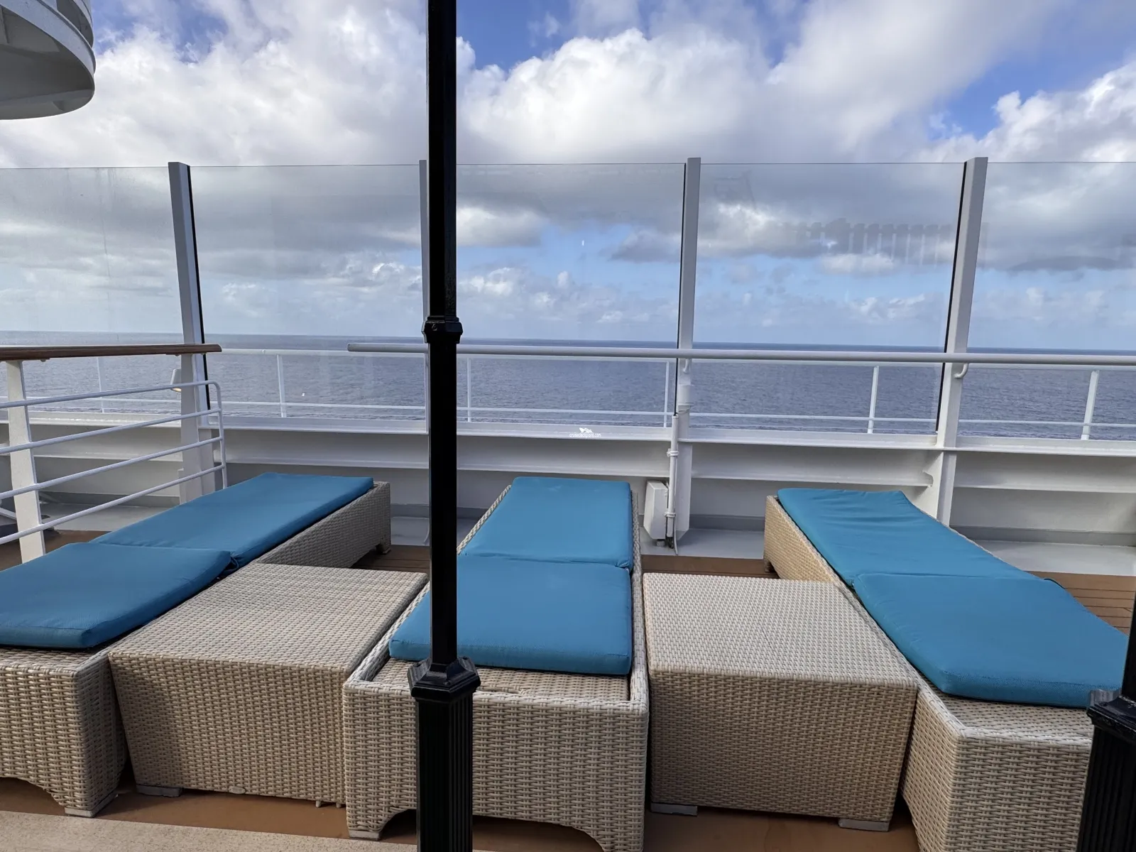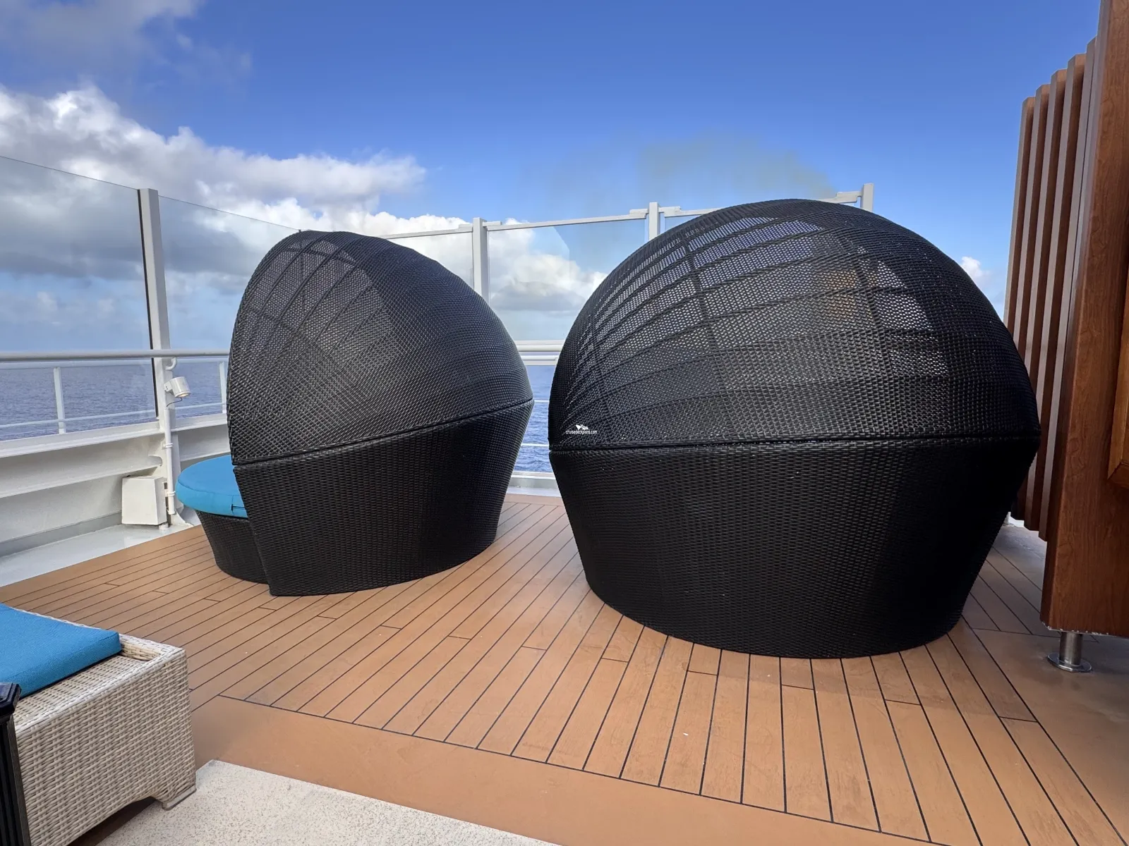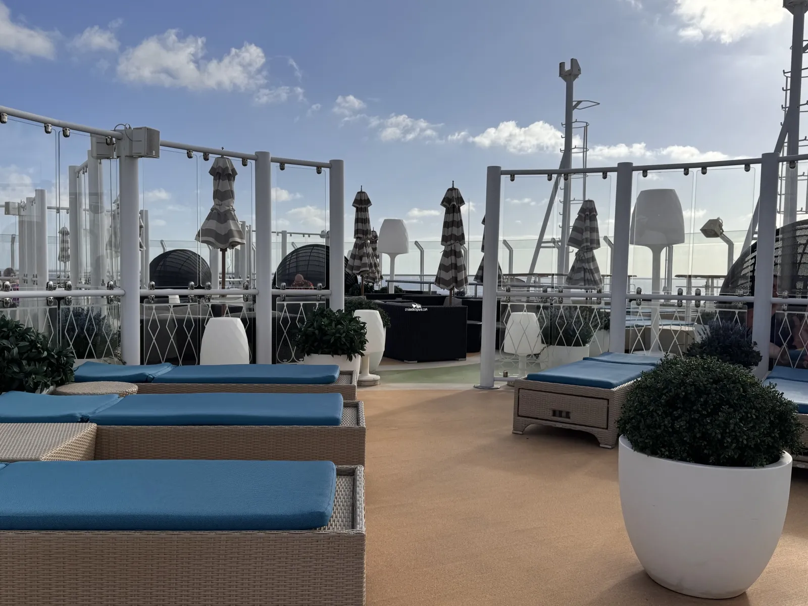 Hours: 8:00am-11:00pm / Hot Tub Spas: 8:00am-12:00am, weather conditions permitting / hours subject to change Adults-Only, outdoor private relaxation area with luxurious chaise lounges, couches, shaded circles, umbrellas, pergolas and dining seating Covered with awnings to create both sunny and shaded areas on both the starboard and portside Hot Tub Spas (2) Guests must be 21 years or older Piped in Music Bar for beverage service ($)Cabin Check Tool