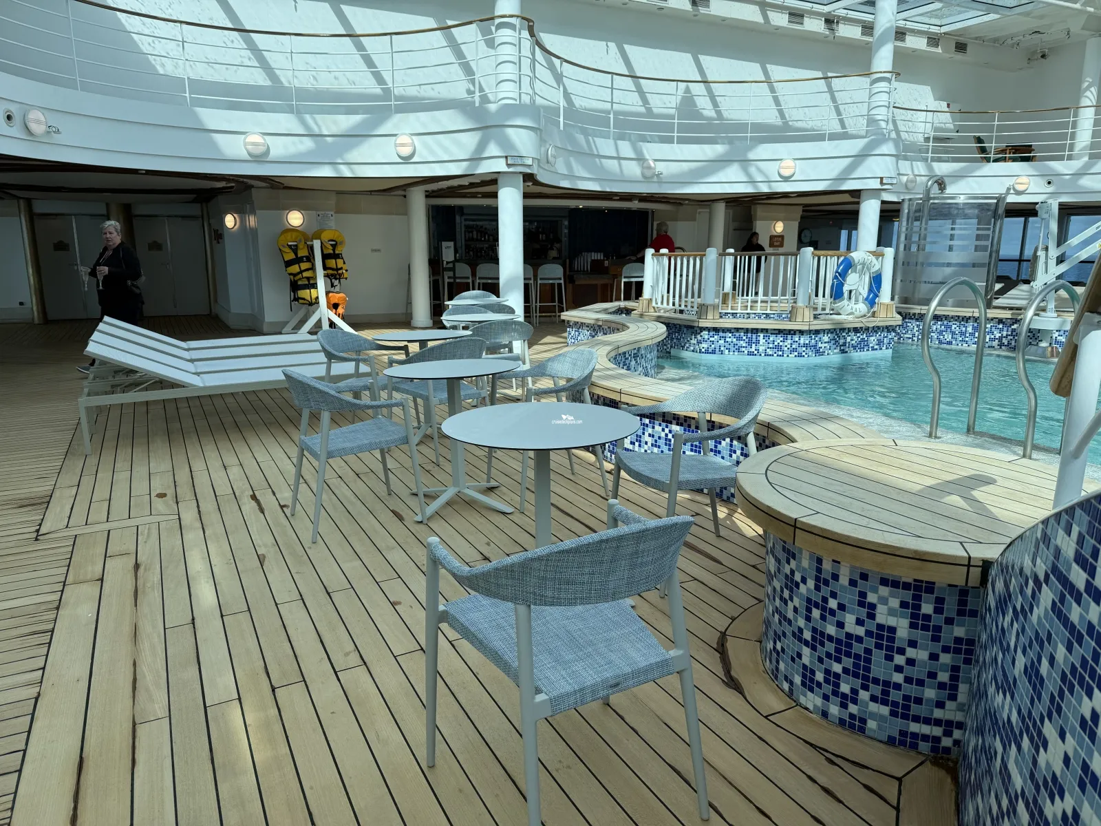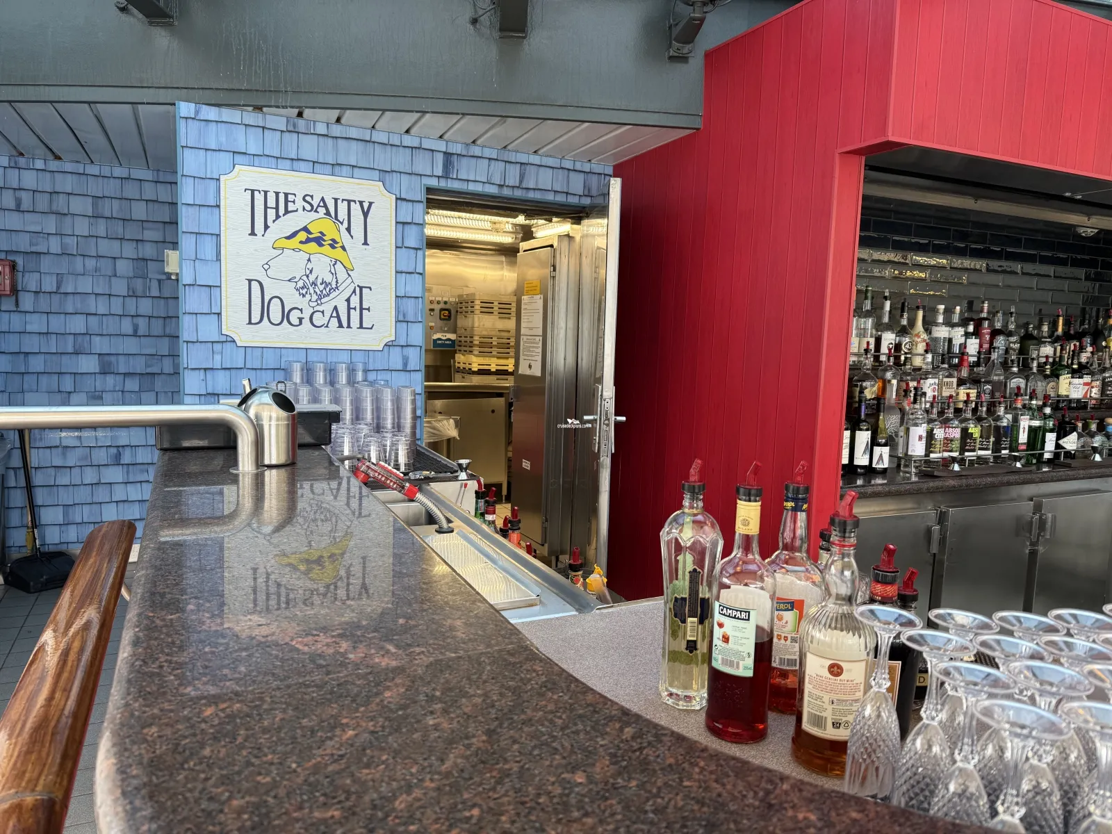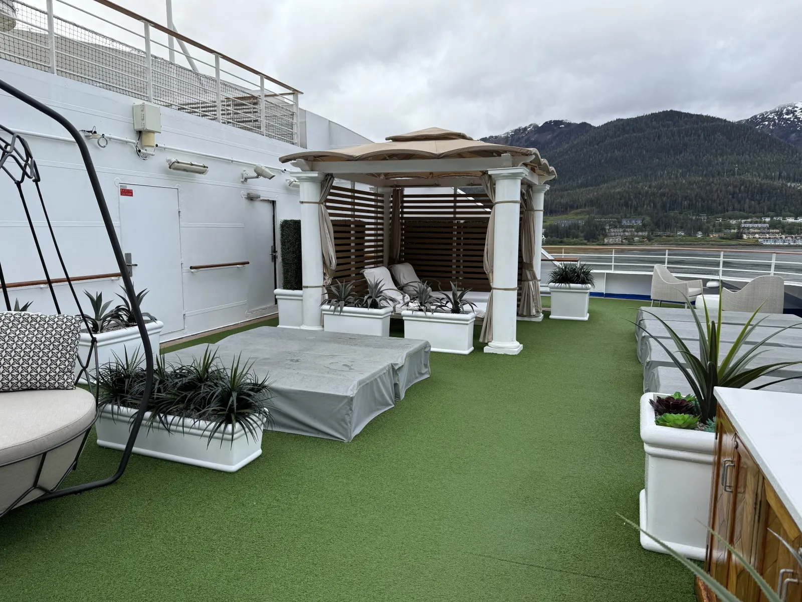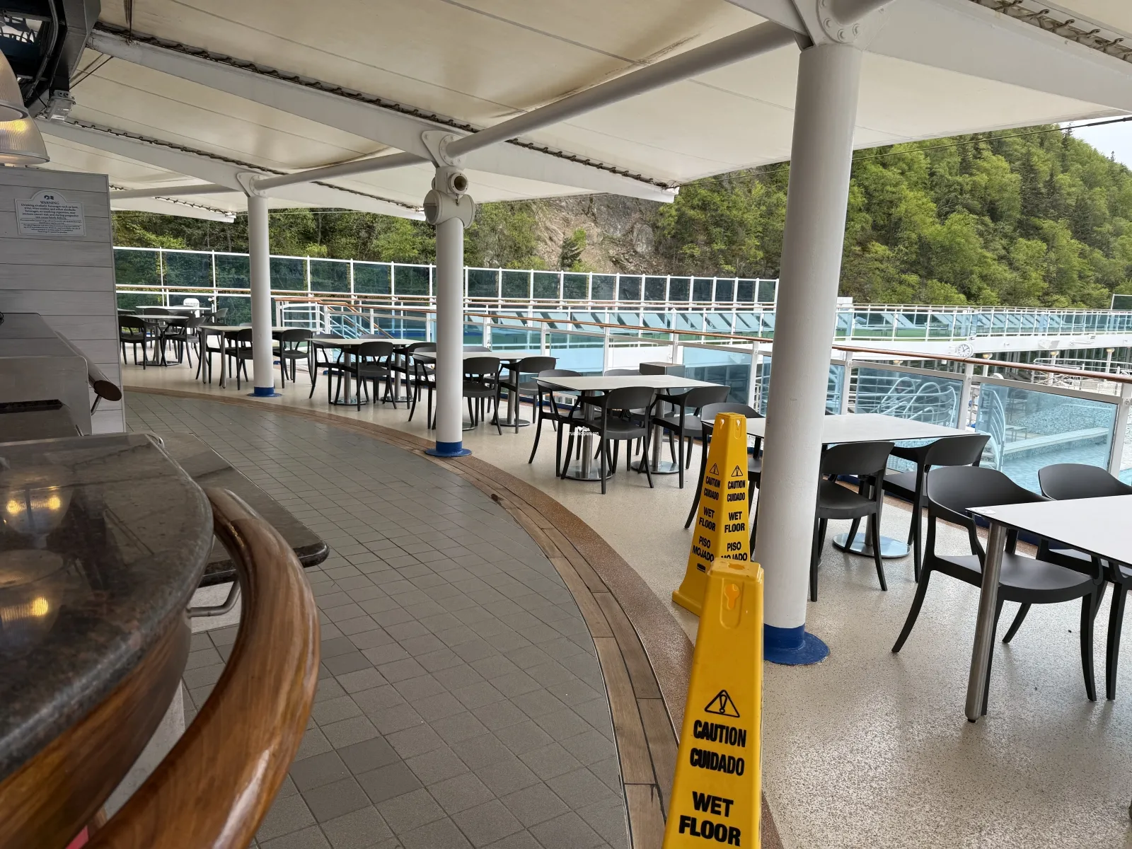Serves complimentary beefburgers, cheeseburgers, veggie burgers, chicken breast, bratwurst, hot dogs and French fries along with beers and sodas from the bar section (additional charge).Sun Deck