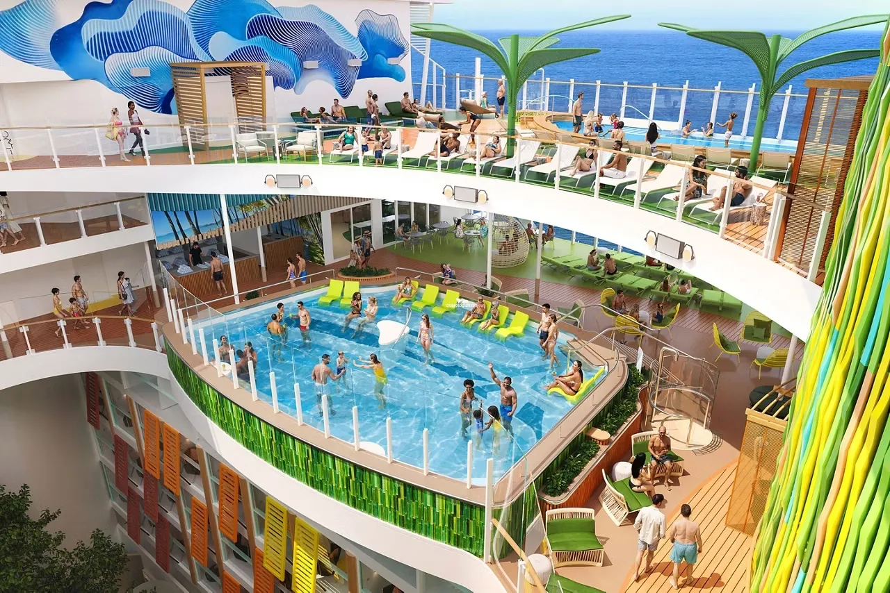 Spans decks 15 and 16 and features stunning views, lounge chairs, bars, pools and hot tubsCabin Check Tool