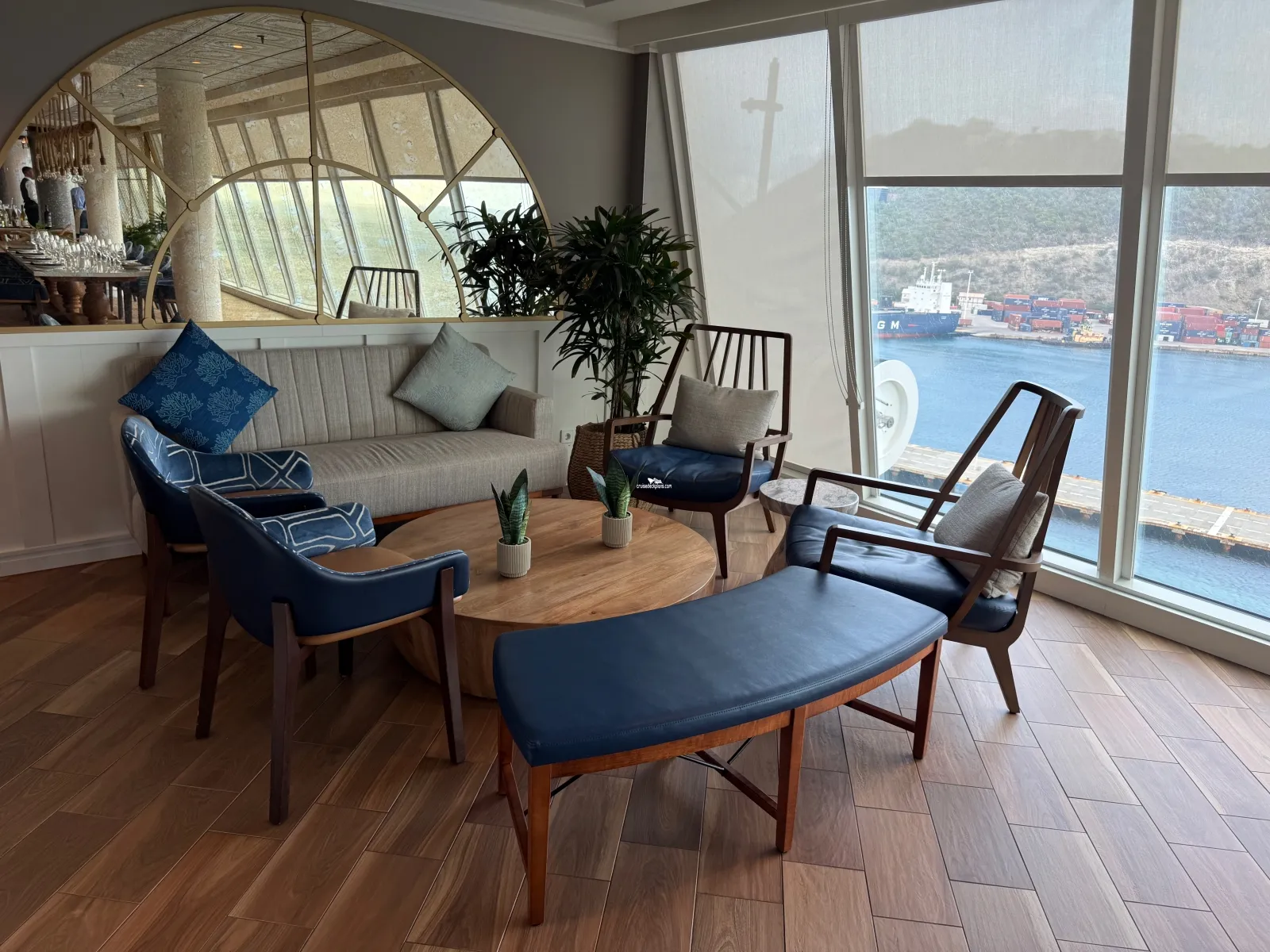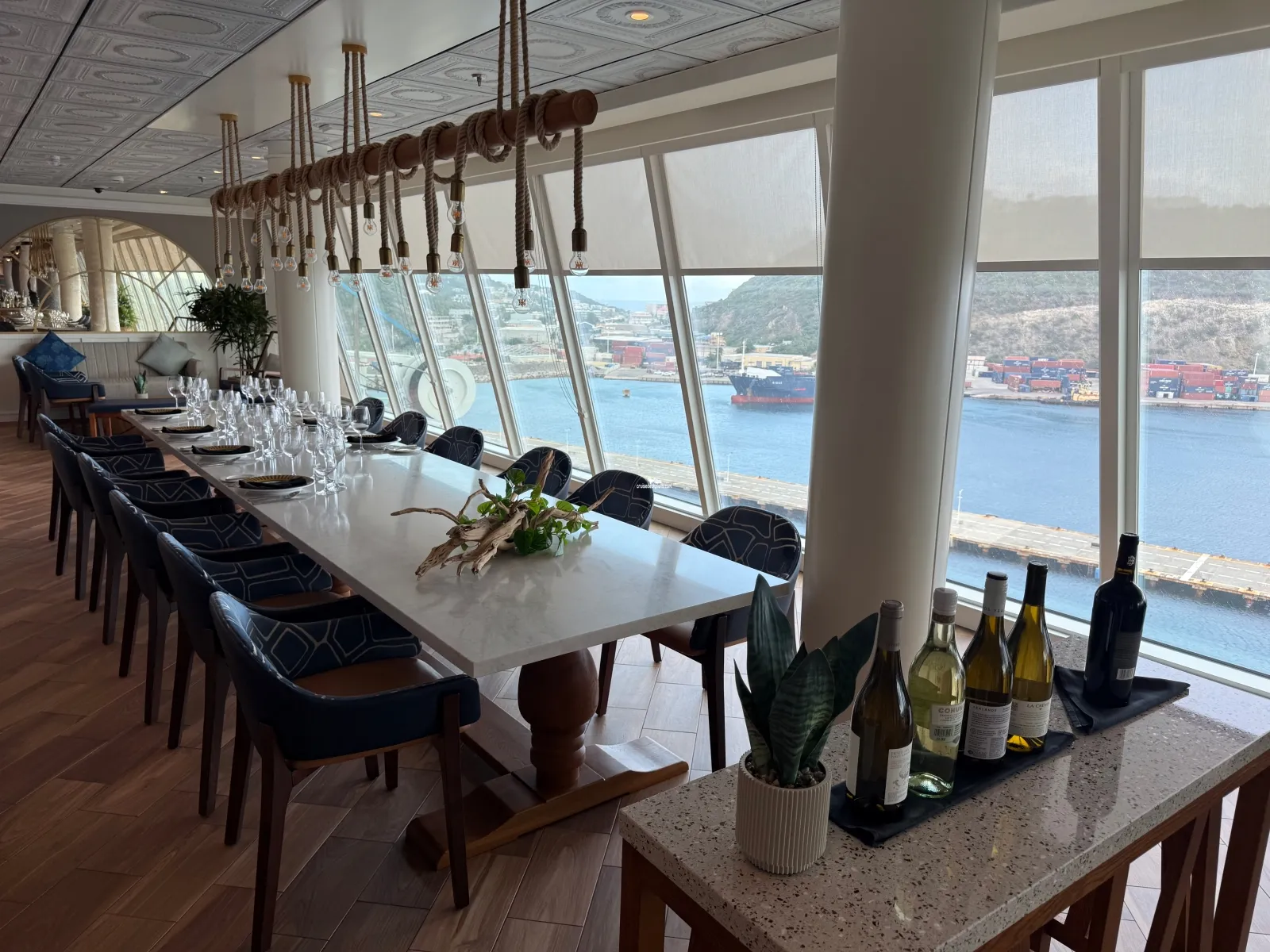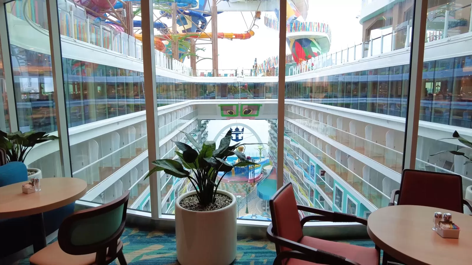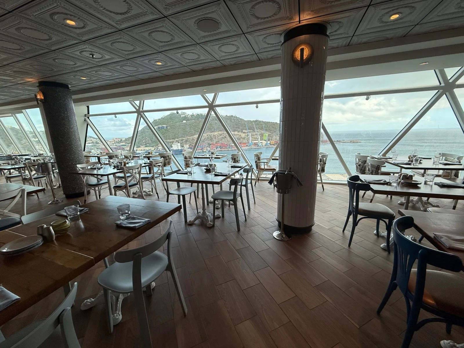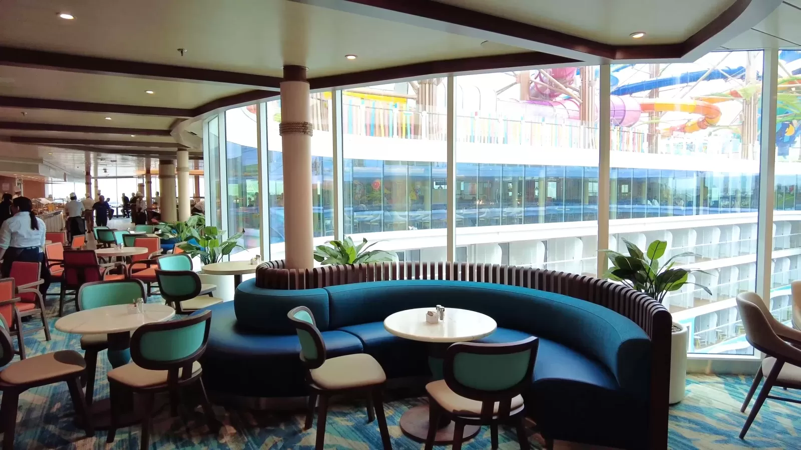 Pods (elevated seating areas) at various levels where you can enjoy the wraparound ocean views in the front of the AquaDome. Open day and night. Teens often take over this area at night.Celebration Table