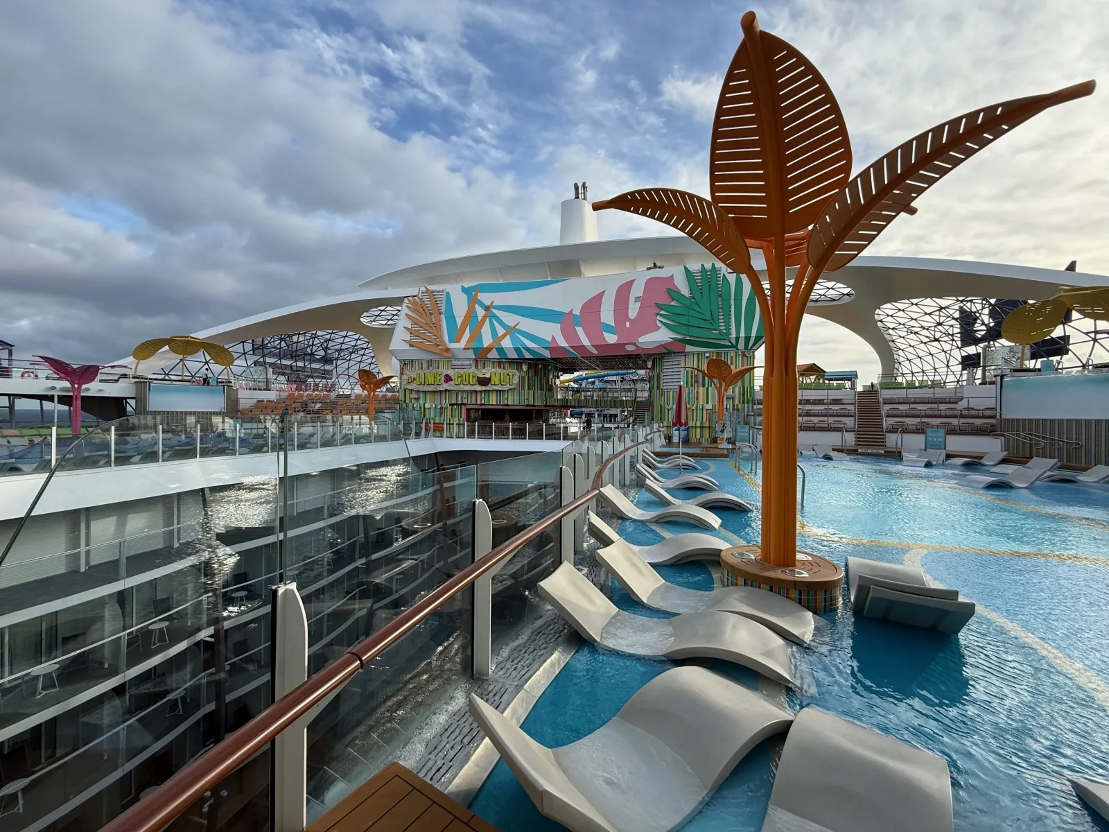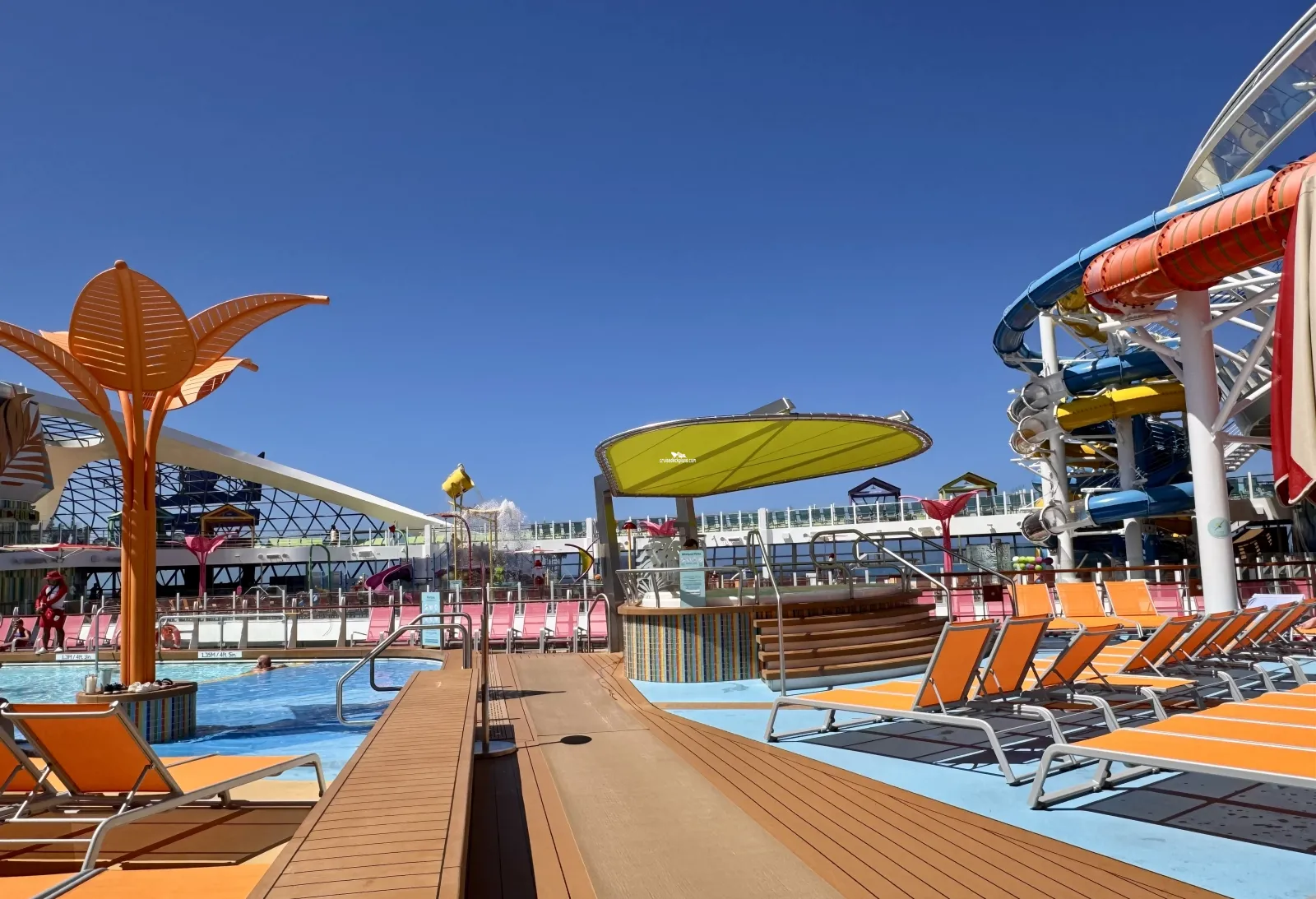 Main pool area. This consists of two large size pools located on both the port and starbord side of the ship. There is a large screen showing entertainment.Beach Pool