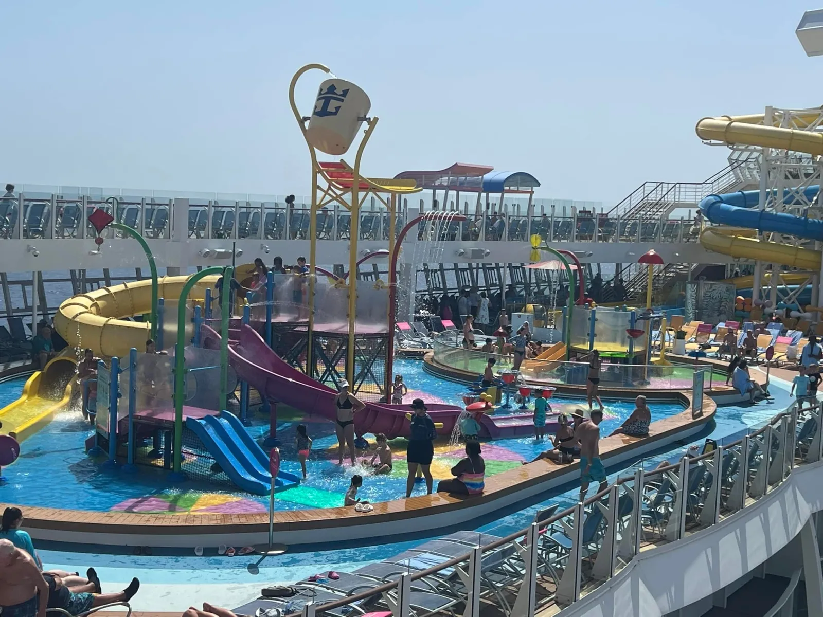 Three multi-story waterslides, all of which twist and turn over Central Park 10 decks below. Exit on deck 15. Port side slide is called The Perfect Storm. Starboard side waterslide is called SupercellSplashaway Bay