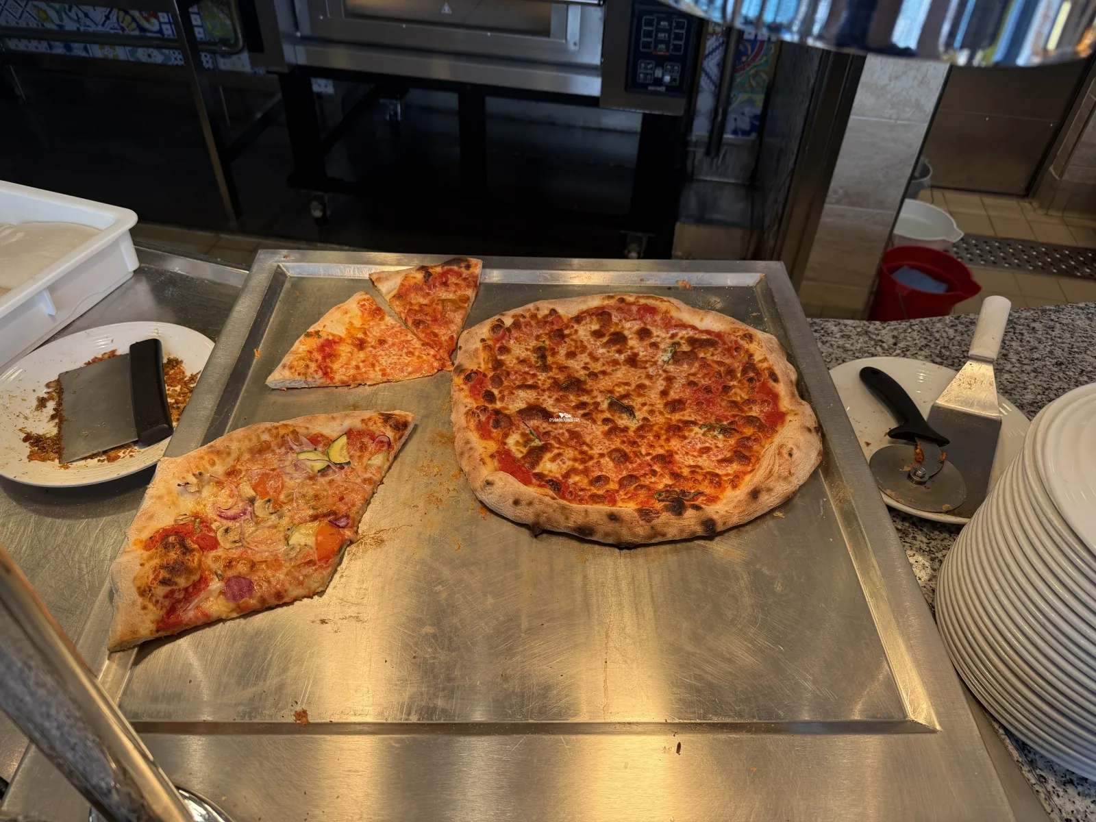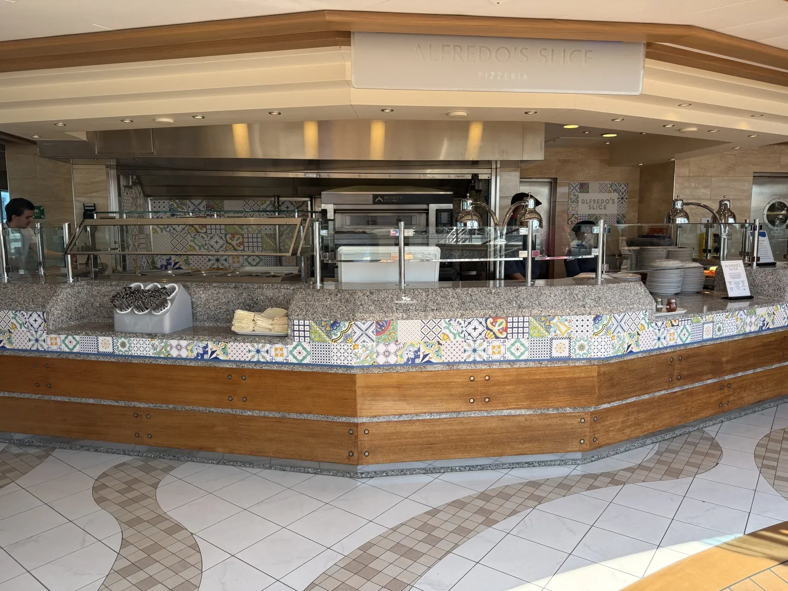 For a quick bite, this poolside grill serves cooked-to-order favorites such as delicious burgers with house-baked buns, 100% all-beef hot dogs, street tacos, loaded fries and more (formerly Lobster Bar & Grill).Alfredos Slice