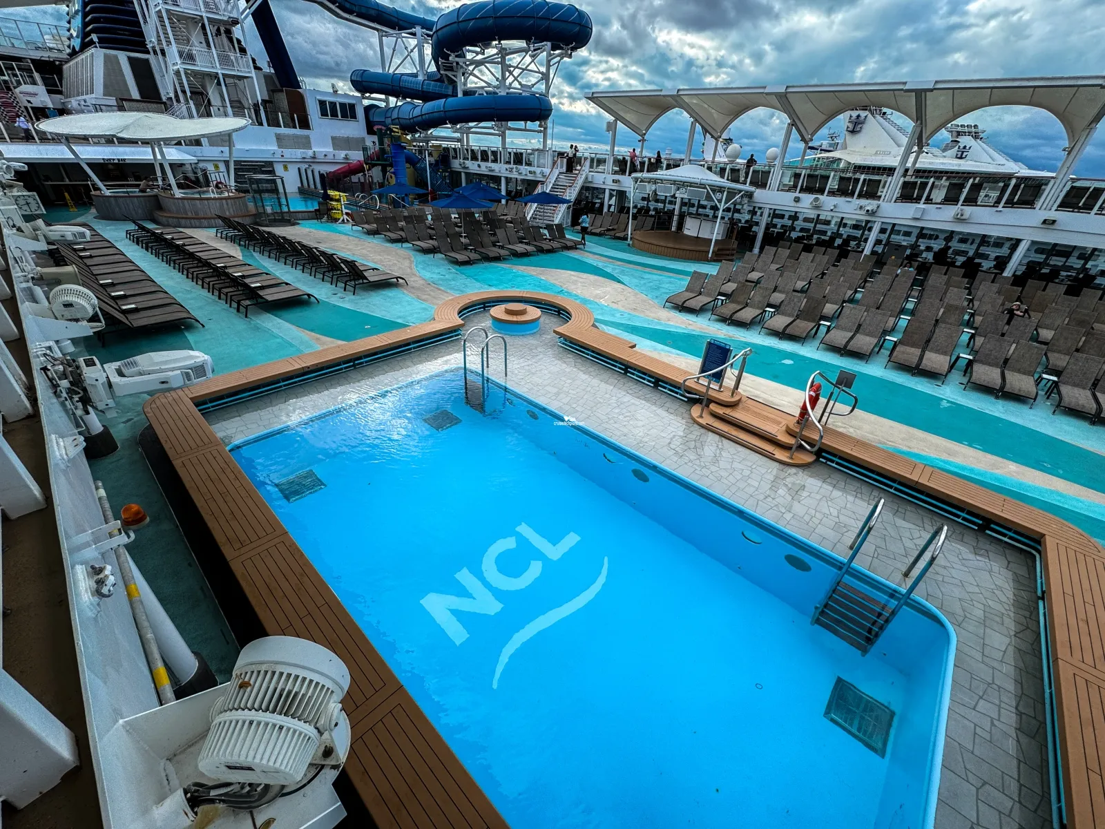 Adult pool, stage , large movie screen and hot tubs served by Waves Pool Bar.Pool