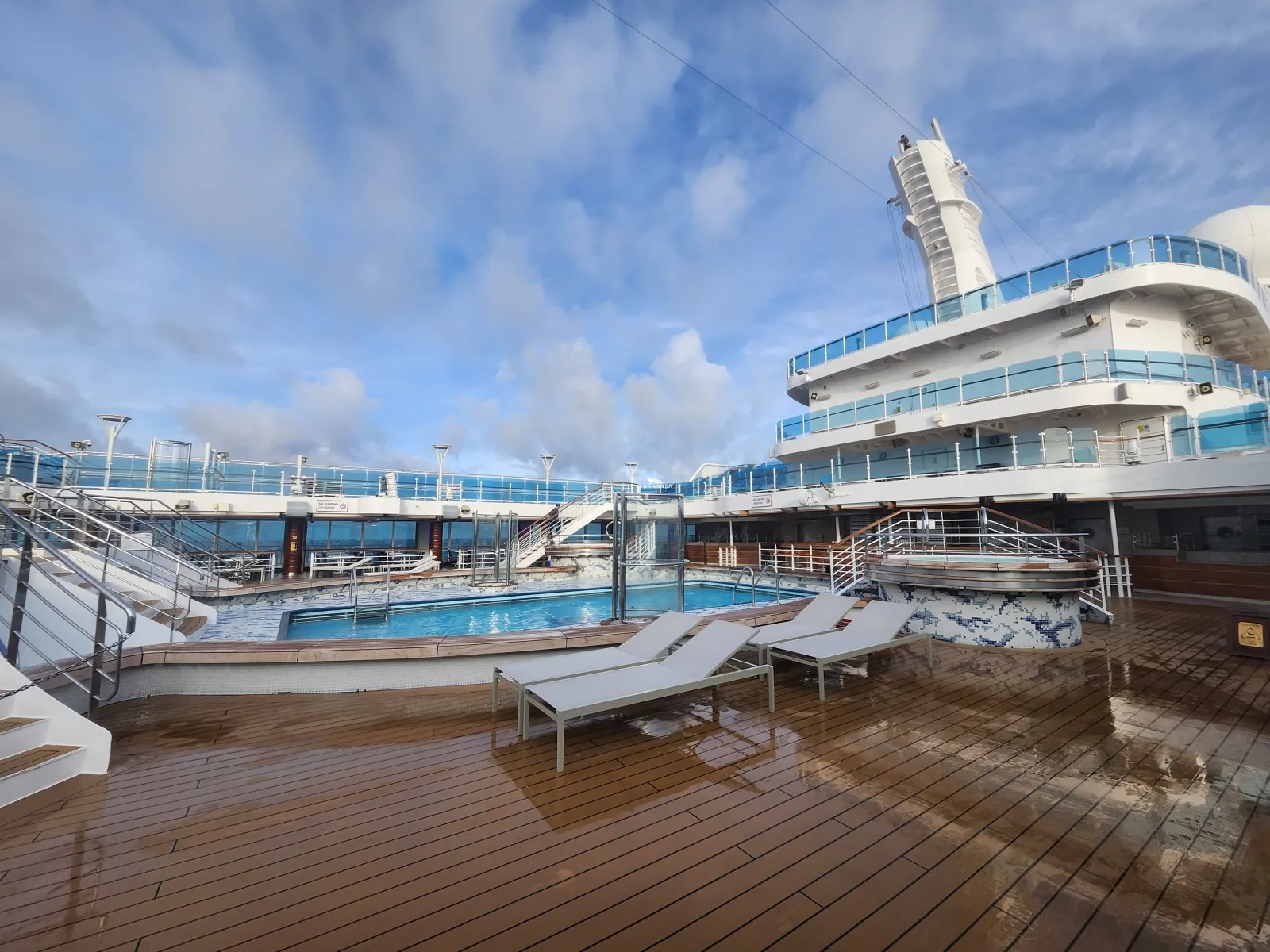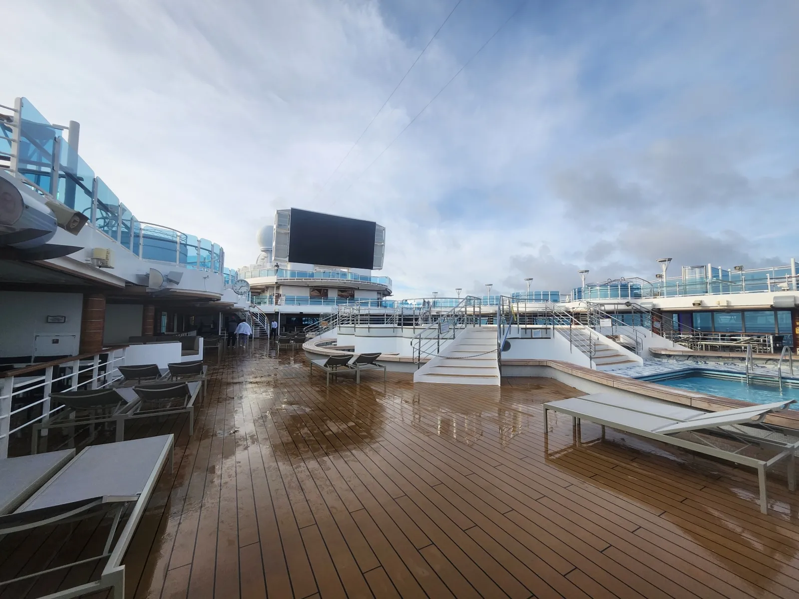 A clear glass walkway that extends out over the starboard side of the shipMain Pool