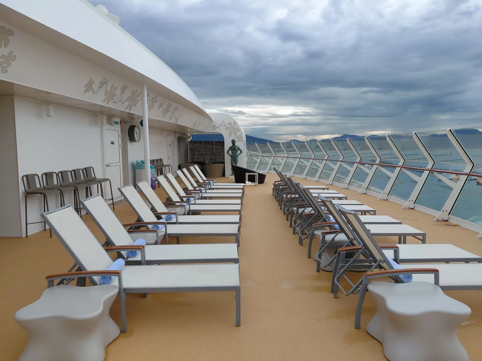Deck that is for the exclusive use of guests staying in Suites. It has lounge chairs and bar.Cabin Check Tool