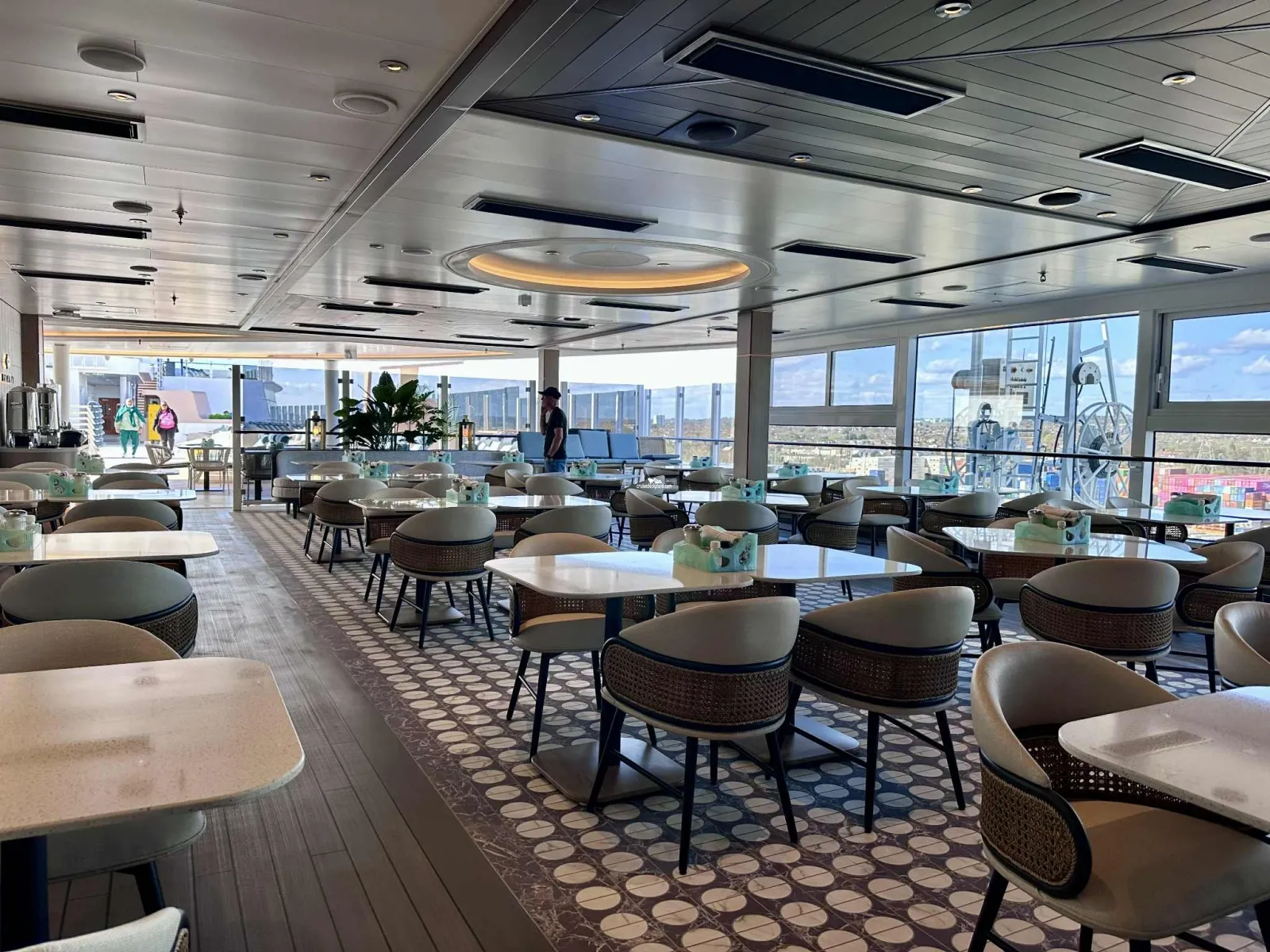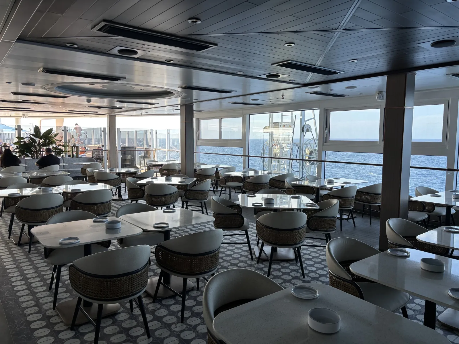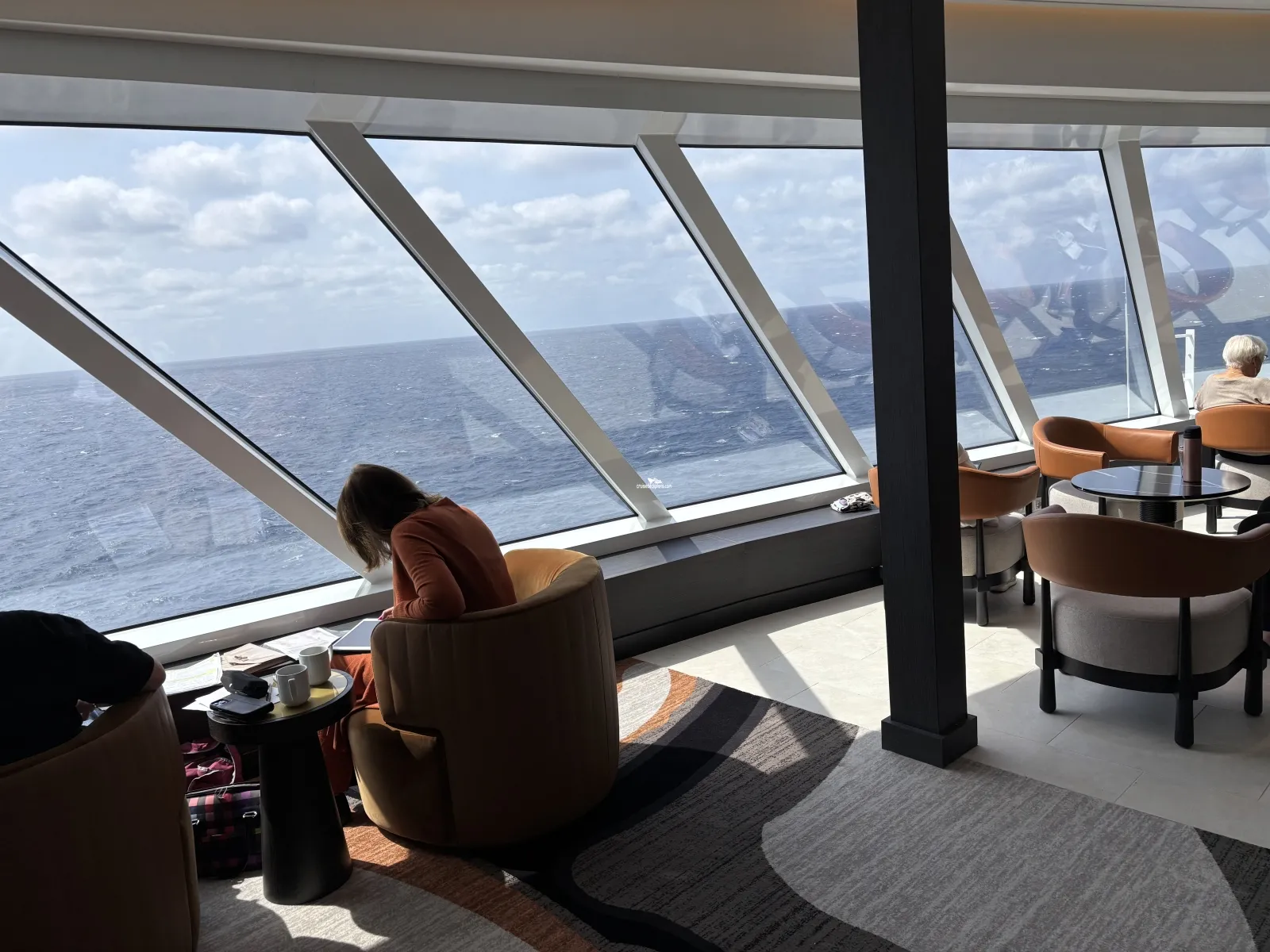 Large floor to ceiling windows featuring lounge and bar. Great view from the top front of the ship.Sukhothai