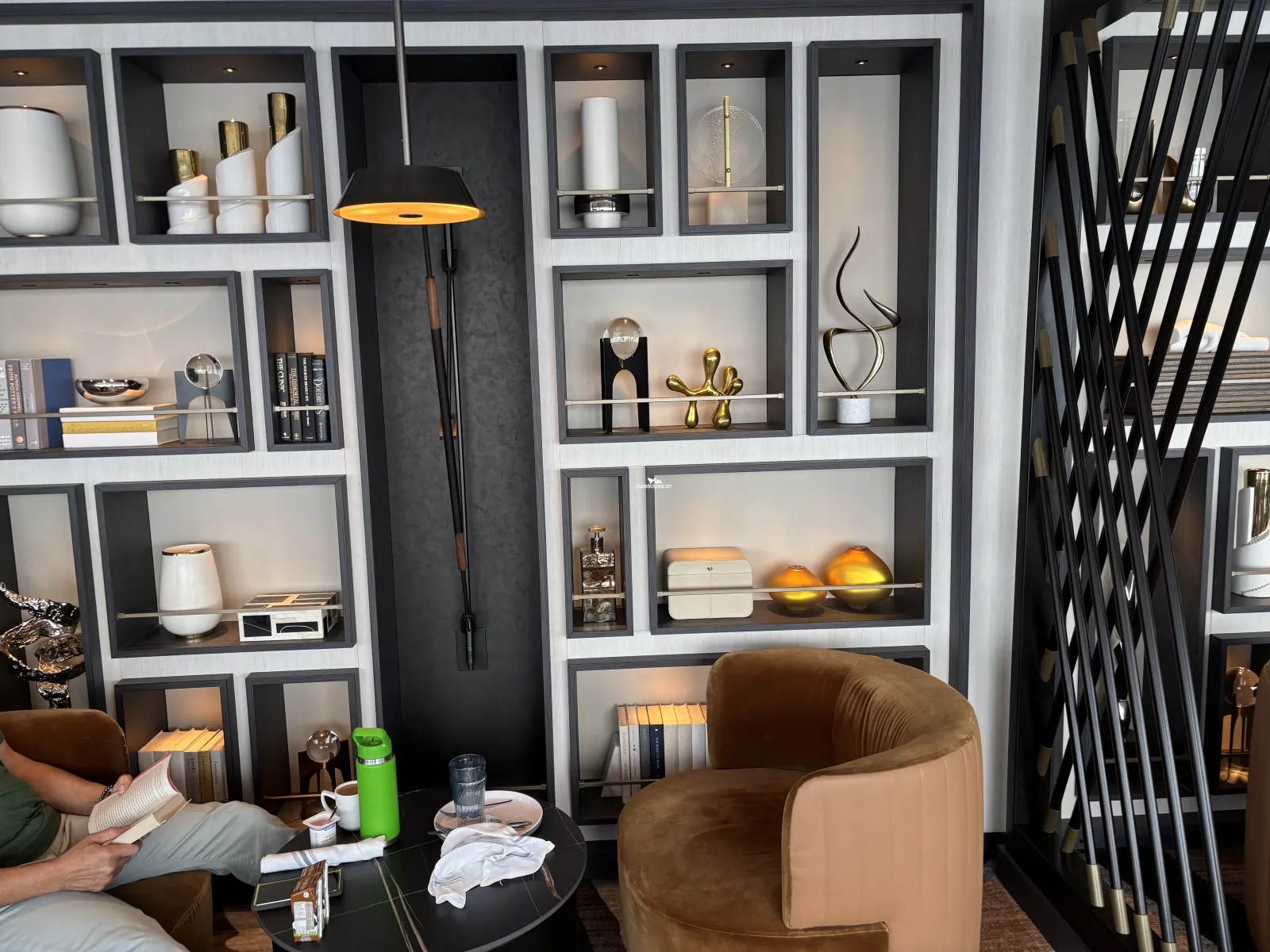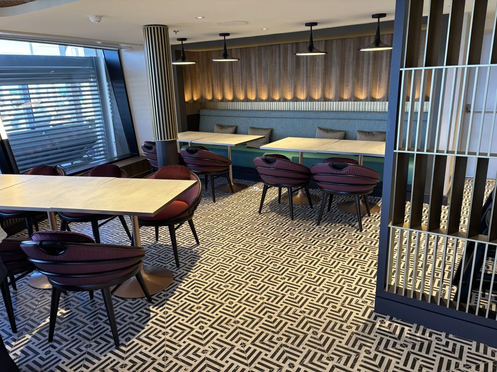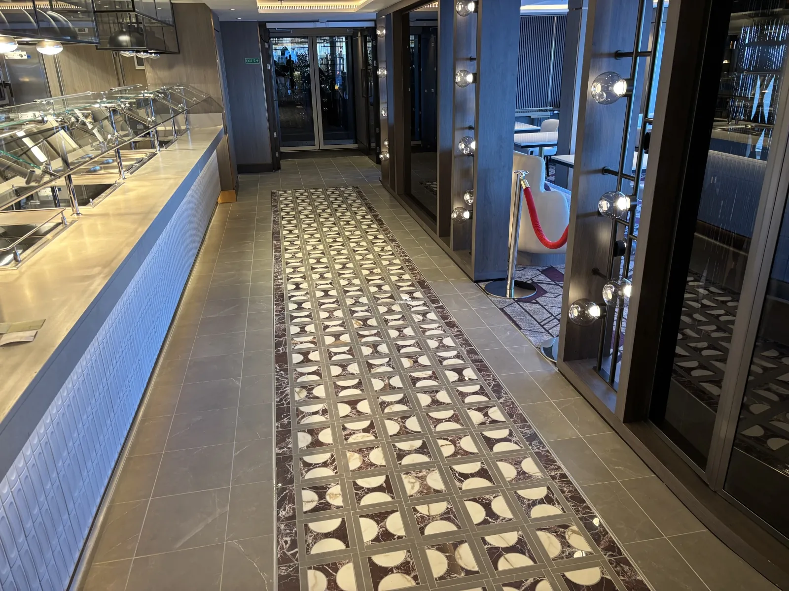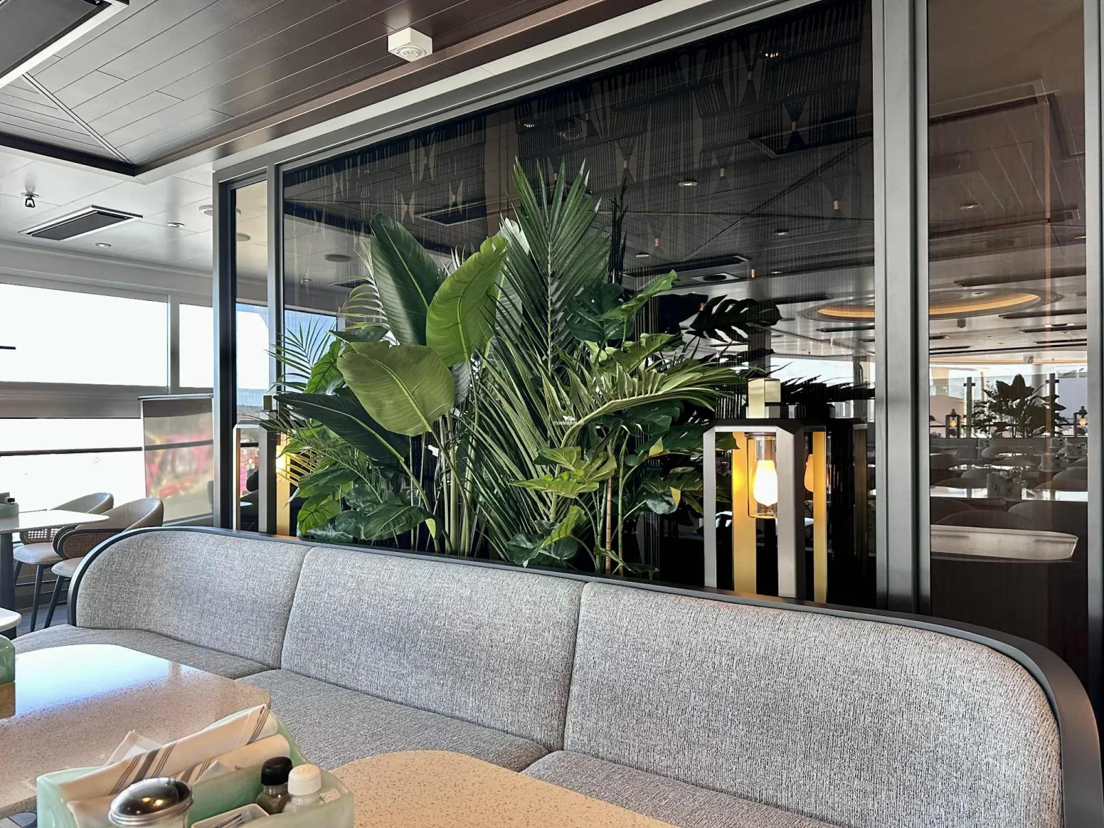 Large floor to ceiling windows featuring lounge and bar. Great view from the top front of the ship.Sukhothai