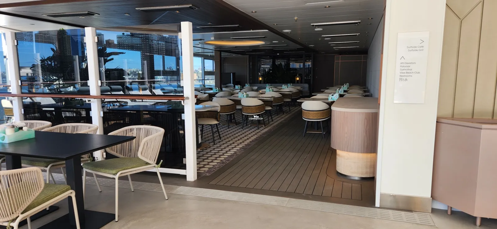Complimentary casual buffet style dining. Indoor seating with floor-to-ceiling windows. Outdoor seating also available.Observation Lounge