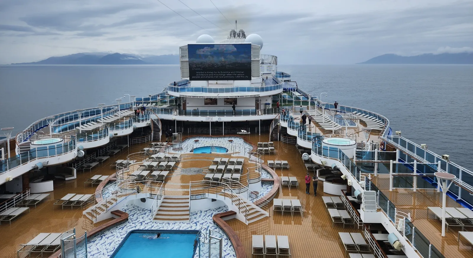 The ship's adult only pool with two hot tubs and four poolside private cabanas. Drinks are available from the sanctuary bar and entertainment is provided from the bandstand at the end of the pool.Remix