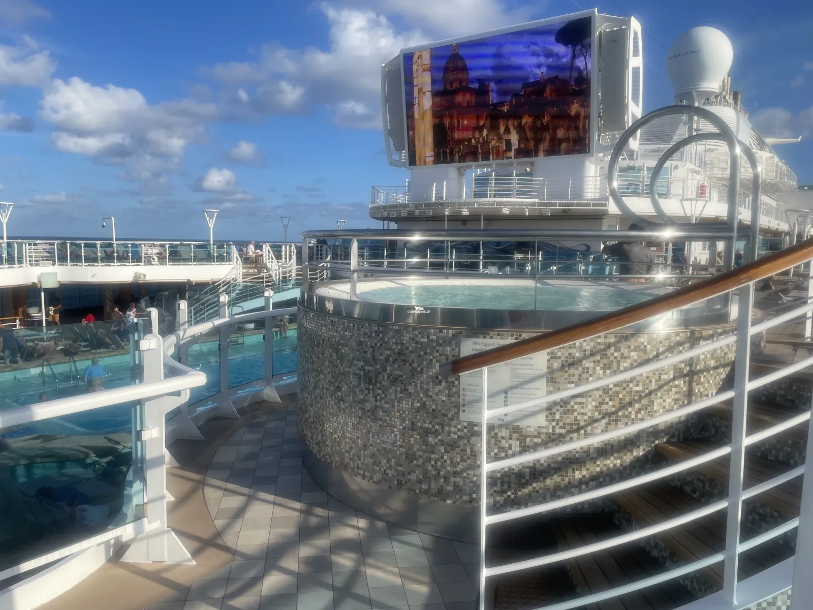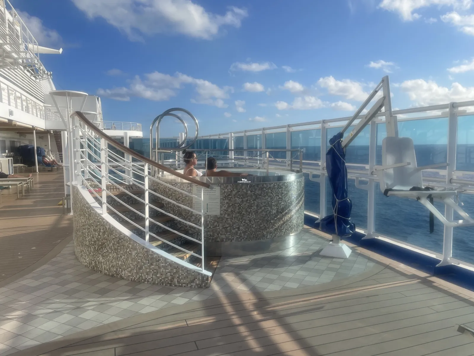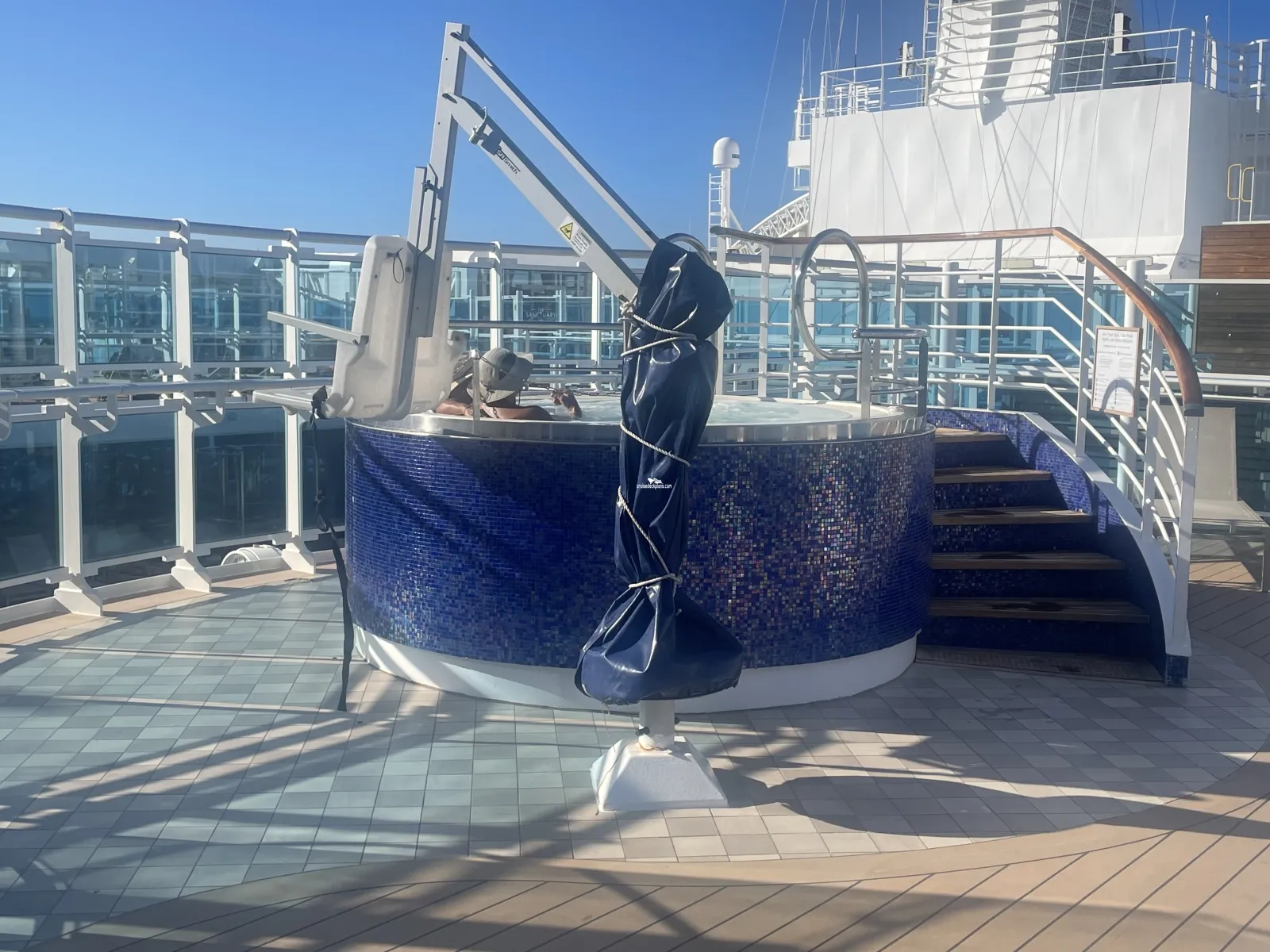 Open air pool area for adults only. Pool and bar located on lower level that is surrounded by staterooms. Upper level is open deck with loungers and two hot tubs.SeaWalk