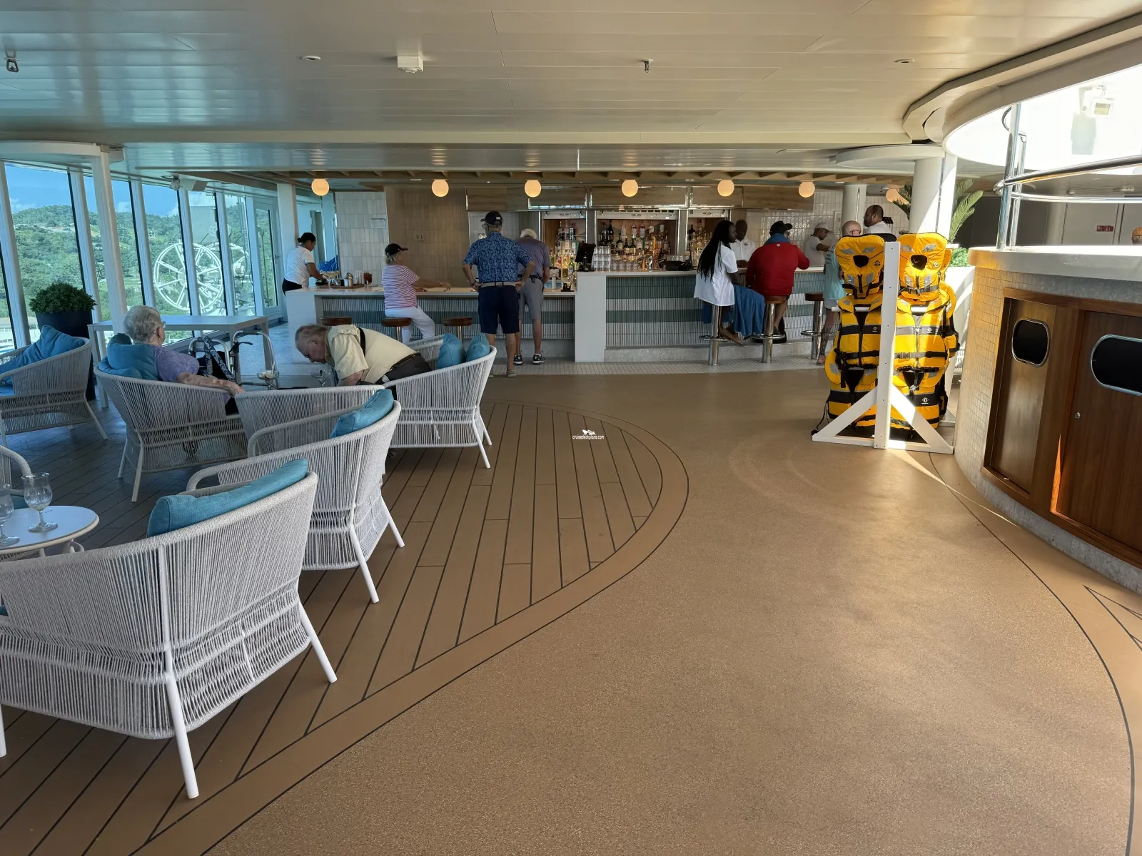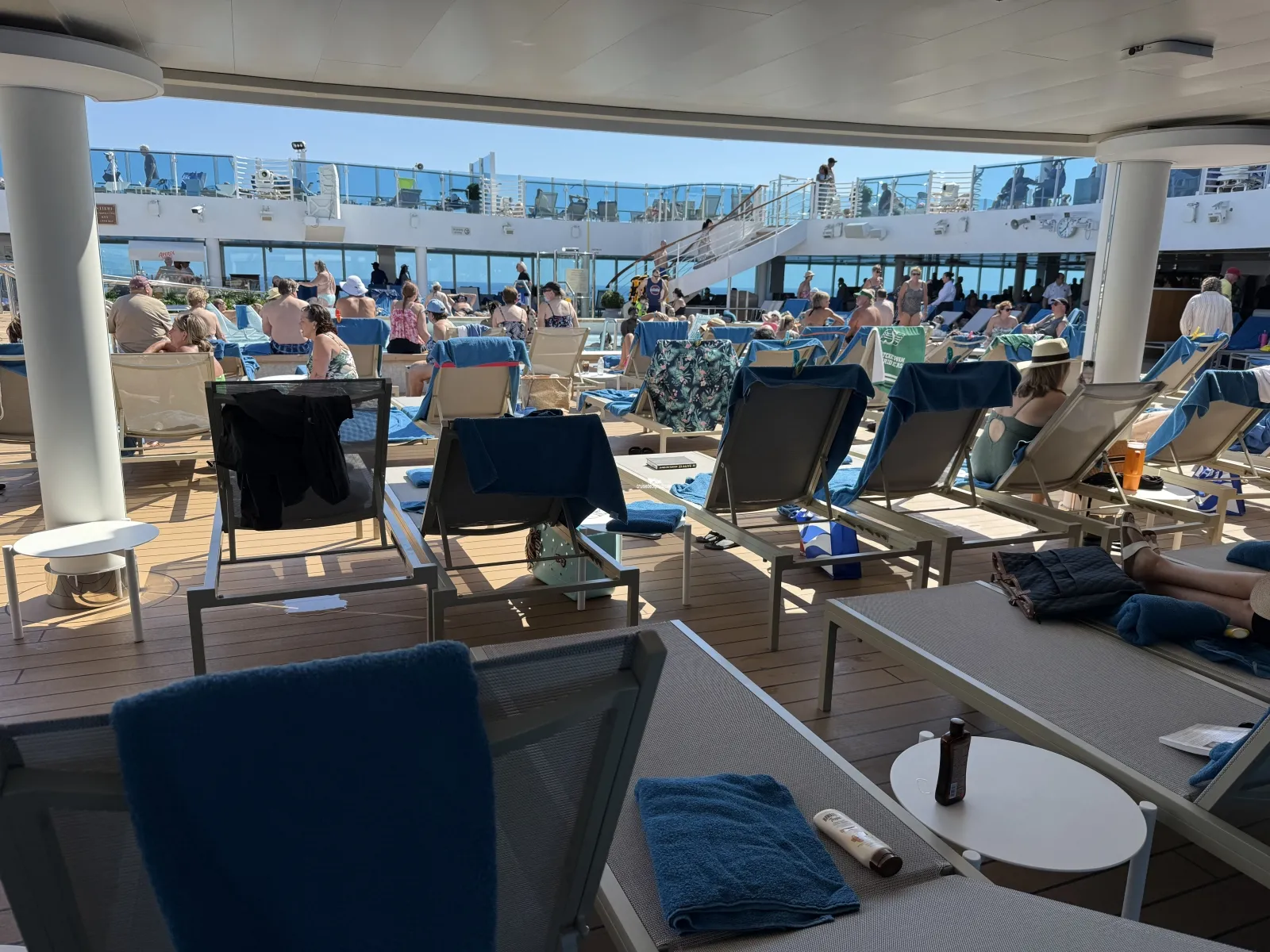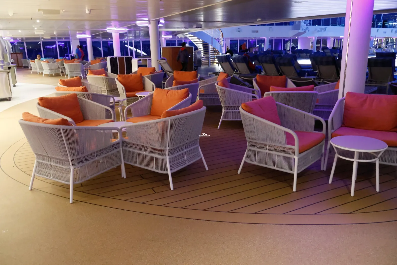 Outdoor loungers and great views from the top front of the ship. There is a bar and pool nearby.Cabin Check Tool