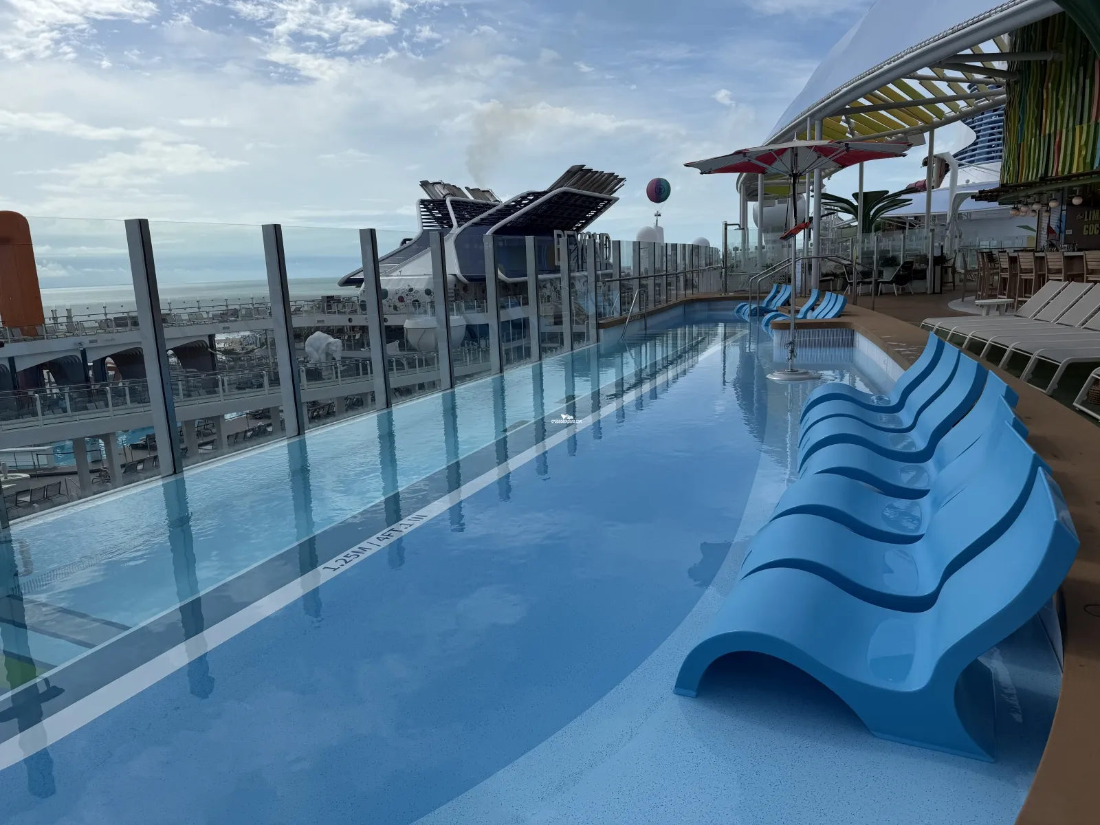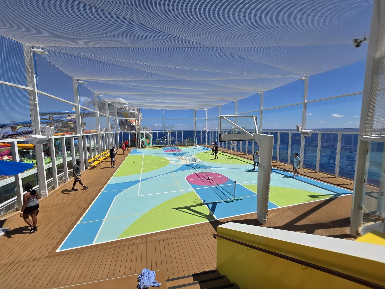 Open-air 4 foot deep narrow pool and nearby cantilevered whirlpool. Plenty of chairs (mostly in the sun). Dedicated Lime & Coconut bar. This is a family pool area.Sports Court