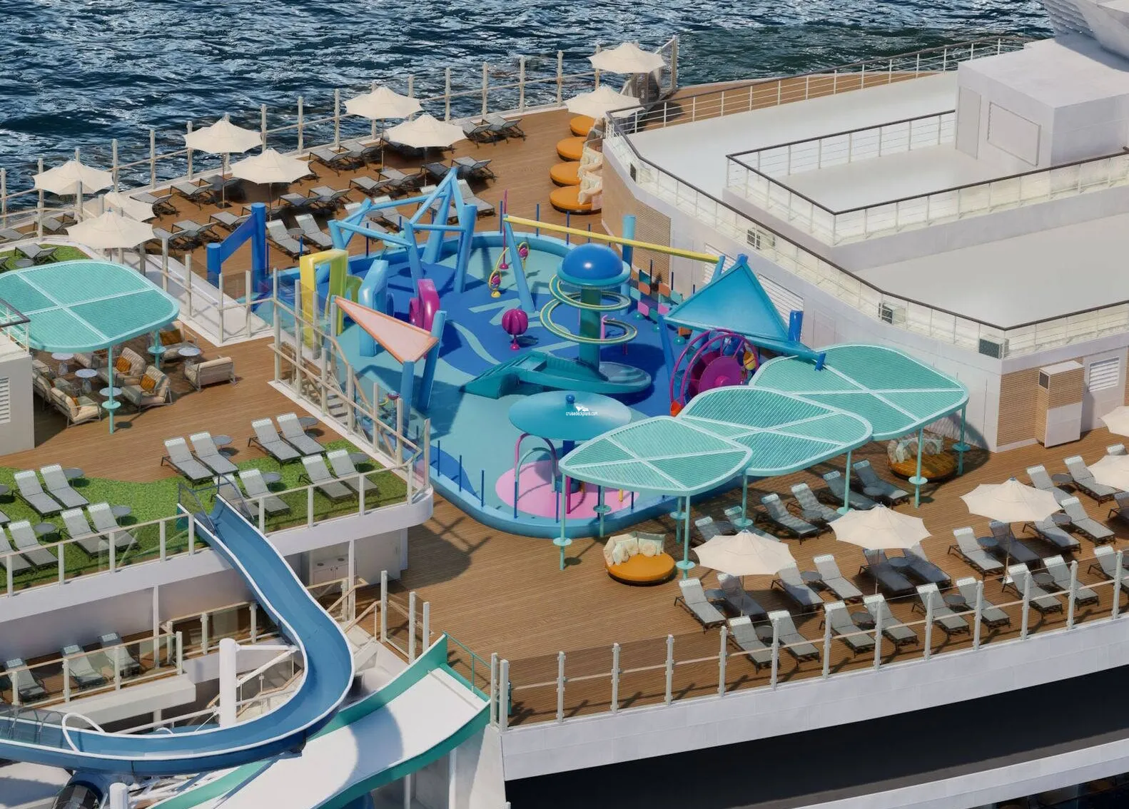 Free fall dry slide 10 stories high from decks 18 to 8.Kids Aqua Park