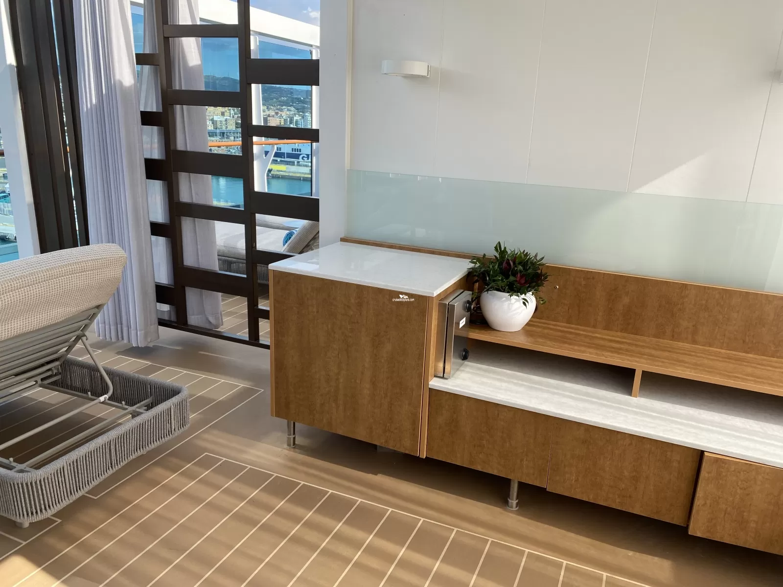 Sun deck with four hot tubs, bar and loungers overlooking the main pool area.Fitness Center