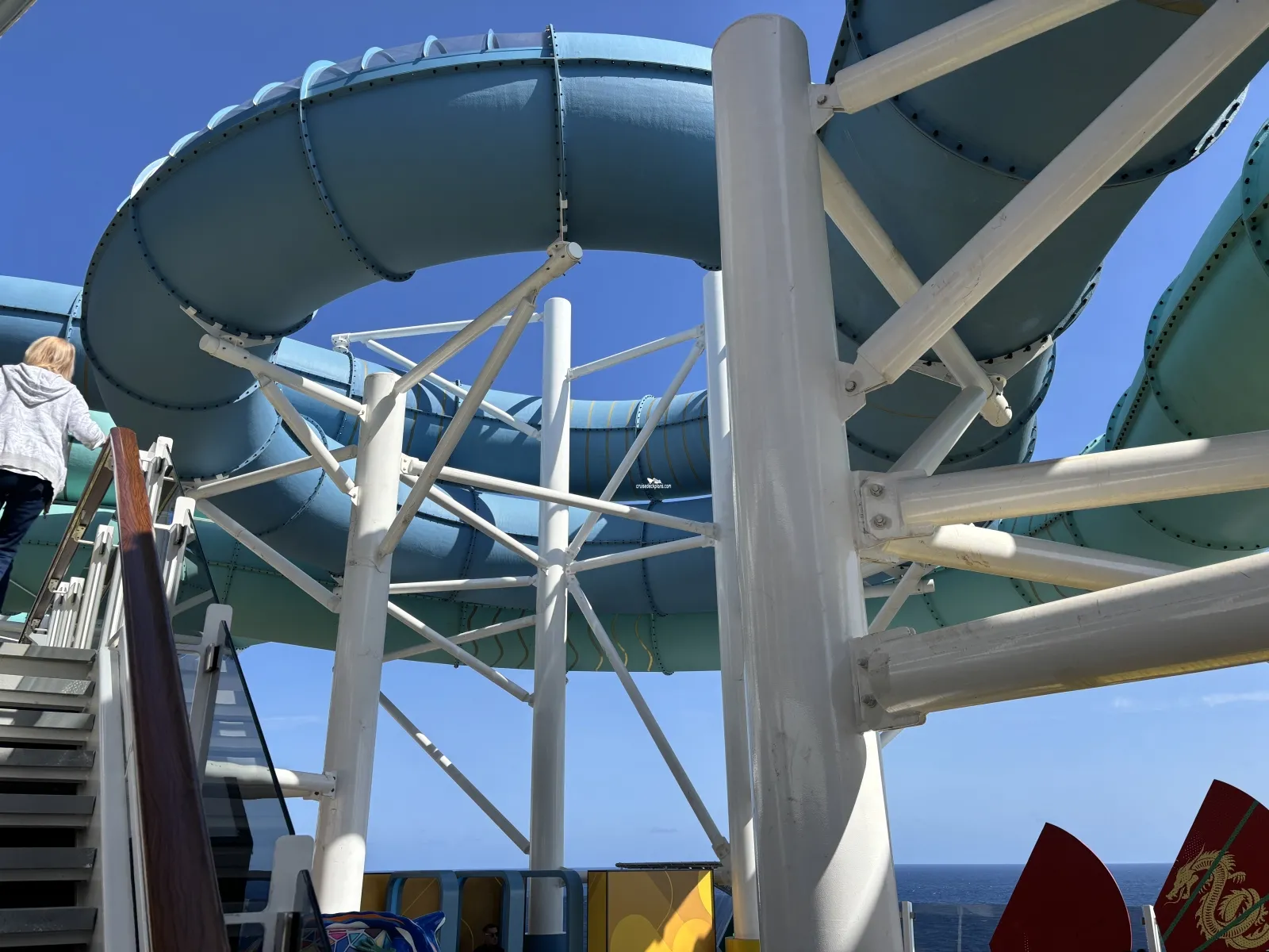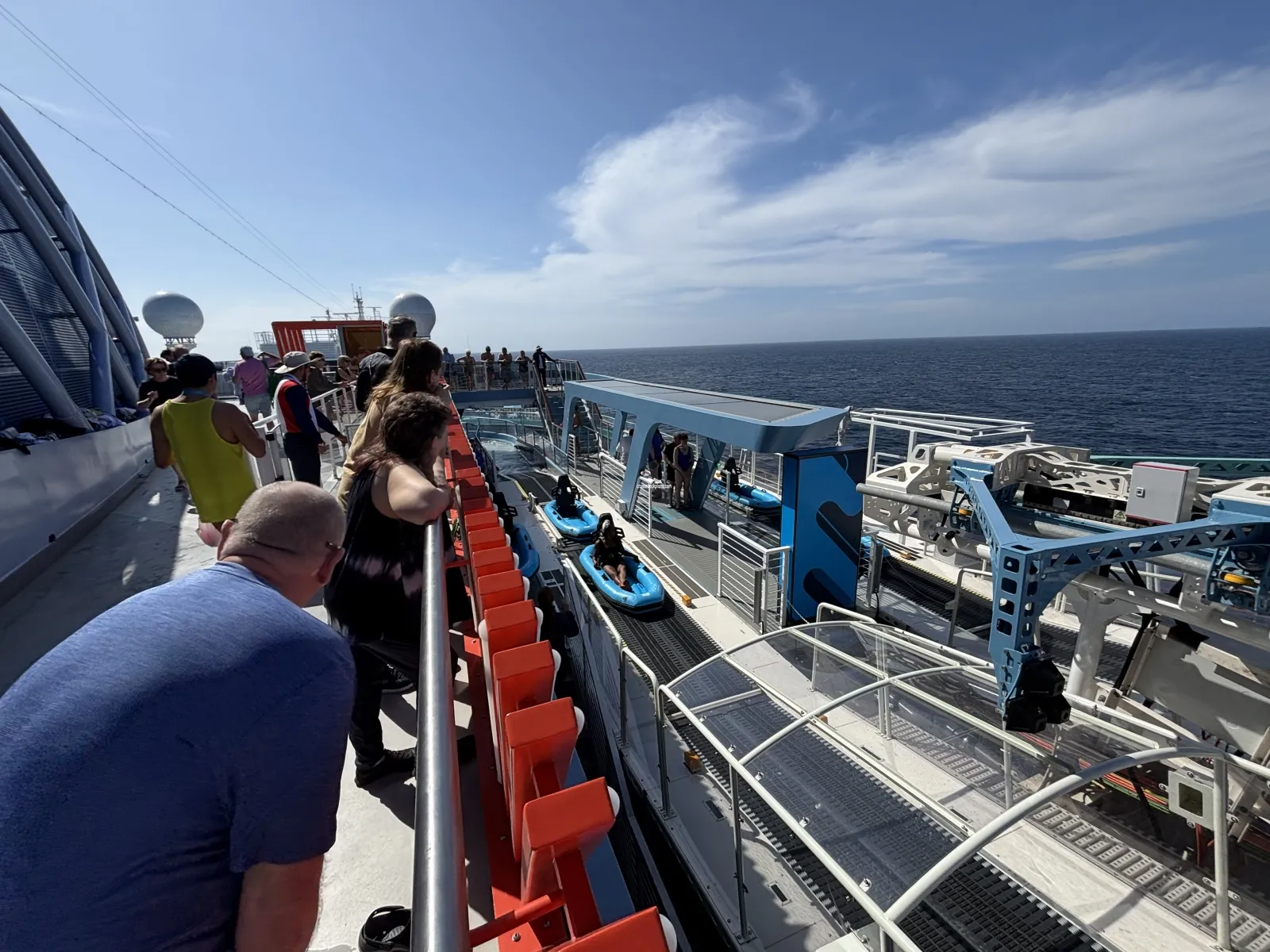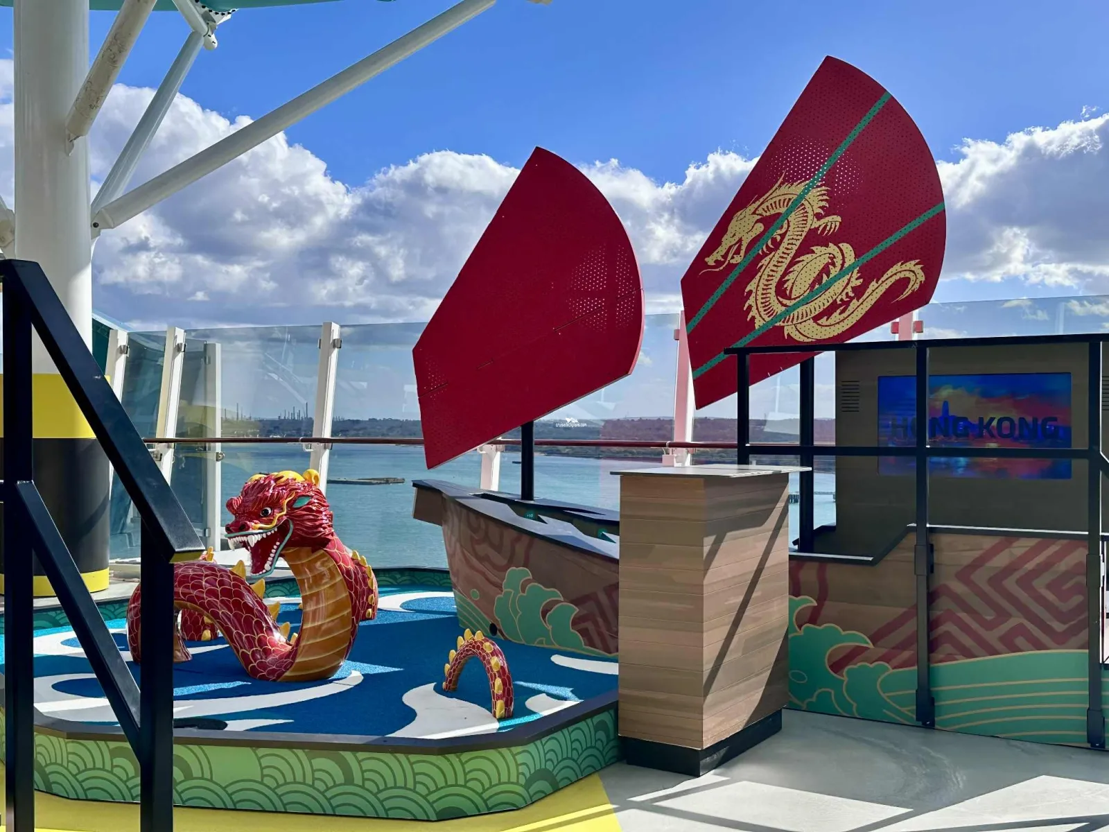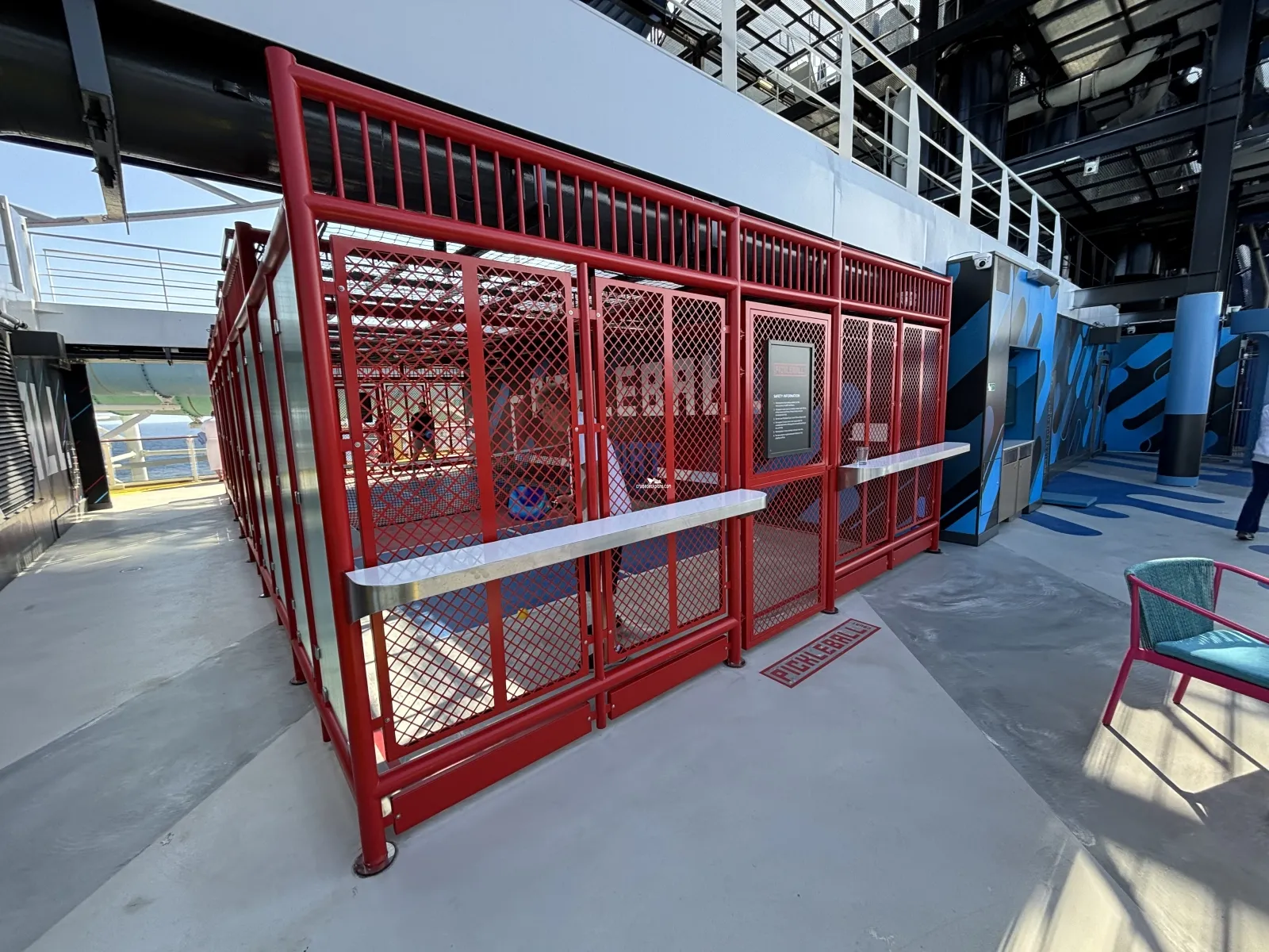 The ride has two tracks and is built to have four sets of two-person rafts in motion at any given time. Loading platform on Deck 18. From there, using powerful magnets riders will be catapulted upward to Deck 20 at speeds of up to 31 miles per hour. The ride consist mostly of opaque tubing but will feature clear sections that will give a brief glimpse of the sea nearly 200 feet below.Pickleball Court