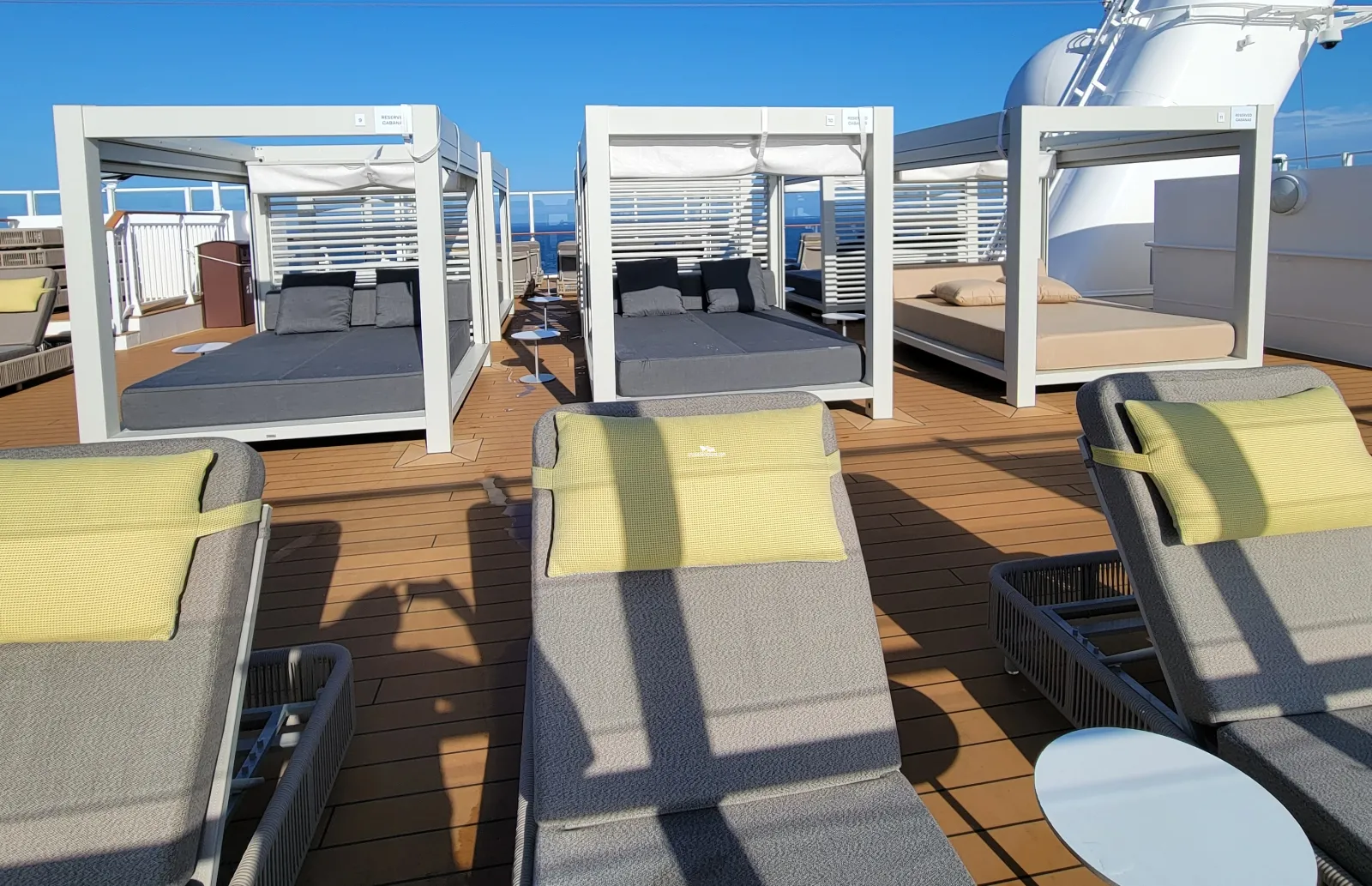 Upper level of the Vibe Beach Club. One of the ship's two over 18's only venues and features an oversized hot tub, luxurious chaise longue and a relaxing water feature. The Beach Club also has its own full liquor bar, refreshing fruit skewers, water spritzers and chilled towels. To access the facilities guests must purchase an access pass.Cabin Check Tool