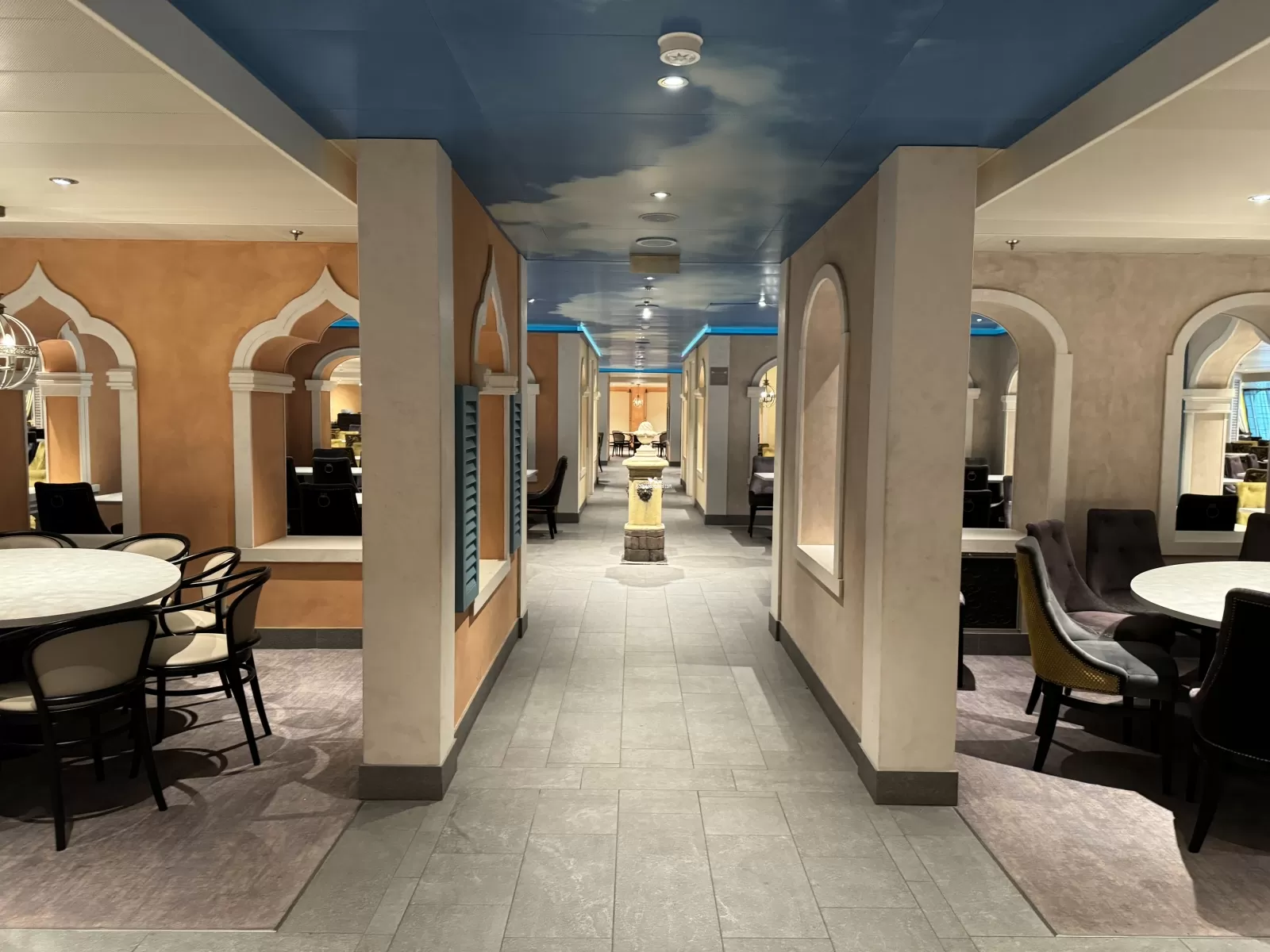 Grand Central Atrium with its own bar on Deck 3. Spans decks 3, 4, and 5. This is the main entrance of the ship with its own seating and dance floor. Features live music during day and night.Marco Polo Restaurant