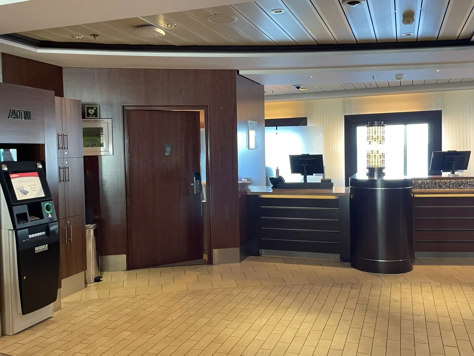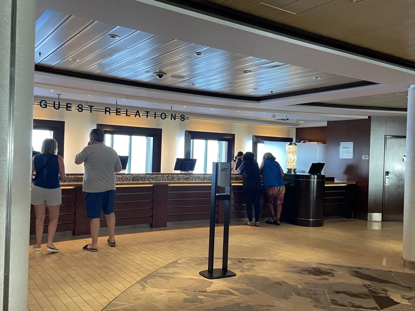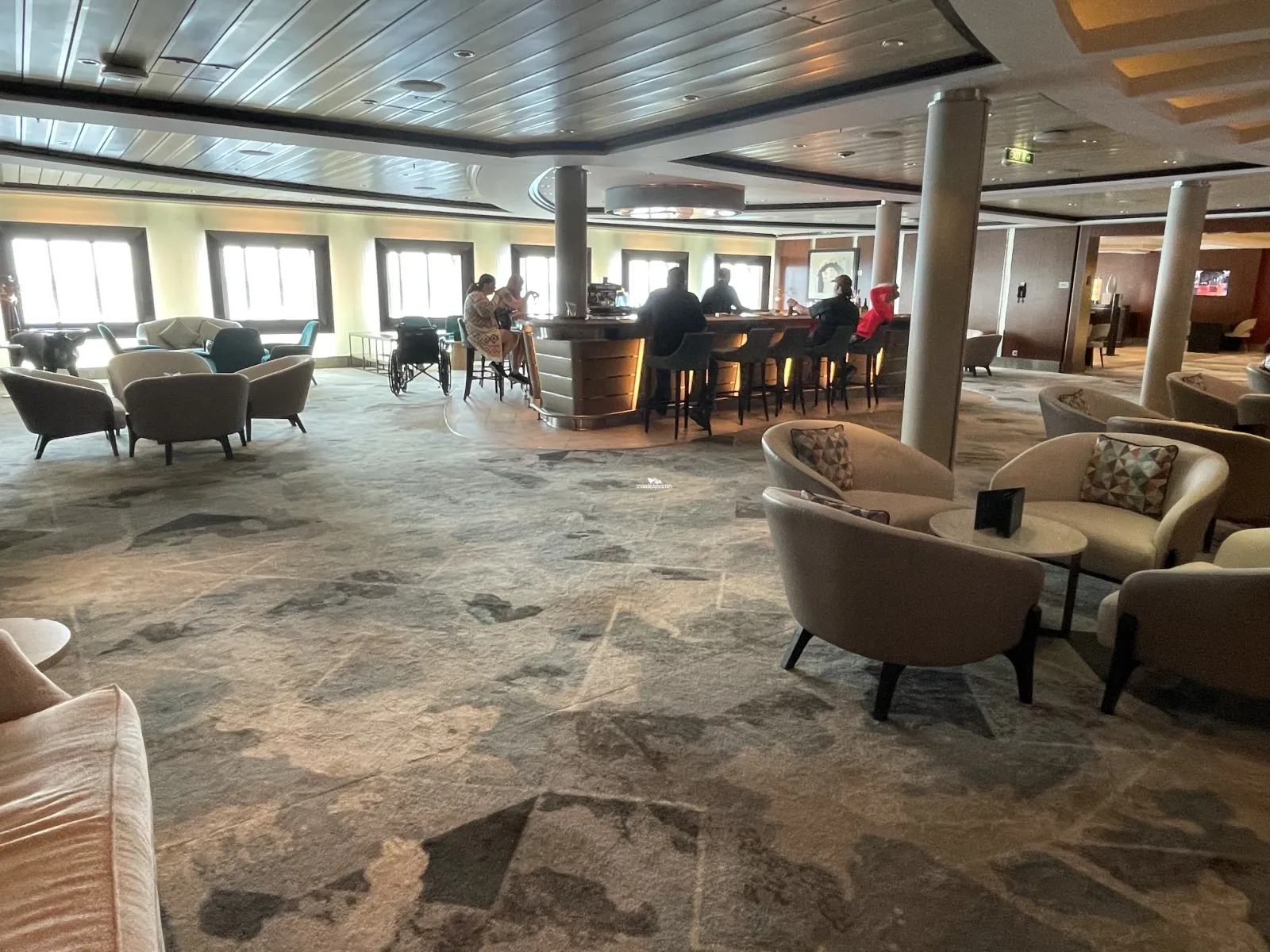 Atrium that spans mulitple decks. On first level you will find Passport Bar, Shore Excursions and Guest Relations with plenty of lounge chairs.Guest Relations