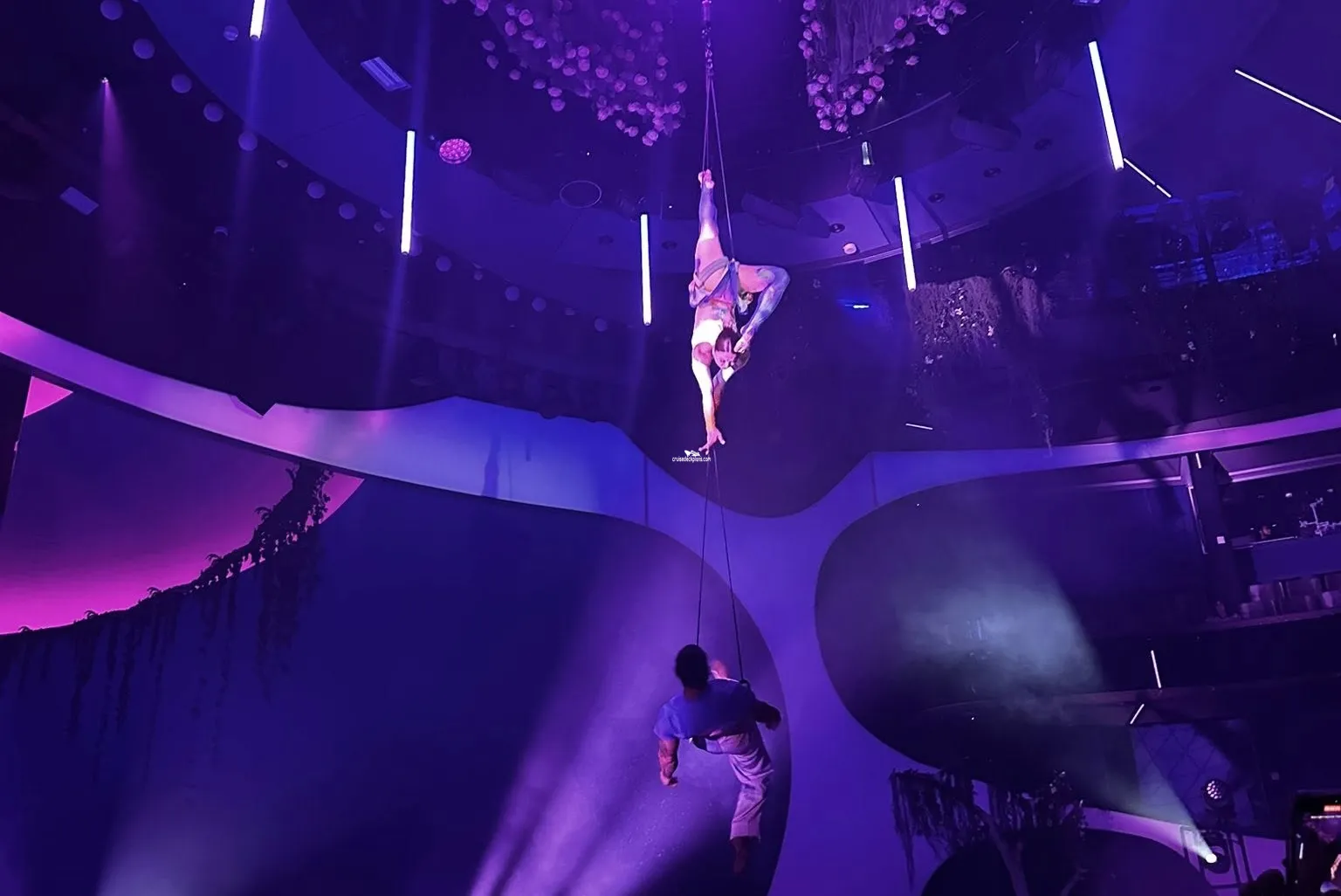 Three level high main theater where the stage extends into the audience. A duo-directional rotating platform rasises almost 7 feet above the stage. There are also two rotating staircases, 10 synchronized panoramic screens, 16 video mapping laser projectors, aerial performance rigging.Camp at Sea