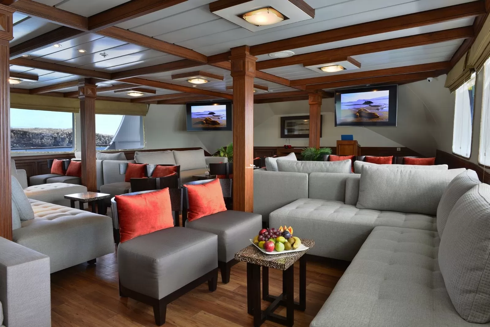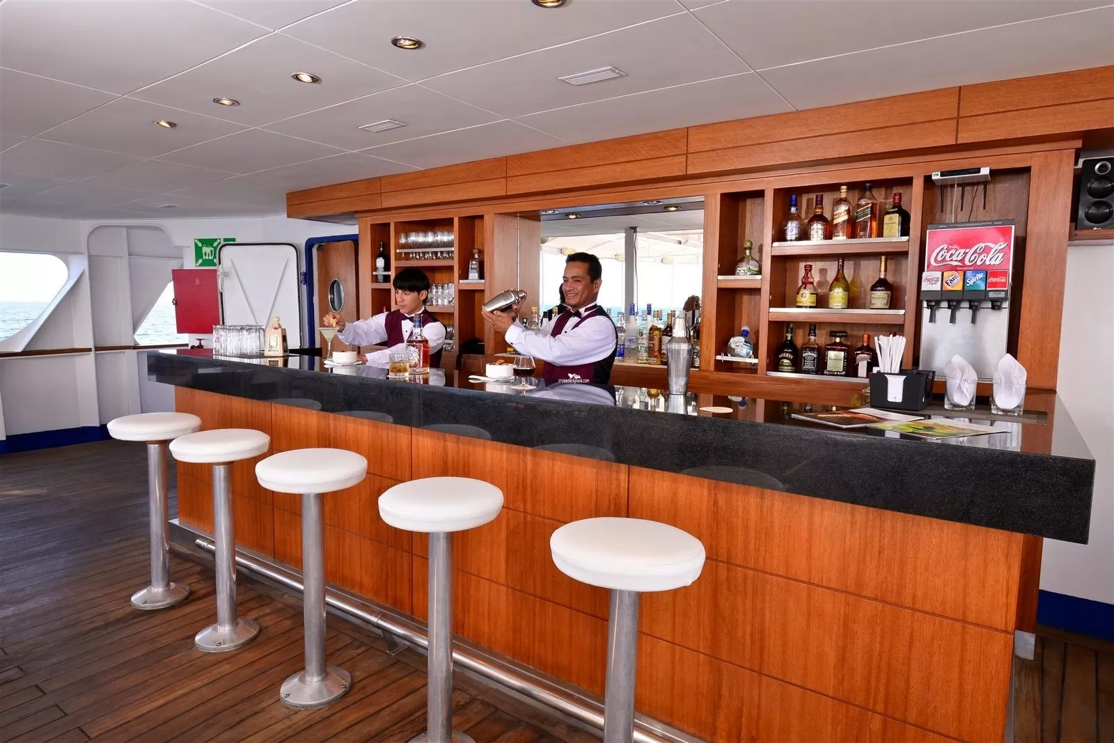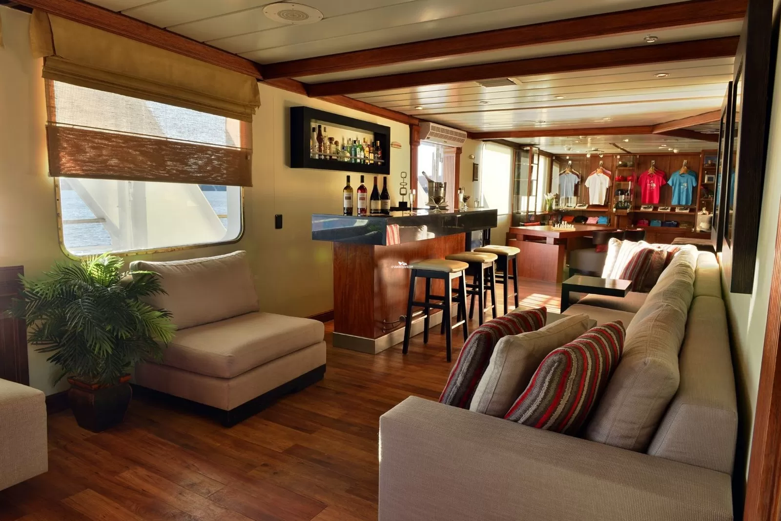 The main lounge provides a relaxed atmosphere for socializing, watching documentaries or sipping a cocktail at the lounge bar. There is comfortable seating, perfect for the nightly briefings and lectures given by our naturalist guides who bring this complex region to life and illuminate your time in the Galapagos.Lounge Bar