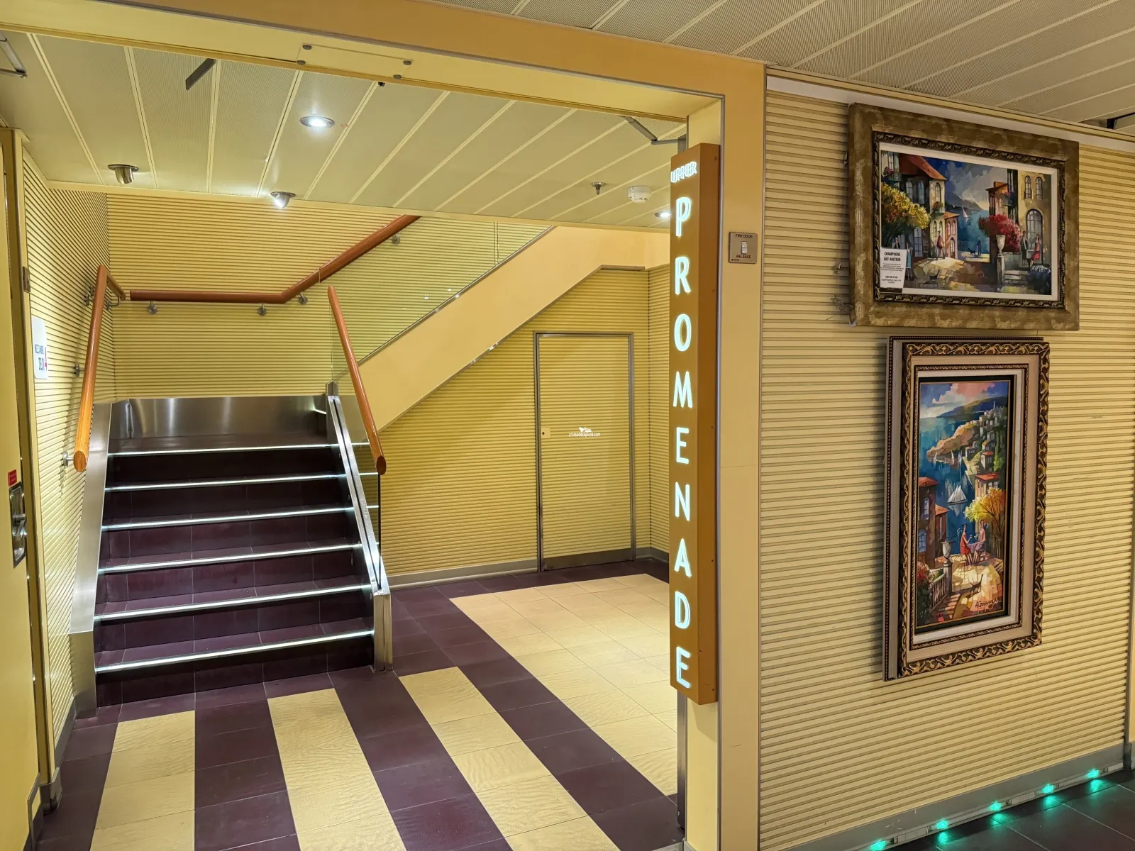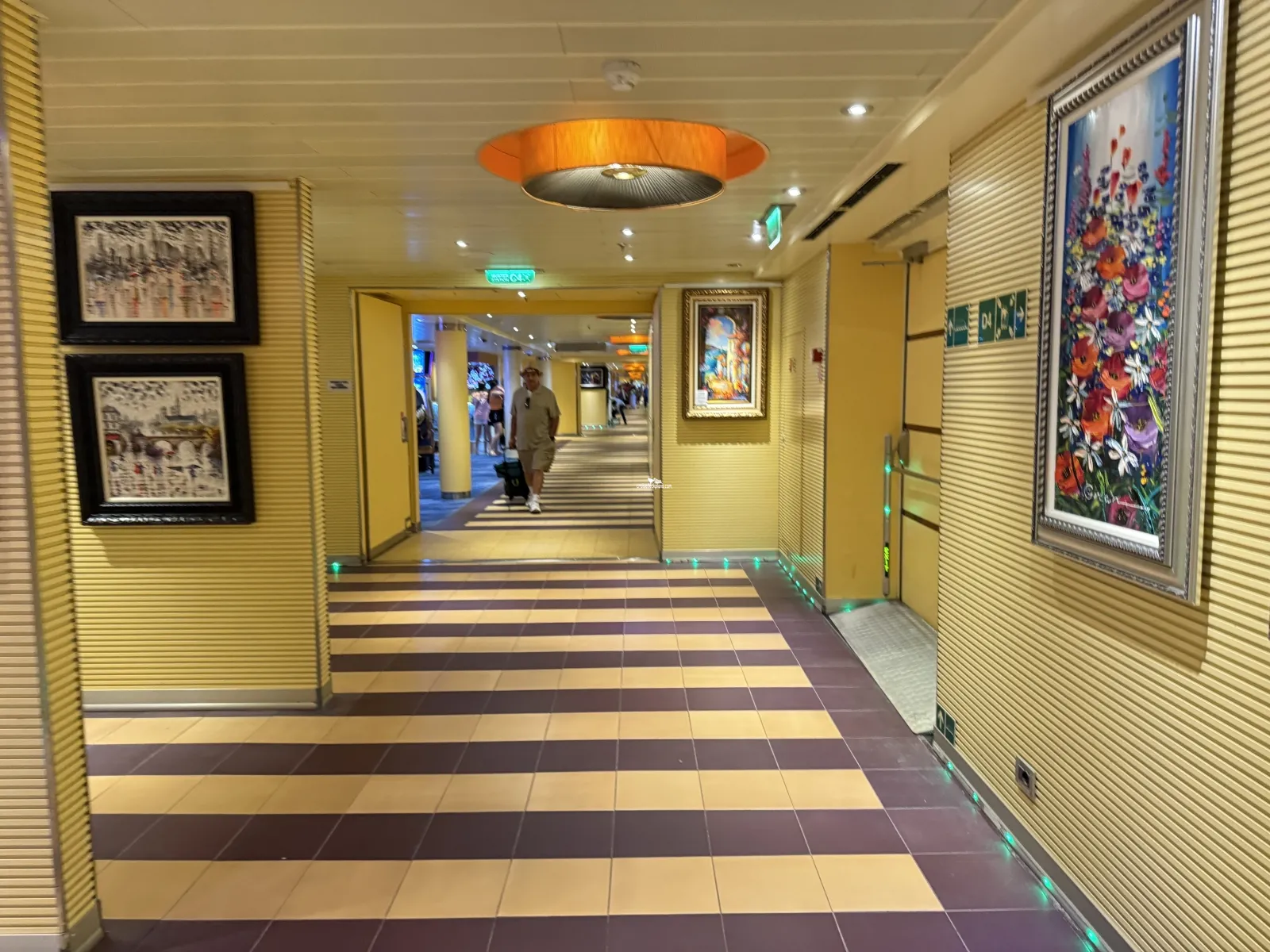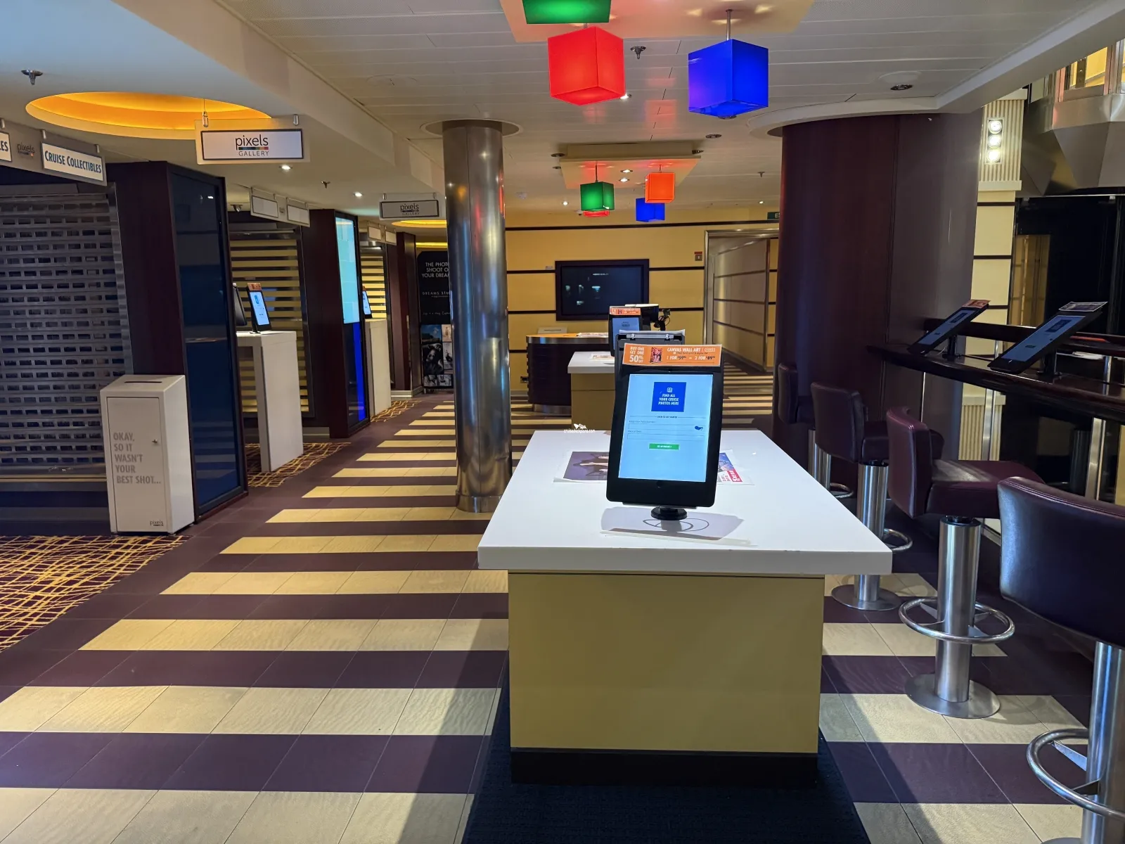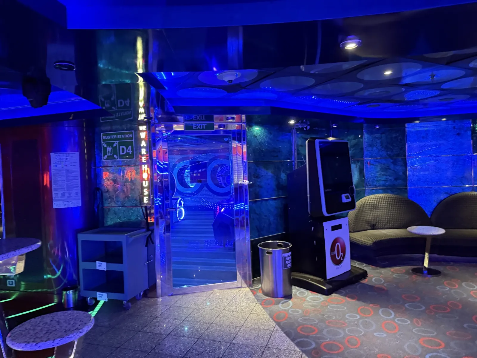 Ships atrium. On first level is dance floor and bar, lounge area, guest services desk, shore excursion desk. This is one of main entrance areas of the ship. Guest services is open 24 hours a day and also is location for lost and found. Shore excursion desk has information about ship sponsored shore excursions that you can purchase. There is also a seating area, 6 computer terminals for accessing the internet, a dance floor and this area features live music in afternoons and evening.Warehouse