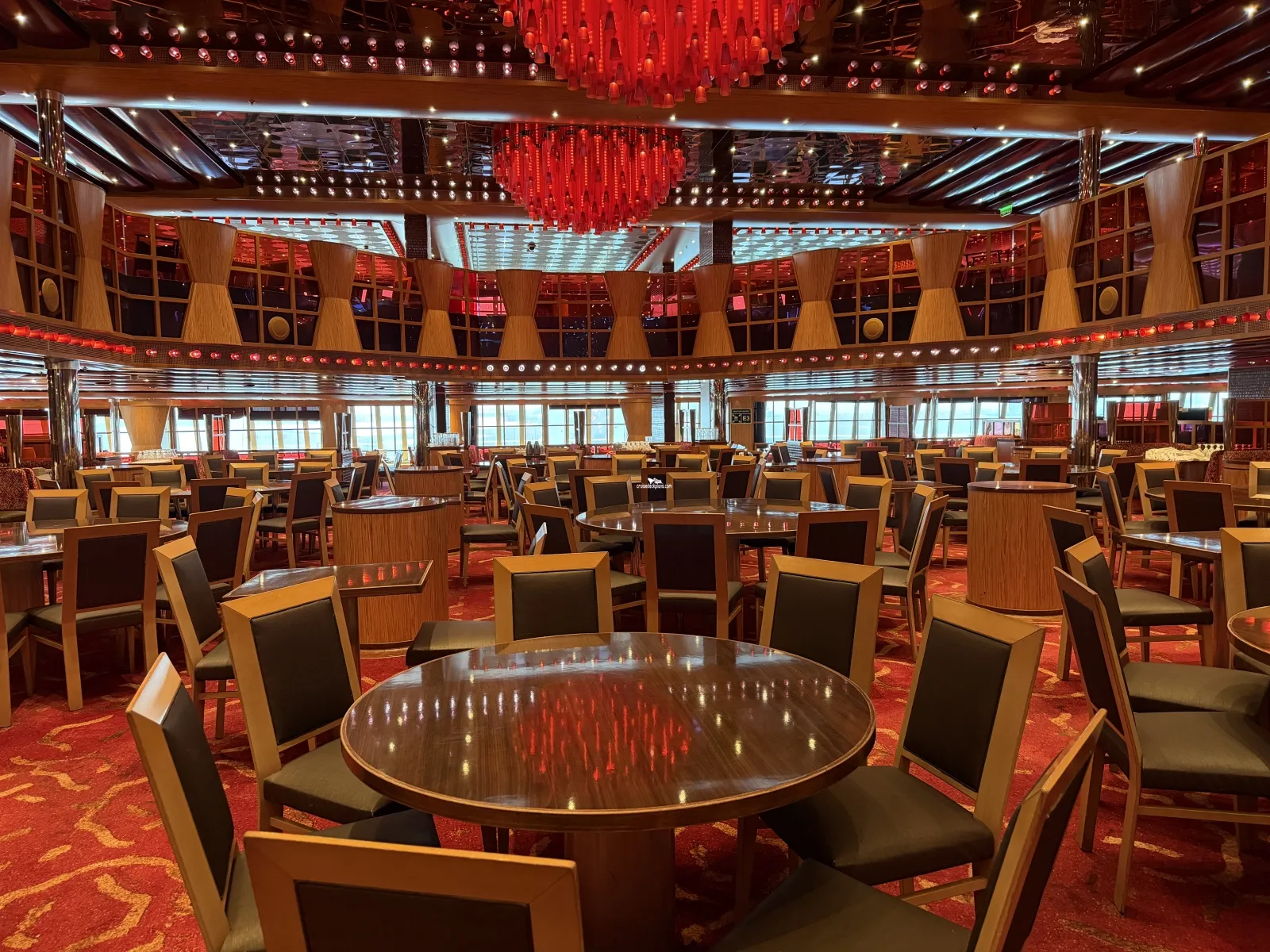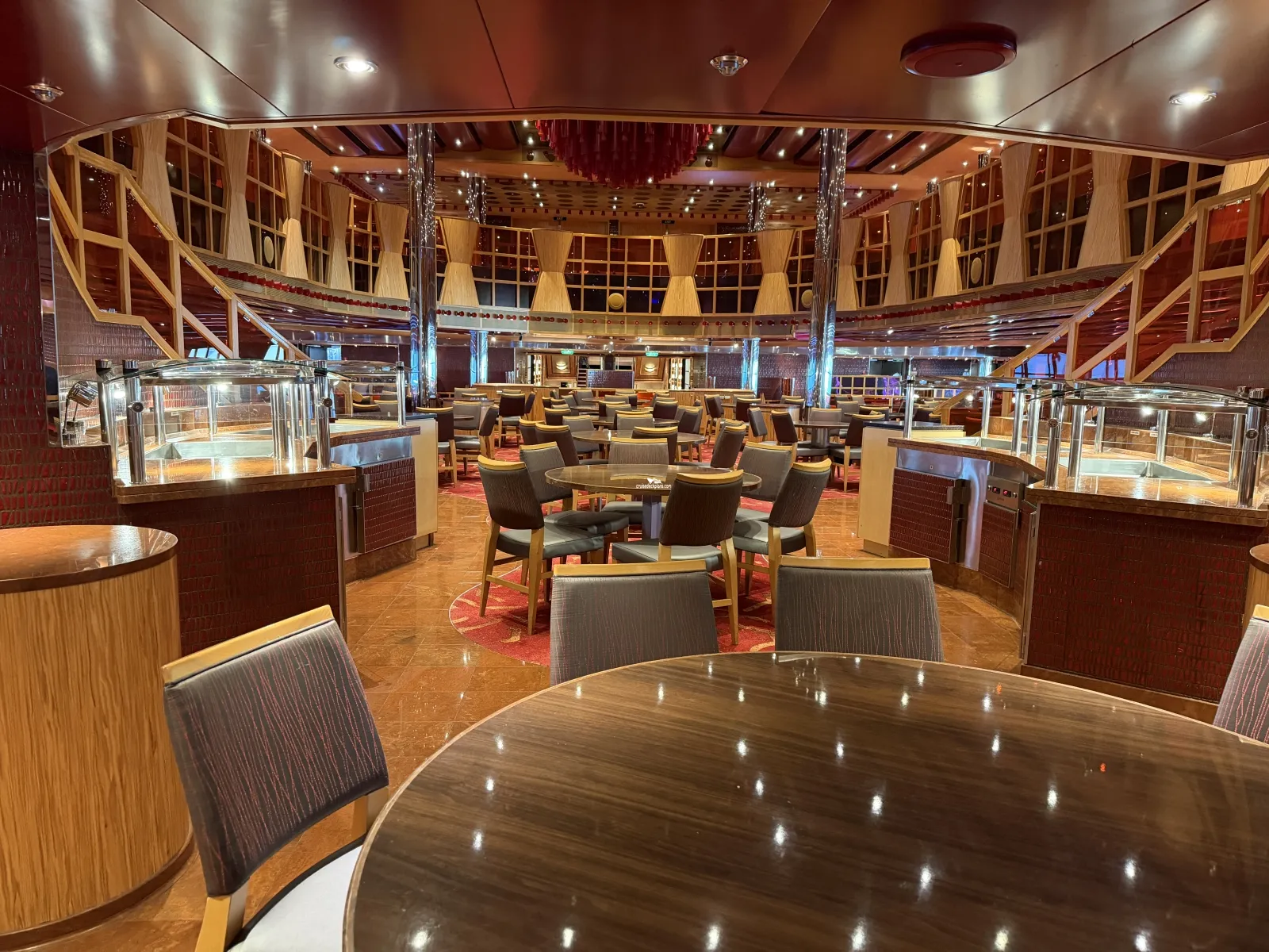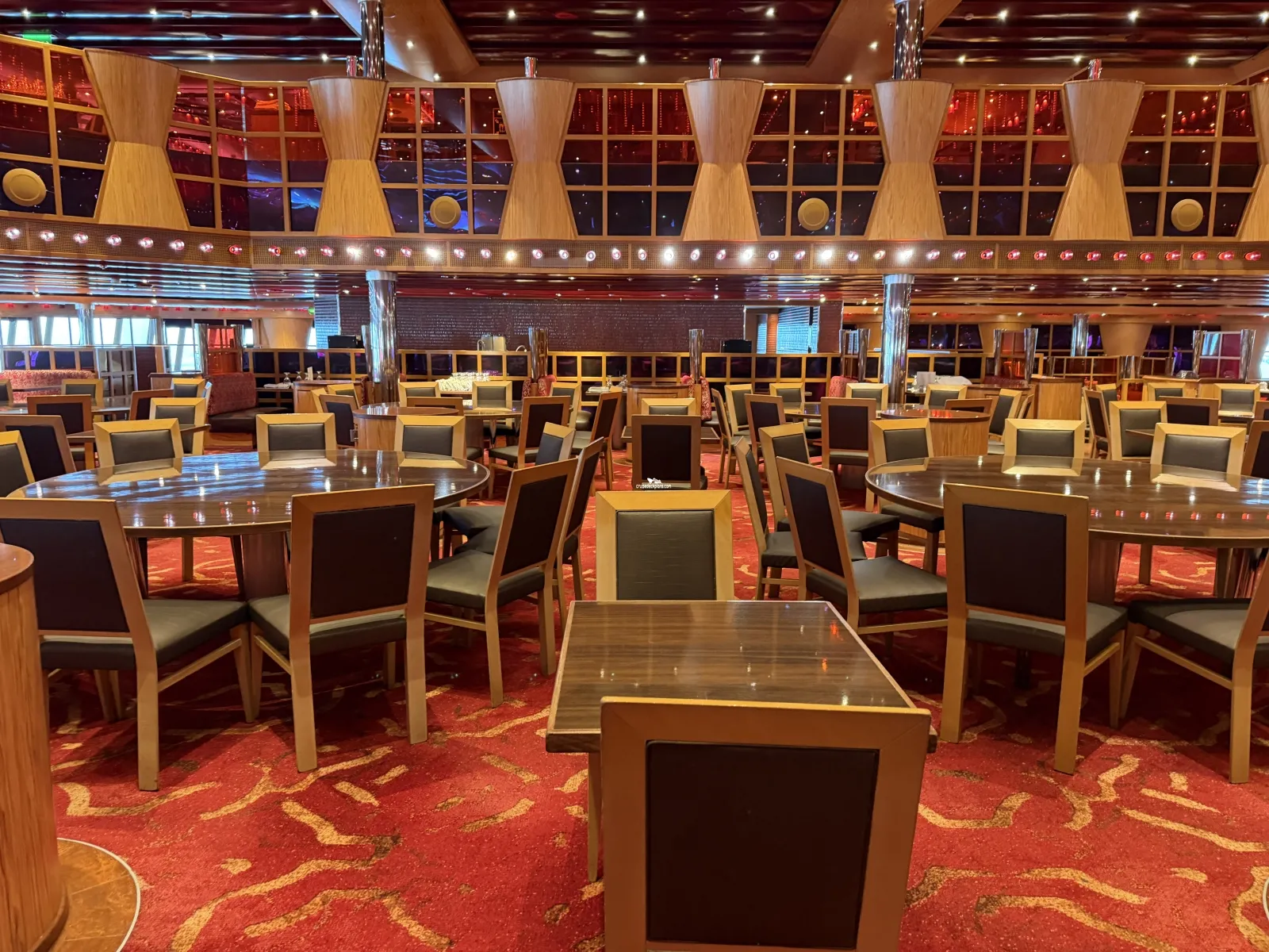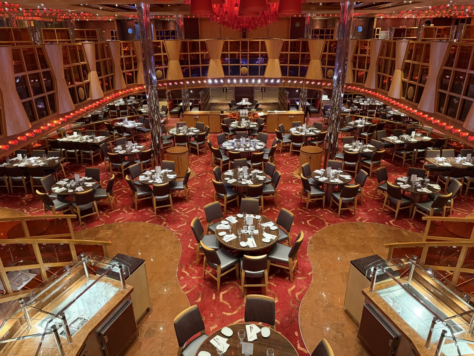 Two level dining room located midship that seats 948 people. Located midship and offers sit-down waiter service. Brunch is served on deck 3 from 8:30 to 1:00 p.m. (sea days.) On port days deck 3 is open from 7:30 to 9:30 (times subject to change) for breakfast. Open nightly for dinner starting at 5:45. Currently you time seating is on deck 3 and assigned dining is on deck 4.The Warehouse