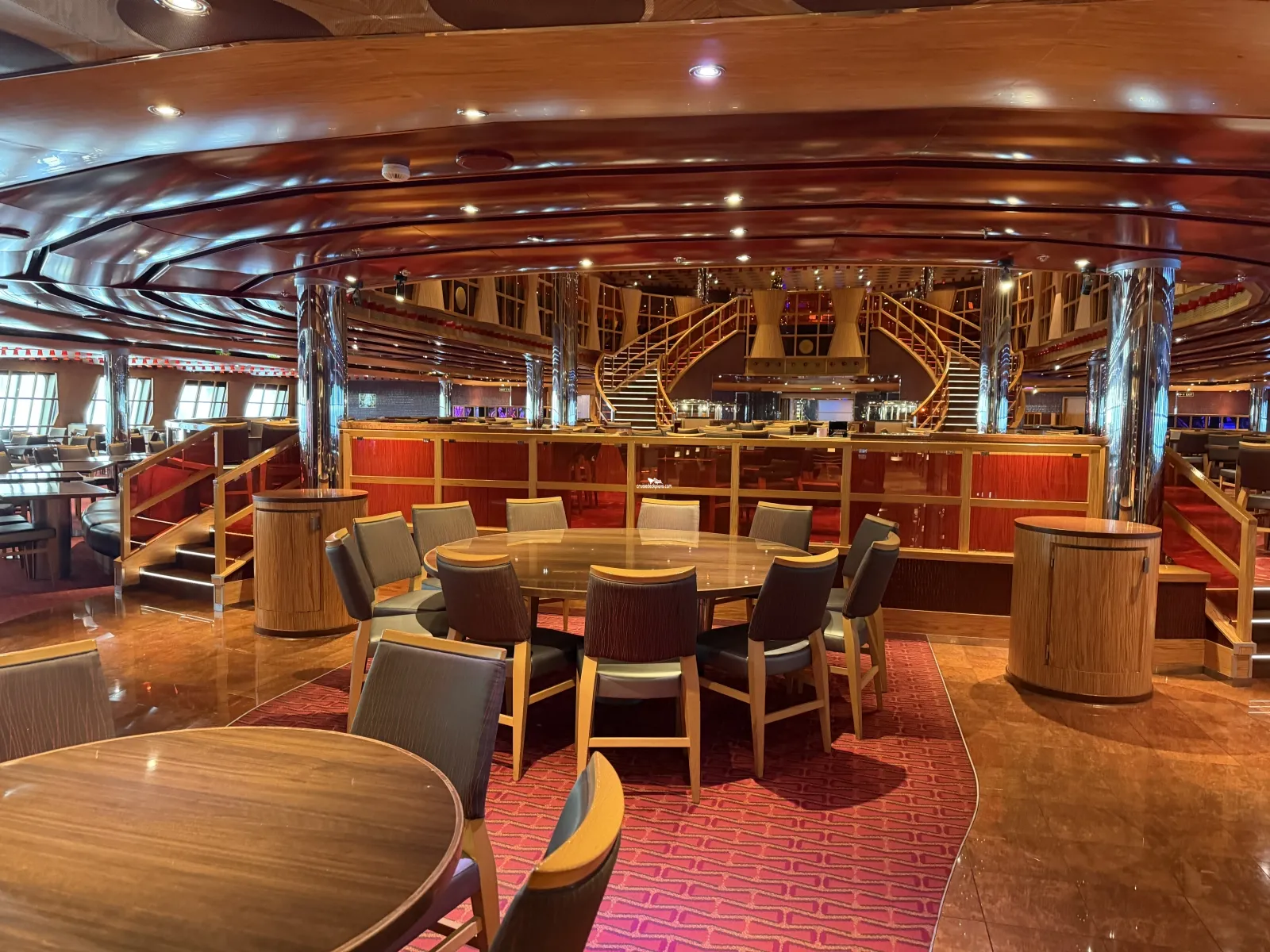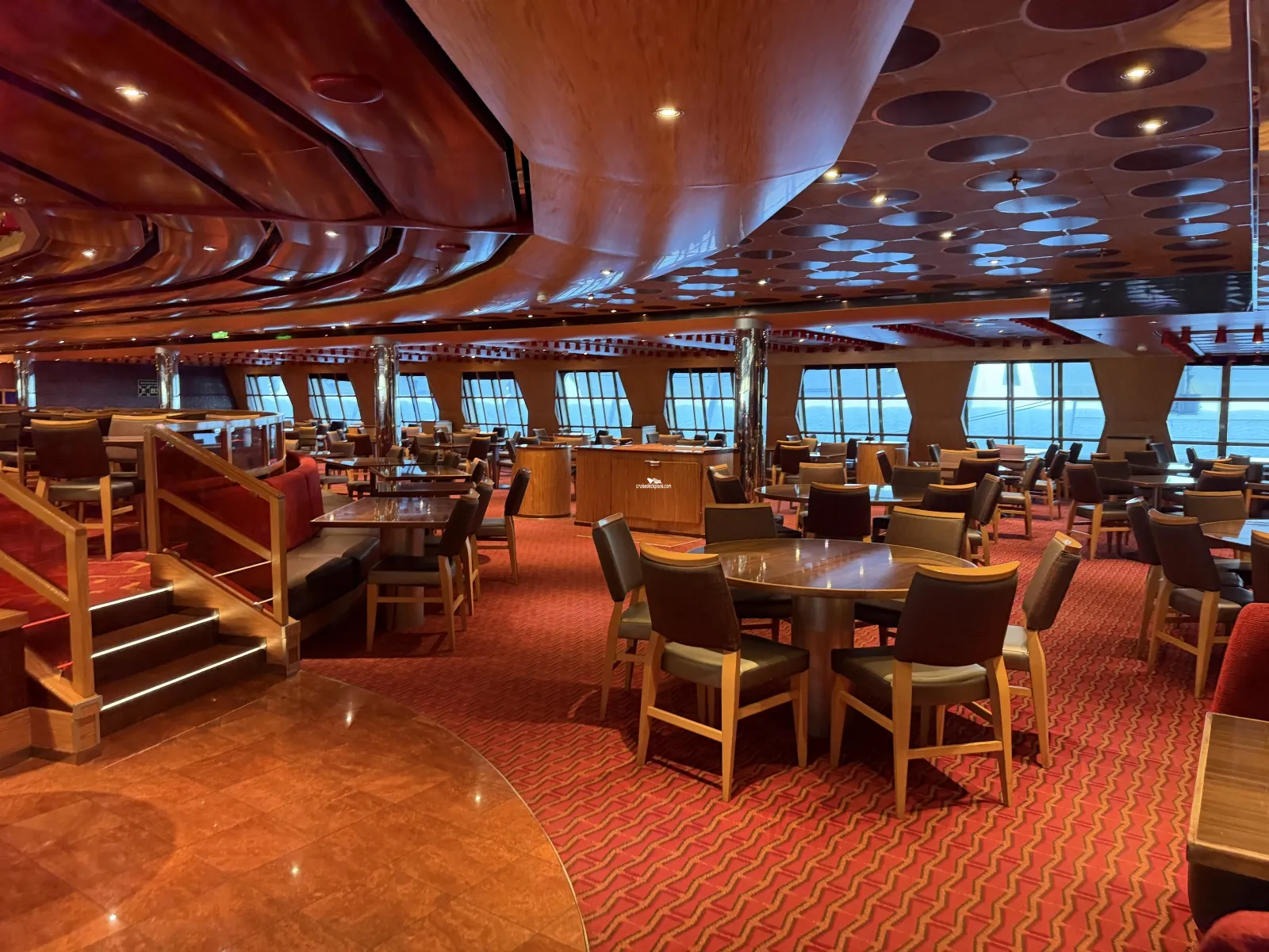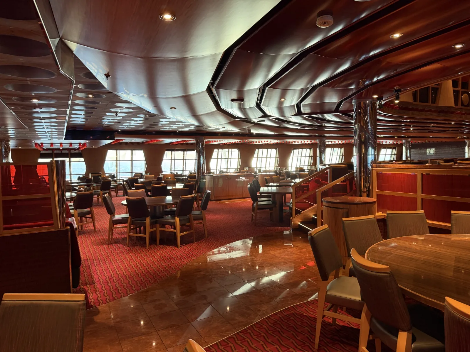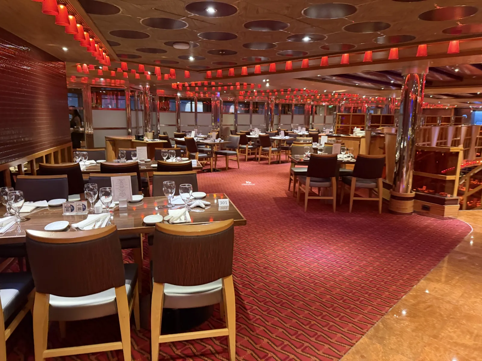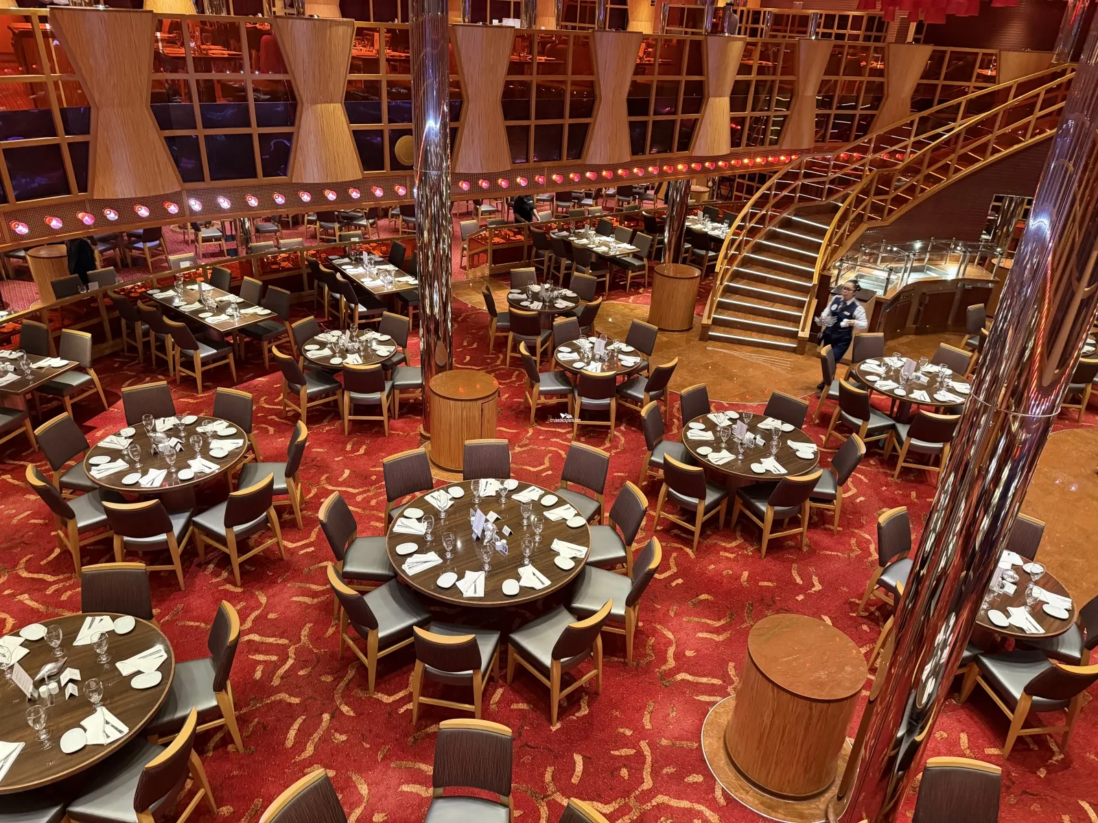 Two level dining room located midship that seats 948 people. Located midship and offers sit-down waiter service. Brunch is served on deck 3 from 8:30 to 1:00 p.m. (sea days.) On port days deck 3 is open from 7:30 to 9:30 (times subject to change) for breakfast. Open nightly for dinner starting at 5:45. Currently you time seating is on deck 3 and assigned dining is on deck 4.The Warehouse