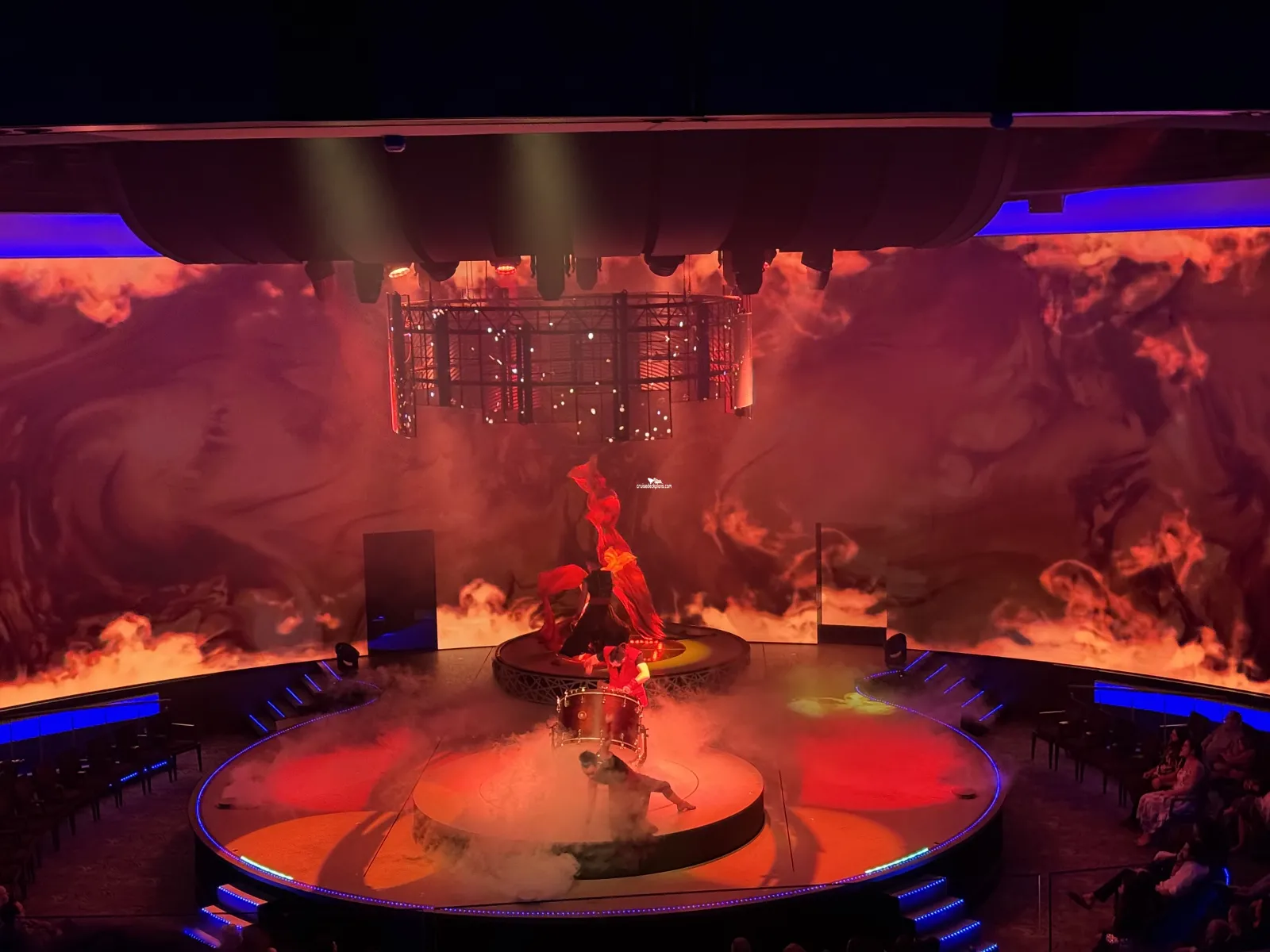 Three level high main theater where the stage extends into the audience. A duo-directional rotating platform rasises almost 7 feet above the stage. There are also two rotating staircases, 10 synchronized panoramic screens, 16 video mapping laser projectors, aerial performance rigging.The Club