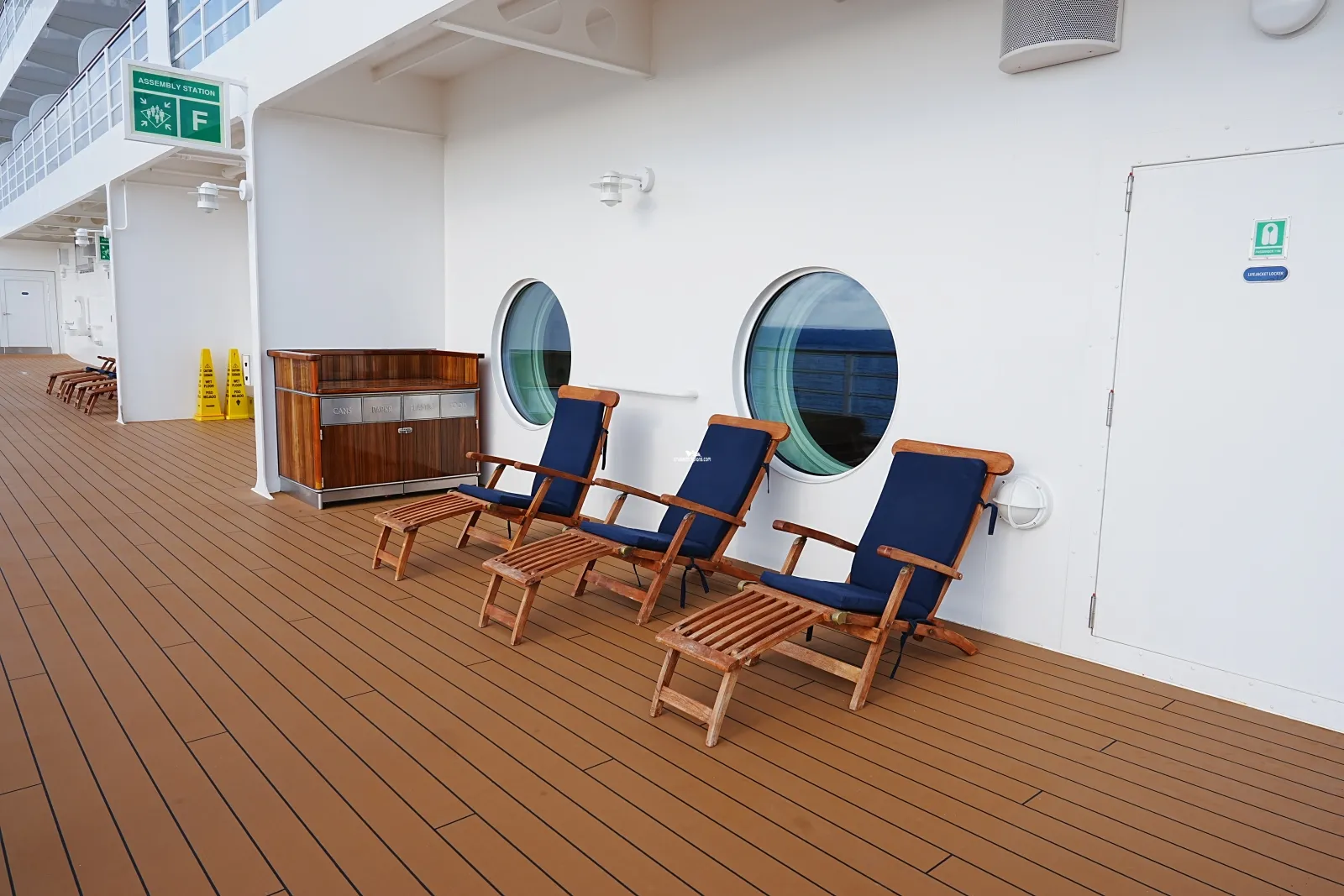 Outside promenade deck below the life boats and extends up to the bow on deck 6 forward.Cabin Check Tool