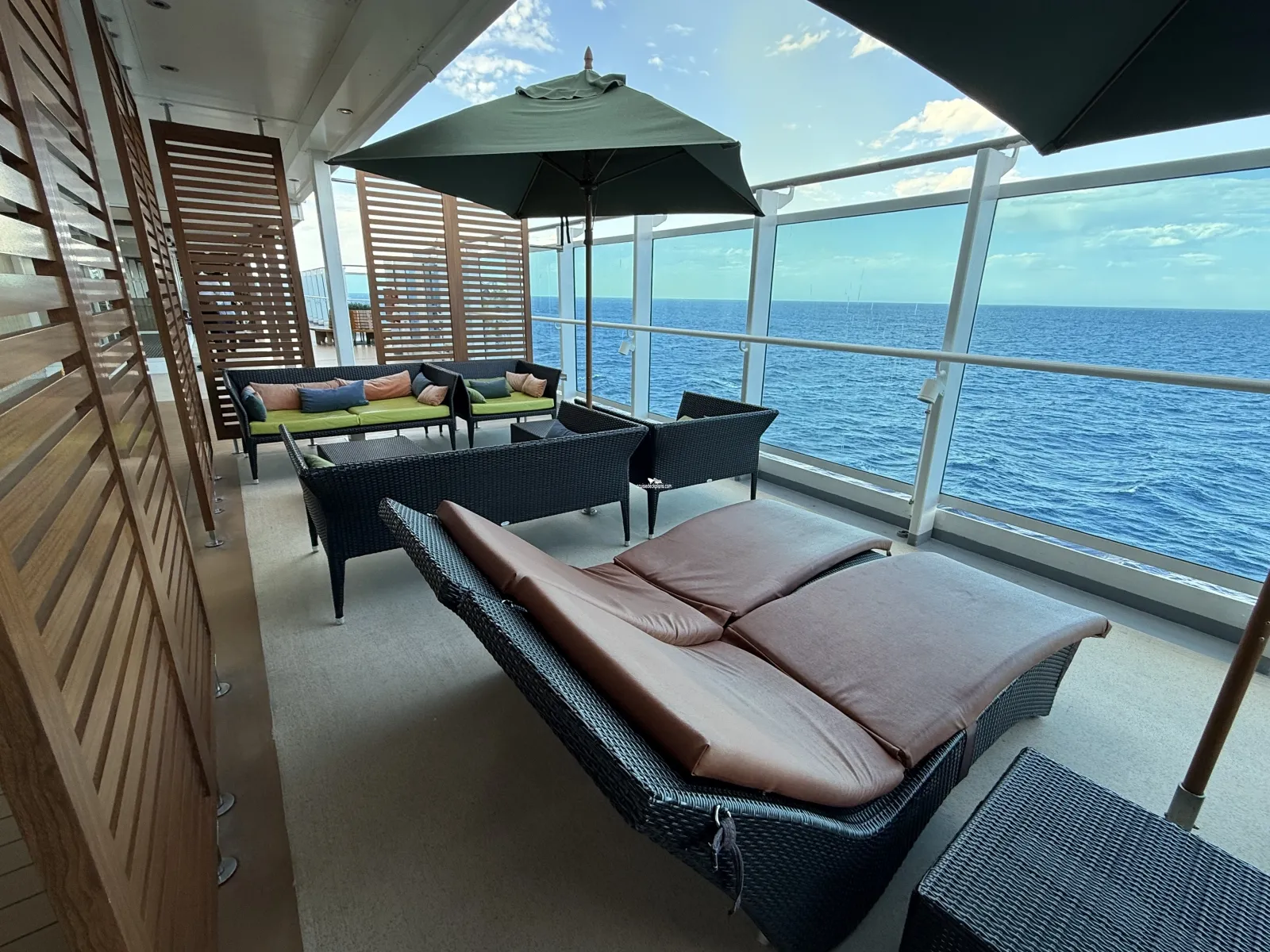 Exclusive use for guests occupying the Terrazza Carnevale staterooms A terraced deck featuring comfortable sofas, private alcoves and Hot Tub Spas (2) At night, a chic rooftop bar under the stars with live music. Beverage Service ($)Amari Bar