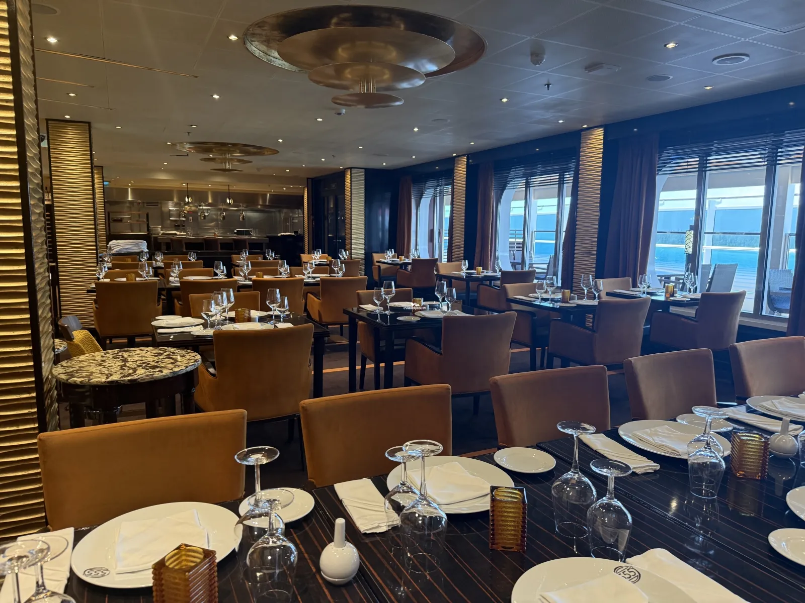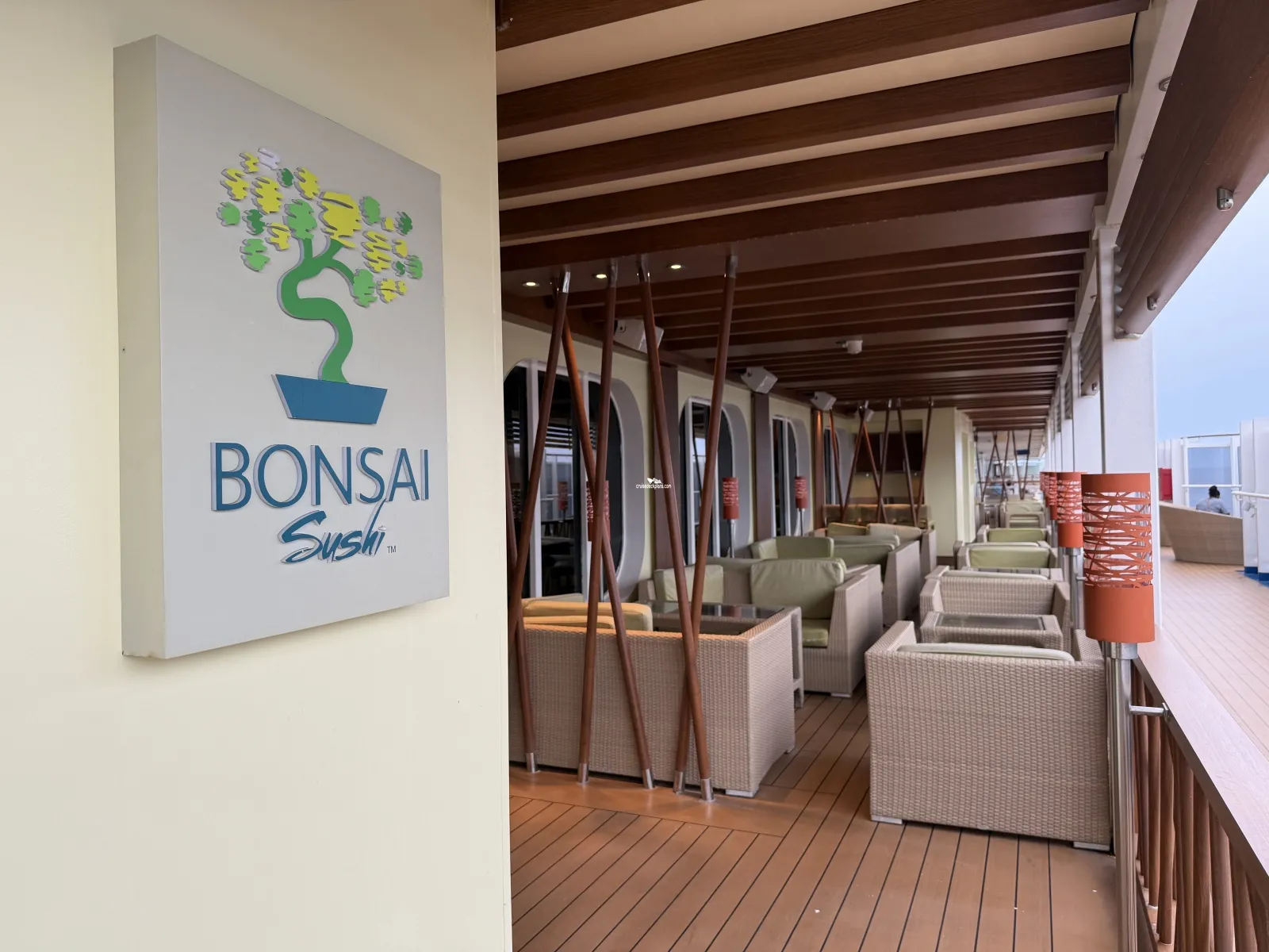 Guests can choose from a range of appetizers, soups and salads,sushi and sashimi, rolls, a bento box or a selection for two. Open for lunch on sea days from 12:00 to 2:30 p.m. Dinner is nightly from 5:00 p.m. All times are subject to change. Offers indoor and outdoor seating.Fahrenheit 555 Steakhouse
